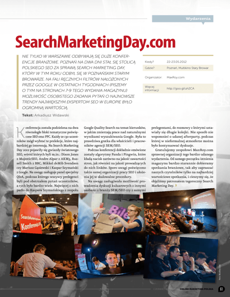Wydarzenia Nie tylko w Warszawie odbywają się duże konferencje branżowe. Poznań na dwa dni stał się stolicą polskiego SEO za sprawą Search Marketing Day, który w tym roku odbył się w poznańskim Starym Browarze. Na fali ręcznych filtrów nałożonych przez Google w ostatnich tygodniach (piszemy o tym na stronach 7-9 tego wydania magazynu) możliwość osobistego zadania pytań o najnowsze trendy największym ekspertom SEO w Europie było ogromną wartością. Kiedy? 22-23.05.2012 Gdzie? Poznań, Multikino Stary Browar Organizator: MaxRoy.com Więcej informacji http://goo.gl/uh2CA Tekst: Arkadiusz Widawski Google Quality Search na temat kierunków, w jakim zmierzają prace nad naturalnymi wynikami wyszukiwania Google. Była to prawdziwa gratka dla właścicieli i pracowników agencji SEM/SEO. Podczas konferencji dokładnie omówione zostały algorytmy Panda i Pingwin, które kładą nacisk zarówno na jakość zawartości stron, jak również na jakość prowadzących do nich linków. Sporo uwagi poświęcono także samej organizacji pracy SEO i ułożenia jej w skalowalne procedury. Na uwagę zasługiwała możliwość prowadzenia dyskusji kuluarowych z innymi osobami z branży SEM/SEO czy z samymi prelegentami, do rozmowy z którymi ustawiały się długie kolejki. Nie sposób nie wspomnieć o udanej afterparty, podczas której w nieformalnej atmosferze można było kontynuować dyskusje. Gratulujemy zespołowi MaxRoy.com sprawnej organizacji tego bardzo udanego wydarzenia. Od samego początku istnienia magazynu bardzo starannie dobieramy spotkania branżowe, tak aby zapraszać naszych czytelników tylko na najbardziej wartościowe spotkania, i cieszymy się, że objęliśmy patronatem tegoroczny Search Marketing Day. Foto: MaxRoy.com K onferencja została podzielona na dwa równoległe bloki tematyczne poświęcone SEO oraz PPC. Każdy ze 130 uczestników mógł wybrać te prelekcje, które najbardziej go interesują. Na Search Marketing Day 2012 pojawiły się gwiazdy światowego SEO, wśród których byli m.in.: Dixon Jones z MajesticSEO, Andre Alpar z AKM3, Russell Smith z BBC, Mikkel deMib Svendsen czy Mariusz Gąsiewski i Kaspar Szymański z Google. Na uwagę zasługuje panel specjalny Q&A, podczas którego wszyscy prelegenci byli pod obstrzałem pytań uczestników, a tych było bardzo wiele. Najwięcej z nich padło do Kaspara Szymańskiego z zespołu czerwiec-lipiec 2012 Online Marketing Polska 61