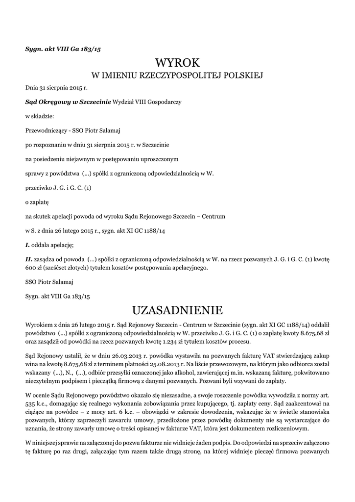 Sygn. akt VIII Ga 183/15 WYROK W IMIENIU RZECZYPOSPOLITEJ POLSKIEJ Dnia 31 sierpnia 2015 r. Sąd Okręgowy w Szczecinie Wydział VIII Gospodarczy w składzie: Przewodniczący - SSO Piotr Sałamaj po rozpoznaniu w dniu 31 sierpnia 2015 r. w Szczecinie na posiedzeniu niejawnym w postępowaniu uproszczonym sprawy z powództwa (...) spółki z ograniczoną odpowiedzialnością w W. przeciwko J. G. i G. C. (1) o zapłatę na skutek apelacji powoda od wyroku Sądu Rejonowego Szczecin – Centrum w S. z dnia 26 lutego 2015 r., sygn. akt XI GC 1188/14 I. oddala apelację; II. zasądza od powoda (...) spółki z ograniczoną odpowiedzialnością w W. na rzecz pozwanych J. G. i G. C. (1) kwotę 600 zł (sześćset złotych) tytułem kosztów postępowania apelacyjnego. SSO Piotr Sałamaj Sygn. akt VIII Ga 183/15 UZASADNIENIE Wyrokiem z dnia 26 lutego 2015 r. Sąd Rejonowy Szczecin - Centrum w Szczecinie (sygn. akt XI GC 1188/14) oddalił powództwo (...) spółki z ograniczoną odpowiedzialnością w W. przeciwko J. G. i G. C. (1) o zapłatę kwoty 8.675,68 zł oraz zasądził od powódki na rzecz pozwanych kwotę 1.234 zł tytułem kosztów procesu. Sąd Rejonowy ustalił, że w dniu 26.03.2013 r. powódka wystawiła na pozwanych fakturę VAT stwierdzającą zakup wina na kwotę 8.675,68 zł z terminem płatności 25.08.2013 r. Na liście przewozowym, na którym jako odbiorca został wskazany (...), N., (...), odbiór przesyłki oznaczonej jako alkohol, zawierającej m.in. wskazaną fakturę, pokwitowano nieczytelnym podpisem i pieczątką firmową z danymi pozwanych. Pozwani byli wzywani do zapłaty. W ocenie Sądu Rejonowego powództwo okazało się niezasadne, a swoje roszczenie powódka wywodziła z normy art. 535 k.c., domagając się realnego wykonania zobowiązania przez kupującego, tj. zapłaty ceny. Sąd zaakcentował na ciążące na powódce – z mocy art. 6 k.c. – obowiązki w zakresie dowodzenia, wskazując że w świetle stanowiska pozwanych, którzy zaprzeczyli zawarciu umowy, przedłożone przez powódkę dokumenty nie są wystarczające do uznania, że strony zawarły umowę o treści opisanej w fakturze VAT, która jest dokumentem rozliczeniowym. W niniejszej sprawie na załączonej do pozwu fakturze nie widnieje żaden podpis. Do odpowiedzi na sprzeciw załączono tę fakturę po raz drugi, załączając tym razem także drugą stronę, na której widnieje pieczęć firmowa pozwanych i nieczytelny podpis, jednak z uwagi na brak tej drugiej strony przy pierwotnie załączonej kopii oraz bardzo dużą nieczytelność, nie sposób uznać, że jest to faktycznie druga strona faktury nr (...), z kolei list przewozowy potwierdza wprawdzie odbiór alkoholu przez osobę posługującą się pieczęcią firmowa pozwanych, co pozwala zakładać, że jakaś umowa w tej kwestii została przez strony zawarta, jednak nie można z tego faktu wywieść bez wątpliwości, że odbiór dotyczył asortymentu opisanego w fakturze i strony złożyły zgodne oświadczenia co do cen wskazanych w fakturze. Sąd I instancji podkreślił, że powódka otrzymała sprzeciw wraz z zobowiązaniem do ustosunkowania się do jego treści i zgłoszenia dowodów istotnych dla rozstrzygnięcia, lecz w odpowiedzi, poza kwestionowaniem stanowiska pozwanych, nie zgłoszono żadnych wniosków dowodowych, które mogłyby doprowadzić do uznania, że strony zawarły umowę sprzedaży towarów wskazanych w przedmiotowej fakturze i na opisane tam ceny. Z tych względów strona powodowa ponosi konsekwencje niedostatecznego udowodnienia swoich żądań, które zostały oddalone. Wyrok powyższy zaskarżyła w całości powódka wnosząc o jego zmianę i uwzględnienie powództwa w całości oraz zasądzenie od pozwanego na rzecz powoda kosztów procesu i kosztów zastępstwa procesowego. Zaskarżonemu wyrokowi powódka zarzuciła błąd w ustaleniach faktycznych mający wpływ na orzeczenie, wynikający z naruszenia art. 233 § 1 k.p.c. przez uchybienie obowiązkowi wszechstronnego rozważenia zebranego materiału dowodowego, co skutkowało chybionym przyjęciem, iż strony nie zawarły umowy sprzedaży towarów wskazanych w fakturze (...) za opisane tam ceny. W odpowiedzi na apelację pozwani wnieśli o jej oddalenie i zasądzenie od powódki na rzecz pozwanych kosztów postępowania apelacyjnego. Sąd Okręgowy zważył, co następuje: Apelacja okazała się bezzasadna. Sąd Okręgowy jako sąd meriti w granicach wniesionej apelacji, co wynika z dyspozycji art. 378 § 1 k.p.c., rozważa na nowo zebrany w sprawie materiał dowodowy, w tym dokonuje jego samodzielnej oceny prawnej. Powyższa analiza pozwala stwierdzić, że Sąd Rejonowy w sposób prawidłowy zgromadził materiał dowodowy, a następnie w oparciu o tenże materiał poczynił właściwe ustalenia faktyczne dokonując oceny prawnej, którą Sąd Okręgowy w całości podziela. Zarzuty oraz ich argumentacja zaprezentowane w apelacji nie stanowiły wystarczającej podstawy do weryfikacji orzeczenia Sądu Rejonowego w postulowanym przez apelującego kierunku, nie znalazły one bowiem potwierdzenia w zgromadzonym w aktach sprawy materiale procesowym. Apelacja sprowadza się do kwestionowania dokonanej przez Sąd pierwszej instancji oceny dowodów, która jakoby błędnie doprowadziła do ustalenia, że strony nie zawarły umowy sprzedaży towarów opisanych w fakturze załączonej do pozwu i za ceny w niej wskazane. Odnosząc się do tak sformułowanego zarzutu Sąd odwoławczy stwierdza, że żaden z przywołanych przez skarżącego argumentów nie jest wystarczający do przyjęcia, że strony niniejszego sporu zawarły umowę kupna-sprzedaży na warunkach opisanych w fakturze VAT (...). Za gołosłowne uznać bowiem należy twierdzenia apelacji, że „bez wątpliwości jest to druga strona załączonego dokumentu w postaci faktury VAT (...)”. Dla uznania tego faktu za niewątpliwy koniecznym byłoby co najmniej przedłożenie oryginału spornej faktury, tz