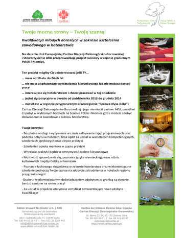 Twoje mocne strony – Twoją szansą Kwalifikacja młodych dorosłych w zakresie kształcenia zawodowego w hotelarstwie Na zlecenie Unii Europejskiej Caritas Diecezji Zielonogórsko-Gorzowskiej i Stowarzyszenie AKU przeprowadzają projekt sieciowy w rejonie granicznym Polski i Niemiec. Ten projekt mógłby Cię zainteresowad jeśli TY... … masz od 18-stu do 24-ch lat … nie masz ukooczonego wykształcenia kierunkowego lub nie możesz dostad pracy … interesujesz się hotelarstwem i chcesz pracowad w tej dziedzinie … jesteś dyspozycyjny w okresie od października 2013 do grudnia 2014 … mieszkasz w regionie przygranicznym (Euroregionie "Sprewa-Nysa-Bóbr") Caritas Diecezji Zielonogórsko-Gorzowskiej i jego niemiecki partner AKU, umożliwi Ci pobyt w wybranych hotelach na terenie Polski i Niemiec gdzie możesz zdobyd doświadczenie zawodowe z zakresu hotelarstwa. Twoje korzyści: - Bezpłatne noclegi i wyżywienie w czasie odbywania zajęd programowych oraz podczas pobytu w hotelach; brak opłat za udział w warsztatach kompetencyjnych, szkoleniach językowych oraz obycie praktyki - Szkolenie i opieka mentora w czasie praktyki - W trakcie praktyki będziesz otrzymywad drobne kieszonkowe - Możliwośd sprawdzenia się, poznania języka niemieckiego oraz różnic kulturowych między Polską a Niemcami - Poznanie fachowego słownictwa w zakresie hotelarstwa oraz wielomiesięczne szkolenie podnoszą Twoje szanse na zdobycie zatrudnienia w hotelach regionu przygranicznego! -Osoby z wielomiesięcznym doświadczeniem zdobytym za granicą są obecnie bardzo cenione na rynku pracy! - Za udział w projekcie otrzymasz certyfikat potwierdzający nowo zdobyte kwalifikacje Aktion Umwelt für Kinder e.V. | AKU Caritas der Diözese Zielona Góra-Gorzów Gemeinnützig und als besonders förderungswürdig anerkannt Caritas Diecezji Zielonogórsko-Gorzowskiej AKU | Gotlandstraße 5 | 10439 Berlin Tel: 030 44 65 05 40 | Fax: 032 22 1264 442 [email protected] www.aktion-umwelt-fuer-kinder.de Ul. Bema 32-34, 65-170 Zielona Góra Tel. 68 415-20-01 | fax. 68 411-02-97 [email protected] http://www.caritas.zgora.pl/ Przebieg: Etap 1 (październik - listopad 2013): poznanie twoich mocnych stron podczas kursu Outdoor. Pierwszy krok jest zawsze najważniejszy. W czasie tego kursu podejmiesz się wyzwao wraz z innymi uczestni(cz)kami. Chcemy poznad twoje mocne strony i kompetencje i opracowad razem z tobą tzw. osobisty profil twoich mocnych stron. Ten profil (w formie certyfikatu) może okazad się w przyszłości pomocny przy ubieganiu się o pracę. Po zakwalifikowaniu się w fazie pierwszej przejdziesz, jako jeden/ jedna z 24-ech uczestników/ uczestniczek, do drugiego i trzeciego etapu. Etap 2 (listopad – grudzień 2013): pełne przeżyć szkolenie językowe i zawodowe Jeśli przeszedłes/ przeszłaś przez pierwszy etap i nadal chcesz uczestniczyd w drugim i trzecim etapie, weźmiesz udział w dwutygodniowym kursie językowym oraz w tygodniowym zawodowym szkoleniu z zasad bezpieczeostwa i higieny pracy. Te szkolenia przygotują cię do trzeciego etapu. Etap 3 (styczeń 2014 – grudzień 2014): Praktyki w hotelach w Polsce i w Niemczech W czasie dwunastomiesięcznej praktyki (włącznie z czasem urlopu) będziesz mógł / mogła w parze z drugą osobą wypróbowad Twoje mocne strony i Twoją motywację. Z pomocą fachowców wypróbujesz różne stanowiska w hotelu – od recepcji, przez kuchnię do serwisu pokojowego. Jeśli projekt wzbudził Twoje zainteresowanie, szczegółowe informacje otrzymasz pod podanym numerem telefonu lub adresem e-mail. Tel. +48 691 186 232 Email: [email protected] Osoba do kontaktu: Krystian Kaczor Partnerzy projektu: Aktion Umwelt für Kinder e.V. | AKU Partnerzy w hotelarstwie: Waldhotel Cottbus | Radisson Hotel Cottbus | Lindner Congress Hotel Cottbus | Sorat Hotel Cottbus | Kierownik Hotelu Bukowy Dworek | Kierownik Hotelu Texicana | Kierownik Hotelu Leśnego | Kierownik Hotelu Śródmiejskiego | Kierownik Hotelu Tanzanit Pokonywać granice poprzez wspólne inwestowanie w przyszłość Projekt współfinansowany ze środków Unii Europejskiej (Europejski Fundusz Rozwoju Regionalnego) w ramach Programu Operacyjnego Współpracy Transgranicznej Polska (Województwo Lubuskie) – Brandenburgia 2007-2013 Aktion Umwelt für Kinder e.V. | AKU Caritas der Diözese Zielona Góra-Gorzów Gemeinnützig und als besonders förderungswürdig anerkannt Caritas Diecezji Zielonogórsko-Gorzowskiej AKU | Gotlandstraße 5 | 10439 Berlin Tel: 030 44 65 05 40 | Fax: 032 22 1264 442 [email protected] www.aktion-umwelt-fuer-kinder.de Ul. Bema 32-34, 65-170 Zielona Góra Tel. 68 415-20-01 | fax. 68 411-02-97 [email protected] http://www.caritas.zgora.pl/