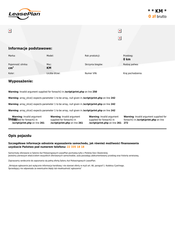 * * KM * 0 zł brutto Informacje podstawowe: Marka: Model: Rok produkcji: Przebieg: 0 km Pojemność silnika: Moc: cm3 KM Kolor: Liczba drzwi: Skrzynia biegów: Rodzaj paliwa: Numer VIN: Kraj pochodzenia: Wyposażenie: Warning: Invalid argument supplied for foreach() in /script/print.php on line 250 Warning: array_slice() expects parameter 1 to be array, null given in /script/print.php on line 242 Warning: array_slice() expects parameter 1 to be array, null given in /script/print.php on line 242 Warning: array_slice() expects parameter 1 to be array, null given in /script/print.php on line 242 Warning: Invalid argument Inne: supplied for foreach() in /script/print.php on line 261 Warning: Invalid argument supplied for foreach() in /script/print.php on line 261 Warning: Invalid argument supplied for foreach() in /script/print.php on line 261 Warning: Invalid argument supplied for foreach() in /script/print.php on line 272 Opis pojazdu Szczegółowe informacje odnośnie wyposażenia samochodu, jak również możliwości finansowania uzyskacie Państwo pod numerem telefonu: 22 335 18 18 Samochody oferowane w Salonie Aut Poleasingowych LeasePlan pochodzą tylko z Polskiej Sieci Dealerskiej. Jesteśmy pierwszym właścicielem wszystkich oferowanych samochodów, auta posiadają udokumentowany przebieg oraz historię serwisową. Zapraszamy serdecznie do zapoznania się pełną ofertą Salonu Aut Poleasingowych LeasePlan. „Niniejsze ogłoszenie jest wyłącznie informacja handlową i nie stanowi oferty w myśl art. 66, paragraf 1. Kodeksu Cywilnego. Sprzedający nie odpowiada za ewentualne błędy lub nieaktualność ogłoszenia” * * KM * 0 zł brutto Warning: Invalid argument supplied for foreach() in /script/print.php on line 308