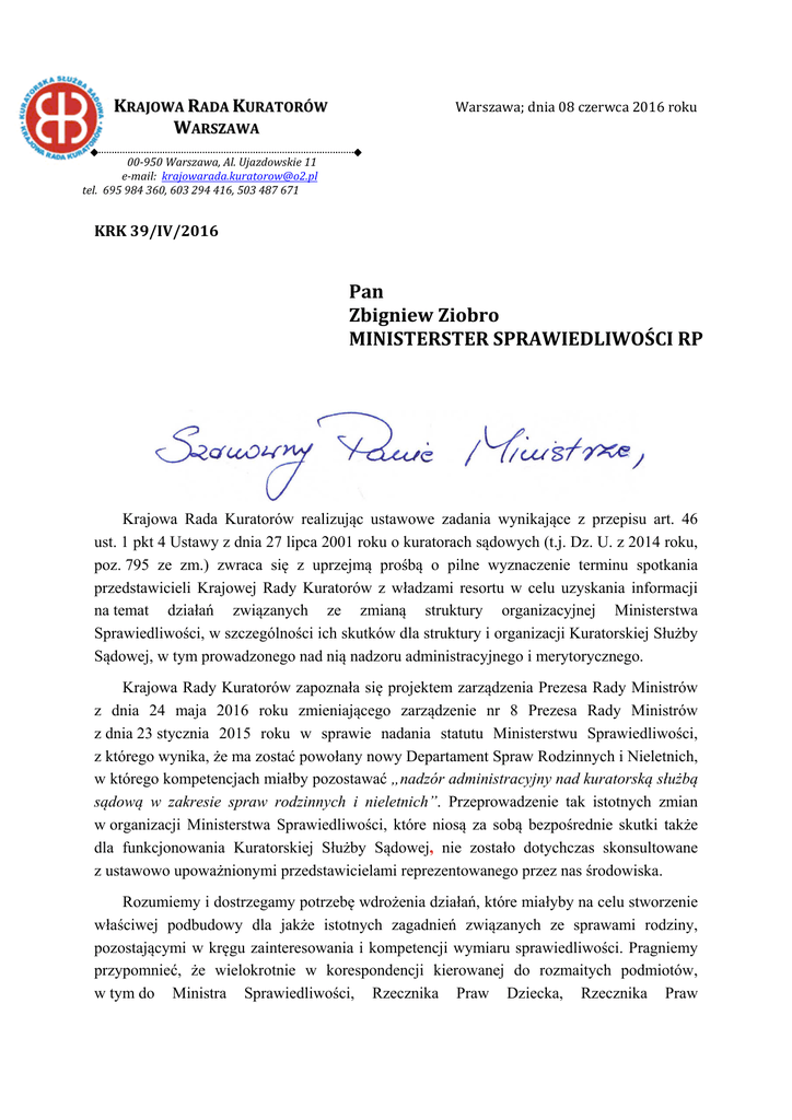 KRAJOWA RADA KURATORÓW WARSZAWA Warszawa; dnia 08 czerwca 2016 roku 00-950 Warszawa, Al. Ujazdowskie 11 e-mail: [email protected] tel. 695 984 360, 603 294 416, 503 487 671 KRK 39/IV/2016 Pan Zbigniew Ziobro MINISTERSTER SPRAWIEDLIWOŚCI RP Krajowa Rada Kuratorów realizując ustawowe zadania wynikające z przepisu art. 46 ust. 1 pkt 4 Ustawy z dnia 27 lipca 2001 roku o kuratorach sądowych (t.j. Dz. U. z 2014 roku, poz. 795 ze zm.) zwraca się z uprzejmą prośbą o pilne wyznaczenie terminu spotkania przedstawicieli Krajowej Rady Kuratorów z władzami resortu w celu uzyskania informacji na temat działań związanych ze zmianą struktury organizacyjnej Ministerstwa Sprawiedliwości, w szczególności ich skutków dla struktury i organizacji Kuratorskiej Służby Sądowej, w tym prowadzonego nad nią nadzoru administracyjnego i merytorycznego. Krajowa Rady Kuratorów zapoznała się projektem zarządzenia Prezesa Rady Ministrów z dnia 24 maja 2016 roku zmieniającego zarządzenie nr 8 Prezesa Rady Ministrów z dnia 23 stycznia 2015 roku w sprawie nadania statutu Ministerstwu Sprawiedliwości, z którego wynika, że ma zostać powołany nowy Departament Spraw Rodzinnych i Nieletnich, w którego kompetencjach miałby pozostawać „nadzór administracyjny nad kuratorską służbą sądową w zakresie spraw rodzinnych i nieletnich”. Przeprowadzenie tak istotnych zmian w organizacji Ministerstwa Sprawiedliwości, które niosą za sobą bezpośrednie skutki także dla funkcjonowania Kuratorskiej Służby Sądowej, nie zostało dotychczas skonsultowane z ustawowo upoważnionymi przedstawicielami reprezentowanego przez nas środowiska. Rozumiemy i dostrzegamy potrzebę wdrożenia działań, które miałyby na celu stworzenie właściwej podbudowy dla jakże istotnych zagadnień związanych ze sprawami rodziny, pozostającymi w kręgu zainteresowania i kompetencji wymiaru sprawiedliwości. Pragniemy przypomnieć, że wielokrotnie w korespondencji kierowanej do rozmaitych podmiotów, w tym do Ministra Sprawiedliwości, Rzecznika Praw Dziecka, Rzecznika Praw Obywatelskich, postulowaliśmy potrzebę ustawowego, kodeksowego uregulowania całokształtu spraw pozostających w gestii Zespołów Kuratorskiej Służby Sądowej wykonujących orzeczenia w sprawach rodzinnych i nieletnich, a także nadania kuratorowi rodzinnemu rangi organu postępowania wykonawczego adekwatnej do ważności spoczywających na nim zadań. Zagadnienie to przedstawialiśmy również podczas posiedzeń komisji sejmowych i senackich, tak poprzednich i obecnej kadencji. Natomiast wprowadzenie projektowanych zmian spowoduje komplikacje w funkcjonowaniu Kuratorskiej Służby Sądowej poprzez rozdzielenie na różne departamenty odpowiedzialności za prowadzenie całokształtu spraw jej dotyczących. Będzie to miało zatem przełożenie na decyzje w sprawach służby dotyczące sekretariatów i obsługi biurowej, przeniesienia na wyższy stopień służbowy, bezpieczeństwa pracy, decyzje personalne w przypadku wystąpienia dysproporcji w obciążeniu pomiędzy poszczególnymi specjalizacjami, które wymagały będą porozumienia pomiędzy dyrektorami dwóch, odrębnych departamentów. Docelowo, może oznaczać to powrót do sytuacji sprzed wejścia w życie Ustawy z dnia 27 lipca 2001 roku o kuratorach sądowych (t.j. Dz. U. z 2014 roku, poz. 795), gdzie względy praktyczne wymuszały również odrębność zarządzania każdą ze specjalizacji na poziomie okręgu, a tym samym zwiększenie liczby stanowisk funkcyjnych (przed rokiem 2001 w większości okręgów działało równolegle dwóch kuratorów wojewódzkich, którzy niezależnie od siebie odpowiadali za funkcjonowanie kuratorskiej służby sądowej w okręgu). Proponowana zmiana organizacyjna nie sprzyja również stworzeniu jednolitych standardów dla polityki kadrowej, awansowej, czy też logistycznej w zakresie zarządzania służbą na poziomie okręgu. Wymusi to również podział zespołów łączonych, dotychczas funkcjonujących w mniejszych sądach, w których obowiązki pełnią zarówno kuratorzy wykonujący orzeczenia w sprawach rodzinnych i nieletnich, jak i sprawach karnych. Poza tym, w naszej ocenie, zakres projektowanych zadań, które miałyby wchodzić w kompetencje nowo powołanego departamentu wprowadza dualizm w części dotyczącej nadzoru nad wykonywaniem niektórych zadań podejmowanych przez kuratorów sądowych wykonujących orzeczenia w sprawach karnych. Dotyczył on będzie przede wszystkim postępowań karnych z kategorii przestępstw przeciwko rodzinie i opiece, gdyż kategoria ta w całości mieści się w kompetencji „nadzoru administracyjnego nad kuratorską służbą sądową w zakresie spraw rodzinnych i nieletnich” (vide pkt. 2 ust 1 pkt. b uzasadnienia projektu). W sytuacji, w której kuratorzy sądowi wykonujący orzeczenia w sprawach karnych będą podlegali kilku równorzędnym, niezależnym od siebie ośrodkom kontroli może prowadzić to do formułowania przez nie zróżnicowanych, niewykluczone że czasem sprzecznych i wzajemnie wykluczających się zaleceń. Może to skutkować narastaniem utrudnień w wykonywaniu orzeczeń i pośrednio negatywnie wpłynąć na wizerunek wymiaru sprawiedliwości. W naszej ocenie sposobem na uniknięcie komplikacji spowodowanych utworzeniem nowego departamentu i przeniesieniem do jego kompetencji nadzoru nad częścią zadań wykonywanych przez Kuratorską Służbę Sądową byłoby stworzenie struktury organizacyjnej Ministerstwa Sprawiedliwości, która łączyłaby w sobie przedstawioną w omawianym projekcie potrzebę wzmocnienia spraw rodziny z zachowaniem modelu kurateli sądowej obowiązującego w Polsce po wdrożeniu rozwiązań zawartych w Ustawie z dnia 27 lipca 2001 roku o kuratorach sądowych (t.j. Dz. U. z 2014 roku, poz. 795). Zdaniem Krajowej Rady Kuratorów wprowadzenie projektowanych rozwiązań ten sprawdzony i ugruntowany model funkcjonowania kurateli i zarządzania n