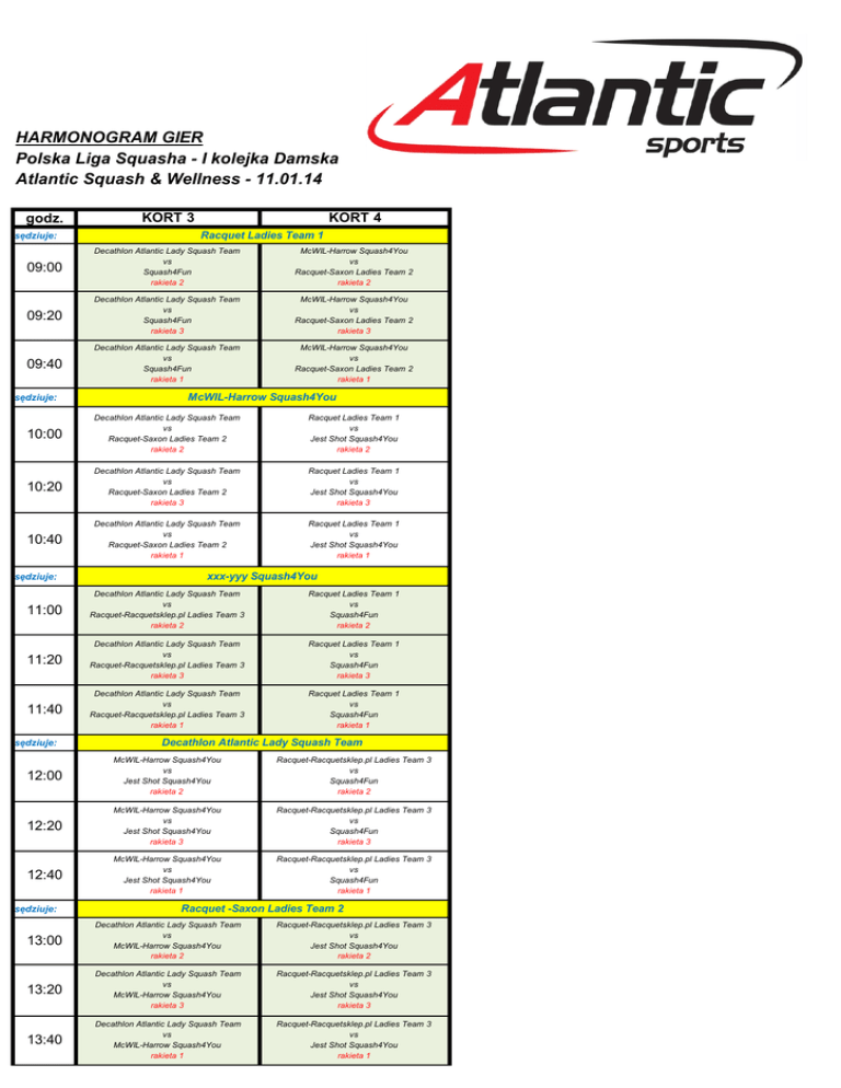 HARMONOGRAM GIER Polska Liga Squasha - I kolejka Damska Atlantic Squash & Wellness - 11.01.14 godz. sędziuje: KORT 3 KORT 4 Racquet Ladies Team 1 09:00 Decathlon Atlantic Lady Squash Team vs Squash4Fun rakieta 2 McWIL-Harrow Squash4You vs Racquet-Saxon Ladies Team 2 rakieta 2 09:20 Decathlon Atlantic Lady Squash Team vs Squash4Fun rakieta 3 McWIL-Harrow Squash4You vs Racquet-Saxon Ladies Team 2 rakieta 3 09:40 Decathlon Atlantic Lady Squash Team vs Squash4Fun rakieta 1 McWIL-Harrow Squash4You vs Racquet-Saxon Ladies Team 2 rakieta 1 sędziuje: McWIL-Harrow Squash4You 10:00 Decathlon Atlantic Lady Squash Team vs Racquet-Saxon Ladies Team 2 rakieta 2 Racquet Ladies Team 1 vs Jest Shot Squash4You rakieta 2 10:20 Decathlon Atlantic Lady Squash Team vs Racquet-Saxon Ladies Team 2 rakieta 3 Racquet Ladies Team 1 vs Jest Shot Squash4You rakieta 3 10:40 Decathlon Atlantic Lady Squash Team vs Racquet-Saxon Ladies Team 2 rakieta 1 Racquet Ladies Team 1 vs Jest Shot Squash4You rakieta 1 sędziuje: xxx-yyy Squash4You 11:00 Decathlon Atlantic Lady Squash Team vs Racquet-Racquetsklep.pl Ladies Team 3 rakieta 2 Racquet Ladies Team 1 vs Squash4Fun rakieta 2 11:20 Decathlon Atlantic Lady Squash Team vs Racquet-Racquetsklep.pl Ladies Team 3 rakieta 3 Racquet Ladies Team 1 vs Squash4Fun rakieta 3 11:40 Decathlon Atlantic Lady Squash Team vs Racquet-Racquetsklep.pl Ladies Team 3 rakieta 1 Racquet Ladies Team 1 vs Squash4Fun rakieta 1 sędziuje: Decathlon Atlantic Lady Squash Team 12:00 McWIL-Harrow Squash4You vs Jest Shot Squash4You rakieta 2 Racquet-Racquetsklep.pl Ladies Team 3 vs Squash4Fun rakieta 2 12:20 McWIL-Harrow Squash4You vs Jest Shot Squash4You rakieta 3 Racquet-Racquetsklep.pl Ladies Team 3 vs Squash4Fun rakieta 3 12:40 McWIL-Harrow Squash4You vs Jest Shot Squash4You rakieta 1 Racquet-Racquetsklep.pl Ladies Team 3 vs Squash4Fun rakieta 1 sędziuje: Racquet -Saxon Ladies Team 2 13:00 Decathlon Atlantic Lady Squash Team vs McWIL-Harrow Squash4You rakieta 2 Racquet-Racquetsklep.pl Ladies Team 3 vs Jest Shot Squash4You rakieta 2 13:20 Decathlon Atlantic Lady Squash Team vs McWIL-Harrow Squash4You rakieta 3 Racquet-Racquetsklep.pl Ladies Team 3 vs Jest Shot Squash4You rakieta 3 13:40 Decathlon Atlantic Lady Squash Team vs McWIL-Harrow Squash4You rakieta 1 Racquet-Racquetsklep.pl Ladies Team 3 vs Jest Shot Squash4You rakieta 1 Squash4Fun sędziuje: 14:00 McWIL-Harrow Squash4You vs Racquet-Racquetsklep.pl Ladies Team 3 rakieta 2 Racquet-Saxon Ladies Team 2 vs Jest Shot Squash4You rakieta 2 14:20 McWIL-Harrow Squash4You vs Racquet-Racquetsklep.pl Ladies Team 3 rakieta 3 Racquet-Saxon Ladies Team 2 vs Jest Shot Squash4You rakieta 3 14:40 McWIL-Harrow Squash4You vs Racquet-Racquetsklep.pl Ladies Team 3 rakieta 1 Racquet-Saxon Ladies Team 2 vs Jest Shot Squash4You rakieta 1 sędziuje: Racquet-Racquetsklep.pl Ladies Team 3 15:00 Racquet Ladies Team 1 vs Racquet-Saxon Ladies Team 2 rakieta 2 McWIL-Harrow Squash4You vs Squash4Fun rakieta 2 15:20 Racquet Ladies Team 1 vs Racquet-Saxon Ladies Team 2 rakieta 3 McWIL-Harrow Squash4You vs Squash4Fun rakieta 3 15:40 Racquet Ladies Team 1 vs Racquet-Saxon Ladies Team 2 rakieta 1 McWIL-Harrow Squash4You vs Squash4Fun rakieta 1