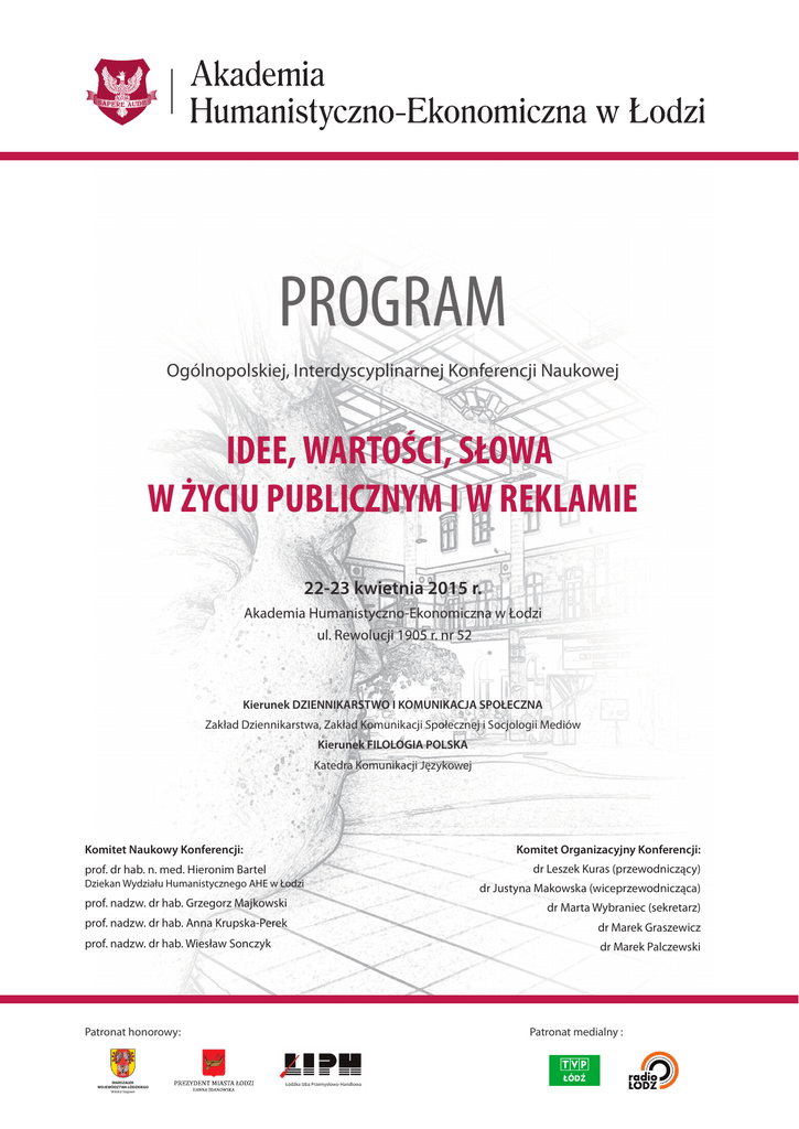 PROGRAM Ogólnopolskiej, Interdyscyplinarnej Konferencji Naukowej IDEE, WARTOŚCI, SŁOWA W ŻYCIU PUBLICZNYM I W REKLAMIE 22-23 kwietnia 2015 r. Akademia Humanistyczno-Ekonomiczna w Łodzi ul. Rewolucji 1905 r. nr 52 Kierunek DZIENNIKARSTWO I KOMUNIKACJA SPOŁECZNA Zakład Dziennikarstwa, Zakład Komunikacji Społecznej i Socjologii Mediów Kierunek FILOLOGIA POLSKA Katedra Komunikacji Językowej Komitet Naukowy Konferencji: Komitet Organizacyjny Konferencji: dr Leszek Kuras (przewodniczący) prof. dr hab. n. med. Hieronim Bartel Dziekan Wydziału Humanistycznego AHE w Łodzi dr Justyna Makowska (wiceprzewodnicząca) prof. nadzw. dr hab. Grzegorz Majkowski dr Marta Wybraniec (sekretarz) prof. nadzw. dr hab. Anna Krupska-Perek dr Marek Graszewicz prof. nadzw. dr hab. Wiesław Sonczyk dr Marek Palczewski Patronat medialny : Patronat honorowy: MARSZAŁEK WOJEWÓDZTWA ŁÓDZKIEGO Witold Stępień Łódźka Izba Przemysłowo-Handlowa 22 kwietnia 9.30 – 10.00 REJESTRACJA UCZESTNIKÓW Patio 10.00 – 10.15 OTWARCIE KONFERENCJI prof. dr hab. inż. Andrzej Lech Koszmider – Rektor AHE w Łodzi, WYSTĄPIENIA ZAPROSZONYCH GOŚCI Sala H 116 SESJA PLENARNA (prowadzący dr. Leszek Kuras) Sala H 116 10.15 – 10.30 Monolog i pseudodialogi medialne prof. Jerzy Jastrzębski, Akademia Humanistyczno-Ekonomiczna w Łodzi, Uniwersytet Wrocławski 10.30 – 10.45 Newsroom – czyli telewizja o wartościach w telewizji prof. Arkadiusz Lewicki, Uniwersytet Wrocławski 10.45 – 11.00 Mapy, fotografie i miejsca – o turystyce sieciowej dr Małgorzata Czapiga, Uniwersytet Wrocławski 11.00 – 11.15 Słuchowisko radiowe dawniej i dziś. Prolegomena do przyszłej syntezy mgr Anna Maćkowiak, Uniwersytet Łódzki 11.15 – 11.30 Głos jako narzędzie komunikacji w mediach mgr Agnieszka Kurowska-Janecka, Uniwersytet Muzyczny Fryderyka Chopina w Warszawie 11.30 – 11.45 DYSKUSJA 11.45 – 12.15 PRZERWA KAWOWA SESJA PLENARNA (prowadzący prof. dr hab. Jerzy Jastrzębski) Sala H 116 12.15 – 12.30 Znaczenie języka w wyrażaniu idei i wartości prof. Grzegorz Majkowski, Akademia Humanistyczno-Ekonomiczna w Łodzi 12.30 – 12.45 Idee i wartości we współczesnym dyskursie politycznym prof. Aneta Majkowska, Wyższa Szkoła Menedżerska w Warszawie 12.45 – 13.00 „Casualowy total look”, czyli anglicyzmy w polskich blogach modowych dr Anna Bielska, Akademia Humanistyczno-Ekonomiczna w Łodzi 13.00 – 13.15 Frazeologizmy w polskich i niemieckich reklamach prasowych. Formy, funkcje, modyfikacje dr Mariola Majnusz-Stadnik, Uniwersytet Opolski 13.15 – 13.30 Czasowniki performatywne a wypowiedzi konstatujące w librettach baletowych dr Marta Wybraniec, Akademia Humanistyczno-Ekonomiczna w Łodzi 13.30 – 13.45 Nazwy relacyjne ponowione w przestrzeni miejskiej Katowic mgr Anna Arciszewska, Akademia Humanistyczno-Ekonomiczna w Łodzi 13.45 – 14.00 DYSKUSJA 14.00 – 15.00 PRZERWA OBIADOWA SESJA PLENARNA – Panel poświęcony twórczości Prof. Kazimierza Świegockiego (prowadzący prof. dr hab. Grzegorz Majkowski) Sala H 116 15.00 – 15.15 Kazimierza Świegockiego dzieło znane i nieznane prof. Grzegorz Majkowski, Akademia Humanistyczno-Ekonomiczna w Łodzi 15.15 – 15.30 Kategoria „osobowości twórczej” w świetle liryki Kazimierza Świegockiego (na przykładzie poematu Morze utracone) prof. Robert Mielhorski, Uniwersytet Kazimierza Wielkiego w Bydgoszczy 15.30 – 15.45 Kazimierza Świegockiego tajemnice instnienia. Na podstawie poematu Bóg, Szatan, Człowiek i Równina. mgr Agnieszka Puta 15.45 – 16.00 Prezentacja twórczości Kazimierza Świegockiego 16.00 – 16.15 PRZERWA KAWOWA SESJA PLENARNA (prowadząca dr Justyna Makowska) Sala H 116 16.15 – 16.30 Wartościowanie i ocena fotografii dziennikarskiej prof. Kazimierz Wolny-Zmorzyński, Uniwersytet Warszawski 16.30 – 16.45 Przemoc interpretacji. Biografia przeciwnika politycznego jako przykład nieetycznych działań retorycznych na przykładzie tygodników opinii w latach 2013-2014 dr Paweł Kuciński, Uniwersytet Kardynała Stefana Wyszyńskiego w Warszawie 16.45 – 17.00 Współczesna leksyka wartościująca w czeskiej i polskiej publicystyce prasowej dr Irena Piskorzowa, Akademicki Instytut Karwina, Czechy 17.00 – 17.15 Jak badać współczesne nowe media? Krótka refleksja metodologiczna na temat analizy treści mgr Karolina Szczepaniak 17.15 – 17.30 Językowe środki przekonywania we współczesnej publicystyce prasowej (na przykładzie felietonów Sylwii Chutnik) mgr Katarzyna Dawidowicz, Akademia Humanistyczno-Ekonomiczna w Łodzi 17.30 – 17.45 DYSKUSJA 18.00 UROCZYSTA KOLACJA 23 kwietnia SESJA PLENARNA (prowadzący dr Marek Palczewski) Sala H 116 9.00 – 9.15 Dlaczego lubimy reklamę lub jej nie lubimy? dr Marek Graszewicz, Akademia Humanistyczno-Ekonomiczna w Łodzi, Uniwersytet Wrocławski 9.15 – 9.30 Praktyczne zastosowanie klasycznych teorii znaku na przykładzie spotów reklamowych ks. dr Rafał Leśniczak, Uniwersytet Kardynała Stefana Wyszyńskiego w Warszawie – Ośrodek Naukowo-Badawczy w Łodzi 9.30 – 9.45 Wartościowanie w katalogach reklamowych biur podróży dr Katarzyna Burska, Uniwersytet Łódzki 9.45 – 10.00 Język kolorów w działalności marketingowej banków dr Marika Świeszczak, Uniwersytet Łódzki 10.00 – 10.15 Nowe media vs. media tradycyjne w reklamie banków dr Krzysztof Świeszczak, Uniwersytet Łódzki 10.15 – 10.30 DYSKUSJA 10.30 – 10.45 PRZERWA KAWOWA SESJA PLENARNA (prowadząca dr Marta Wybraniec) Sala H 116 10.45 – 11.00 Grzeczność językowa w postach internautów na stronie Spotted: MPK Łódź dr Anna Fadecka, Akademia Humanistyczno-Ekonomiczna w Łodzi 11.00 – 11.15 O makdonaldyzacji i tabloidyzacji newsa dr Marek Palczewski, Akademia Humanistyczno-Ekonomiczna w Łodzi 11.15 – 11.30 O perswazyjnej funkcji tytułów tekstów zamieszczanych na portalu kozaczek.pl mgr Justyna Majchrowska, Uniwersytet Rzeszowski 11.30 – 11.45 Współczesne sposoby i formy komunikowani