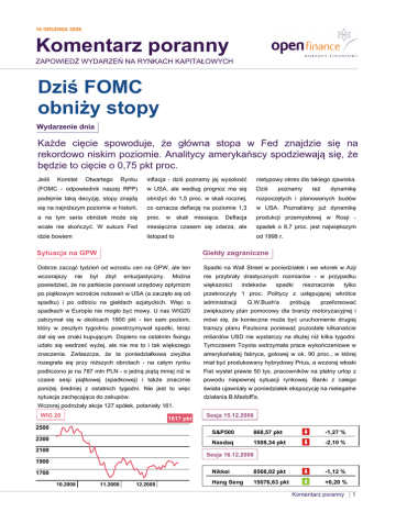 16 GRUDNIA 2008 Komentarz poranny ZAPOWIEDŹ WYDARZEŃ NA RYNKACH KAPITAŁOWYCH Dziś FOMC obniży stopy Wydarzenie dnia Każde cięcie spowoduje, że główna stopa w Fed znajdzie się na rekordowo niskim poziomie. Analitycy amerykańscy spodziewają się, że będzie to cięcie o 0,75 pkt proc. Jeśli Komitet Otwartego Rynku inflacja - dziś poznamy jej wysokość nietypowy okres dla takiego zjawiska. (FOMC - odpowiednik naszej RPP) w USA, ale według prognoz ma się Dziś podejmie taką decyzję, stopy znajdą obniżyć do 1,5 proc. w skali rocznej, rozpoczętych i planowanych budów się na najniższym poziomie w historii, co oznacza deflację na poziomie 1,3 w USA. Poznaliśmy już dynamikę a na tym seria obniżek może się proc. w skali miesiąca. Deflacja produkcji przemysłowej w Rosji - wcale nie skończyć. W sukurs Fed miesięczna czasem się zdarza, ale spadek o 8,7 proc. jest największym idzie bowiem listopad to od 1998 r. poznamy też dynamikę Sytuacja na GPW Giełdy zagraniczne Dobrze zacząć tydzień od wzrostu cen na GPW, ale ten Spadki na Wall Street w poniedziałek i we wtorek w Azji wczorajszy nie przybrały drastycznych rozmiarów - w przypadku nie był zbyt entuzjastyczny. Można powiedzieć, że na parkiecie panował urzędowy optymizm większości indeksów spadki po piątkowym wzroście notowań w USA (a zaczęło się od przekroczyły 1 proc. Politycy z ustępującej wkrótce spadku) i po odbiciu na giełdach azjatyckich. Więc o administracji spadkach w Europie nie mogło być mowy. U nas WIG20 zwiększony plan pomocowy dla branży motoryzacyjnej i zatrzymał się w okolicach 1800 pkt - ten sam poziom, mówi się, że konieczne może być uruchomienie drugiej który w zeszłym tygodniu powstrzymywał spadki, teraz transzy planu Paulsona ponieważ pozostałe kilkanaście dał się we znaki kupującym. Dopiero na ostatnim fixingu miliardów USD nie wystarczy na dłużej niż kilka tygodni. udało się wedrzeć wyżej, ale nie ma to i tak większego Tymczasem Toyota wstrzymała prace wykończeniowe w znaczenia. Zwłaszcza, że ta poniedziałkowa zwyżka amerykańskiej fabryce, gotowej w ok. 90 proc., w której rozegrała się przy niższych obrotach - na całym rynku miał być produkowany hybrydowy Prius, a wczoraj włoski podliczono je na 787 mln PLN - o jedną piątą mniej niż w Fiat wysłał prawie 50 tys. pracowników na płatny urlop z czasie sesji piątkowej (spadkowej) i także znacznie powodu niepewnej sytuacji rynkowej. Banki z całego poniżej średniej z ostatnich tygodni. Nie jest to więc świata ujawniały w poniedziałek ekspozycję na nielegalne sytuacja zachęcająca do zakupów. działania B.Madoff'a. G.W.Bush'a nieznacznie próbują tylko przeforsować Wczoraj podrożały akcje 127 spółek, potaniały 161. WIG 20 1817 pkt 2500 2300 2100 Sesja 15.12.2008 S&P500 868,57 pkt -1,27 % Nasdaq 1508,34 pkt -2,10 % Sesja 16.12.2008 1900 1700 10.2008 11.2008 12.2008 Nikkei 8568,02 pkt -1,12 % Hang Seng 15076,63 pkt +0,20 % Komentarz poranny 1 Obserwuj akcje Poinformowali przed sesją PKO BP - akcje banku PKO BP podrożały od najniższych Żurawie - spółka zwołała na 23 stycznia NZWA, a poziomów z końca października (ok. 22 PLN) o prawie 15 przedmiotem obrad ma być emisja akcji z prawem złotych, co przy dość słabym rynku jest nie lada poboru. osiągnięciem. Wzrosty z ubiegłego tygodnia są tym ważniejsze, że pozwoliły przekroczyć poprzednie wierzchołki z okolic 34 PLN pokrywające się ze Kogeneracja - członek rady nadzorczej sprzedał 425 akcji spółki. zniesieniem 38,2 proc. fali spadkowej trwającej od sierpnia do października. Jednocześnie średnie kroczące Kofola-Hoop - dwaj polscy członkowie rady nadzorczej z 20 i 50 sesji przecięły się dając jeden z bardziej kupili 145 tys. akcji spółki. Sprzedającymi byli dwaj wiarygodnych sygnałów kupna, ale niskie obroty z czescy członkowie zarządu. ostatnich dni sugerują, by wstrzymać się z wejściem na rynek testowania BBI Zeneris - fundusz odwołał prognozę finansową na krótkoterminowej linii trendu. Zasięg wzrostów przy do ewentualnej korekty i ten rok. Nie udało się zakończyć rozmów o sprzedaży korzystnych wiatrach może sięgnąć ponad 41 PLN - tam spółki Ozen i projektu budowlanego trzech elektrowni znajduje się zniesienie 61,8 proc. spadkowej fali z drugiej wodnych. połowy roku, co z pewnością skłoni niedźwiedzie do przebudzenia ze snu zimowego. NFI Jupiter - członkowie firmy zarządzającej funduszem - Trinity Management - zawarli wstępną umowę jej sprzedaży z KCI Łobzów. Armatura - członek zarządu kupił 20 tys. akcji spółki. Prognoza giełdowa Za nami przecena w USA, która nie miała jednak rozmiarów przerażającej klęski (choć odbicie w końcówce było nieco naciągane), podobnie mało sympatycznie, ale też niezbyt groźnie wyglądają spadki na giełdach azjatyckich - są zbyt małe, by wystraszyć inwestorów w Europie, ale zbyt duże, żeby całkiem je zignorować. Wychodzi nam z tego sesja na remis, a rynki w dalszym ciągu będą skazane na emocjonowanie się losem amerykańskich koncernów samochodowych. Rzadko też zdarza się, żeby w dniu cięcia stóp przez Fed rynek akcji dramatycznie spadał - zwykle jest to dobra wiadomość dla rynków akcji. Dziś jednak o wymowę obniżki stóp można się spierać. Spodziewamy się "remisowej" sesji i niewielkich obrotów. Indeksy GPW WIG 27725,24 pkt +1,49 % WIG 20 1802,54 pkt +2,30 % sWIG80 7073,80 pkt -0,47 % mWIG40 1587,84 pkt +0,55 % WIG - BUDOW 4518,60 pkt +0,68 % WIG - MEDIA 2581,82 pkt +2,78 % Komentarz poranny 2 Waluty CHF/PLN I EUR/PLN Główna stopa procentowa w USA wynosiła we wrześniu CHF/PLN 2007 r. 5,25 proc., dzisiaj według oczekiwań sporej grupy 2,8 2,6 2,4 2,2 2,0 analityków może zostać obniżona nawet do poziomu 0, 25 proc., co byłoby najniższym poziomem w 94-letniej historii działalności Fed. Kontrakty terminowe na stopę 10.2008 11.20