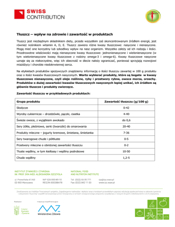 Tłuszcz – wpływ na zdrowie i zawartość w produktach Tłuszcz jest niezbędnym składnikiem diety, przede wszystkim zaś skoncentrowanym źródłem energii, jest również nośnikiem witamin A, D, E. Tłuszcz zawiera różne kwasy tłuszczowe: nasycone i nienasycone. Mogą mieć one korzystny lub szkodliwy wpływ na nasz organizm. Wszystko zależy od ich rodzaju i ilości. Prozdrowotne właściwości mają nienasycone kwasy tłuszczowe: jednonienasycone i wielonienasycone (w tym wielonienasycone kwasy tłuszczowe z rodziny omega-3 i omega-6). Kwasy tłuszczowe nasycone uznaje się za niekorzystne, więc ich obecność w diecie należy ograniczać, ponieważ sprzyjają rozwojowi miażdżycy i chorobie niedokrwiennej serca. Na etykietach produktów spożywczych znajdziemy informację o ilości tłuszczu zawartej w 100 g produktu oraz o ilości kwasów tłuszczowych nasyconych. Warto wybierać produkty, które są bogate w kwasy tłuszczowe nienasycone, czyli oleje roślinne, ryby i przetwory rybne, owoce morza, orzechy. Produktów o dużej zawartości kwasów tłuszczowych nasyconych lepiej unikać, ich źródłem są głównie tłuszcze i produkty zwierzęce. Zawartość tłuszczu w przykładowych produktach: Grupa produktu Zawartość tłuszczu (g/100 g) Słodycze 0-42 Wyroby cukiernicze – drożdżówki, pączki, ciastka 4-40 Świeże owoce, z wyjątkiem awokado do 0,6 Sery żółte, pleśniowe, serki (twarożki) do smarowania 20-40 Produkty mleczne – jogurty kremowe, śmietana, śmietanka 7-36 Sery twarogowe chude i półtłuste 0-5 Przetwory mleczne o obniżonej zawartości tłuszczu 0-2 Tłuste wędliny, w tym kiełbasy i wędliny podrobowe 10-50 Chude wędliny 1,2-5
