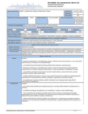SYLABUS rok akademicki 2012/13 Wydział Ekonomiczny Uniwersytet Gdański Nazwa przedmiotu Giełda – podstawowe zasady inwestowania w akcje Jednostka prowadząca przedmiot Nazwisko prowadzącego KMikr Nazwa kierunku Ekonomia/MSG Kod ECTS 14.3.E.FL.1878 Pkt.ECTS 2 Limit osób 30 Nazwa specjalności BRAK;BE;ME M;EWP;DEIFP ;HZ;IWG;MM; MTiHM;PGiSP; TiL;TM;TP; mgr Marek Kołatka, prof. UG dr hab. Teresa Kamińska Forma zajęć/Liczba godzin Wykład 0 Ćwiczenia Rok i rodzaj studiów 0 Konwersatoria 3 SSL, 30 Semestr Laboratoria komputerowe 6, 0 Seminaria 0 Lektoraty Status przedmiotu Fakultatywny Język wykładowy 0 polski Sposób realizacji zajęć Zajęcia w sali dydaktycznej. Metody dydaktyczne Wykłady z prezentacjami multimedialnymi, Aktywność w grupach, współpraca, Studia przypadków, Określenie przedmiotów wprowadzających wraz z wymogami wstępnymi Wymagania formalne Rozliczenia międzynarodowe lub Finanse publiczne i rynki finansowe Wymagania wstepne Student powinien znać podstawy finansów i bankowości Sposób i forma zaliczenia oraz kryteria oceny Sposób zaliczenia Zaliczenie na ocenę Forma zaliczenia Przeprowadzenie badań i prezentacja ich wyników/ Przygotowanie projektu/Aktywność na zajęciach Kryteria oceny Najważniejszym aspektem oceny jest przygotowanie i realizacja projektu - zarządzanie wirtualnym portfelem akcji (60%) dalej prezentacja wyników własnych w formie prezentacji (20%) i aktywność na zajęciach (20%). Efekty uczenia się Wiedza Student : - dysponuje podstawową i uporządkowaną wiedzą z zakresu nauk ekonomicznych, w tym stosunków ekonomicznych w obszarze rynku kapitałowego, - zna podstawową terminologię dotyczącą problematyki papierów wartościowych, - dysponuje podstawową i uporządkowaną wiedzą z zakresu funkcjonowania giełdy papierów wartościowych, w obszarze polityki inwestycyjnej i ryzyka związanego z inwestycjami w akcje, - zna podstawy strategii inwestycyjnych (analiza fundamentalna, analiza techniczna, analiza portfelowa, analizy niekonwencjonalne, - posiada podstawową wiedzę z zakresu uwarunkowań finansowych związanych z giełdą papierów wartościowych oraz podstawową wiedzę o zasadach i regulacjach dotyczących giełdy, - zna podstawowe regulacje kodeksu spółek handlowych oraz regulacji publicznego obrotu instrumentami finansowymi. Umiejętności Student : - umie wykorzystać podstawową wiedzę teoretyczną z zakresu giełdy papierów wartościowych w praktyce, - prawidłowo posługuje się pojęciami oraz regulacjami z zakresu rynku kapitałowego, - umie wykorzystywać wiedzę do podejmowania nowych wyzwań, rozstrzygania dylematów pojawiających się w pracy zawodowej oraz potrafi sprawnie rozwiązywać problemy zawodowe w zakresie lokowania środków w papiery wartościowe, - potrafi zidentyfikować wybrane rodzaje ryzyk związanych z inwestowanie na giełdzie papierów wartościowych oraz określić prawidłowo ich konsekwencje i sposoby zabezpieczania się przed tymi ryzykami, Wszystkie prawa zastrzeżone (c) Marek Kołatka 1/3 SYLABUS rok akademicki 2012/13 Wydział Ekonomiczny Uniwersytet Gdański - potrafi zastosować strategie inwestycyjne najczęściej wykorzystywane podczas inwestowania na giełdzie papierów wartościowych. Kompetencje społeczne Student : - potrafi współpracować w zespole, w sposób właściwy komunikuje się z otoczeniem, potrafi odpowiednio określić priorytety służące realizacji określonego przez siebie lub innych zadania oraz ponosić odpowiedzialność za podejmowane działania, - potrafi efektywnie uczestniczyć w podejmowaniu i realizacji grupowych zadań projektowych dotyczących inwestowania w papiery wartościowe, - potrafi myśleć w sposób przedsiębiorczy, podejmując decyzje o inwestowaniu w akcje lub instrumenty pochodne. Treści programowe 1. Istota giełdy papierów wartościowych - Uczestnicy - Statystyki - Funkcje - Uwarunkowania prawne - Giełda papierów wartościowych w Polsce - Giełdy papierów wartościowych na świecie 2. Funkcjonowanie giełdy papierów wartościowych 3. Akcje - Cechy i rodzaje akcji - Prawa i obowiązku akcjonariuszy - Inwestowanie w akcje 4. Ryzyko - Stopa zwrotu - Pojęcie ryzyka - Podstawowe metody pomiaru ryzyka - Ryzyko systematyczne i specyficzne 5. Analiza fundamentalna - wycena DCF - wycena metodą porównawczą 6. Analiza techniczna - określanie trendu - formacje świecowe - działania matematyczne 7. Analiza portfelowa 8. Analizy alternatywne 9. Psychologia inwestowania Wszystkie prawa zastrzeżone (c) Marek Kołatka 2/3 SYLABUS rok akademicki 2012/13 Wydział Ekonomiczny Uniwersytet Gdański 10. Instrumenty pochodne bazujące na akcjach 11. Prezentacja wyników projektu przez studentów 12. Podsumowanie wiadomości Wykaz literatury podstawowej i uzupełniającej Literatura obowiązkowa: S. Jajuga, T. Jajuga, Inwestycje, PWN, Warszawa 2008. Literatura uzupełniająca: W. Jurek, Konstrukcja i analiza portfela papierów wartościowych o zmiennym dochodzie, Wydawnictwo Akademii Ekonomicznej w Poznaniu, Poznań 2004. W. Nawrot, Rynek kapitałowy i jego rozwój, CeDeWu.pl Warszawa 2008. E. Ostrowska, Rynek kapitałowy, Polskie Wydawnictwo Ekonomiczne, Warszawa 2007. E. Pietrzak, M. Markiewicz (red.), Finanse, bankowość i rynki finansowe, Wydawnictwo Uniwersytetu Gdańskiego, Gdańsk 2009. B. Pietrzak, Z. Polański, B. Woźniak (red.) System finansowy w Polsce, PWN, Warszawa 2008. J .Socha, Rynek papierów wartościowych, Olympus, Warszawa 2003. Kontakt [email protected], [email protected], Wszystkie prawa zastrzeżone (c) Marek Kołatka 3/3