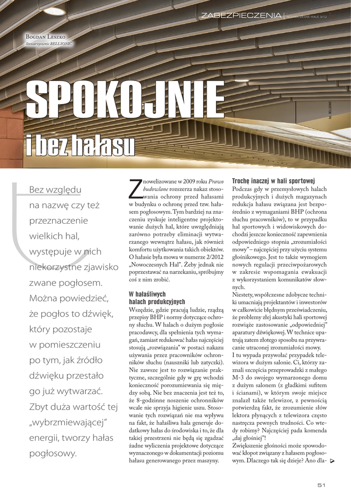 Zabezpieczenia | nowoczesne hale 3/12 Bogdan Leszko Stowarzyszenie BELLSONIC fot. BELLSONIC Spokojnie i bez hałasu T Z zwane pogłosem. nowelizowane w 2009 roku Prawo budowlane rozszerza nakaz stosowania ochrony przed hałasami w budynku o ochronę przed tzw. hałasem pogłosowym. Tym bardziej na znaczeniu zyskuje inteligentne projektowanie dużych hal, które uwzględniają zarówno potrzeby eliminacji wytwarzanego wewnątrz hałasu, jak również komfortu użytkowania takich obiektów. O hałasie była mowa w numerze 2/2012 „Nowoczesnych Hal”. Żeby jednak nie poprzestawać na narzekaniu, spróbujmy coś z nim zrobić. Można powiedzieć, W hałaśliwych halach produkcyjnych Bez względu na nazwę czy też przeznaczenie wielkich hal, występuje w nich niekorzystne zjawisko że pogłos to dźwięk, który pozostaje w pomieszczeniu po tym, jak źródło dźwięku przestało go już wytwarzać. Zbyt duża wartość tej „wybrzmiewającej” energii, tworzy hałas pogłosowy. Wszędzie, gdzie pracują ludzie, rządzą przepisy BHP i normy dotyczące ochrony słuchu. W halach o dużym pogłosie pracodawcy, dla spełnienia tych wymagań, zamiast redukować hałas najczęściej stosują „rozwiązania” w postaci nakazu używania przez pracowników ochronników słuchu (nauszniki lub zatyczki). Nie zawsze jest to rozwiązanie praktyczne, szczególnie gdy w grę wchodzi konieczność porozumiewania się między sobą. Nie bez znaczenia jest też to, że 8-godzinne noszenie ochronników wcale nie sprzyja higienie uszu. Stosowanie tych rozwiązań nie ma wpływu na fakt, że hałaśliwa hala generuje dodatkowy hałas do środowiska i to, że dla takiej przestrzeni nie będą się zgadzać żadne wyliczenia projektowe dotyczące wyznaczonego w dokumentacji poziomu hałasu generowanego przez maszyny. Trochę inaczej w hali sportowej Podczas gdy w przemysłowych halach produkcyjnych i dużych magazynach redukcja hałasu związana jest bezpośrednio z wymaganiami BHP (ochrona słuchu pracowników), to w przypadku hal sportowych i widowiskowych dochodzi jeszcze konieczność zapewnienia odpowiedniego stopnia „zrozumiałości mowy” – najczęściej przy użyciu systemu głośnikowego. Jest to także wymogiem nowych regulacji przeciwpożarowych w zakresie wspomagania ewakuacji z wykorzystaniem komunikatów słownych. Niestety, współczesne zdobycze techniki umacniają projektantów i inwestorów w całkowicie błędnym przeświadczeniu, że problemy złej akustyki hali sportowej rozwiąże zastosowanie „odpowiedniej” aparatury dźwiękowej. W technice upatrują zatem złotego sposobu na przywracanie utraconej zrozumiałości mowy. I tu wypada przywołać przypadek telewizora w dużym salonie. Ci, którzy zaznali szczęścia przeprowadzki z małego M-3 do swojego wymarzonego domu z dużym salonem (z gładkimi sufitem i ścianami), w którym swoje miejsce znalazł także telewizor, z pewnością potwierdzą fakt, że zrozumienie słów lektora płynących z telewizora często nastręcza pewnych trudności. Co wtedy robimy? Najczęściej pada komenda „daj głośniej”! Zwiększenie głośności może spowodować kłopot związany z hałasem pogłosowym. Dlaczego tak się dzieje? Ano dla- 51 nowoczesne hale 3/12 | Zabezpieczenia tego, że zwiększenie głośności oznacza nic innego tylko dołożenie dodatkowej energii dźwiękowej do tej, która już i tak nie może wydostać się z zamkniętego pomieszczenia. Niestety, ogromna większość właścicieli hal sportowych szuka rozwiązania w zastosowaniu wielkodecybelowych głośników. Zamiast więc tworzyć warunki do komfortowego uczestnictwa, próbuje się zabić hałas jeszcze większym hałasem! Jak wyeliminować hałas pogłosowy? Eliminowanie hałasu pogłosowego z wielkokubaturowych hal nie jest wcale takie łatwe. Myli się ten, kto uważa, że do tego wystarczy postawienie gdzieś w kącie hali jakiegoś „kosmicznego pochłaniacza”, no chyba żeby jakimś cudem skierować naraz do niego całe drgające w hali powietrze. Jak wiemy, źródłem hałasu pogłosowego jest pomieszczenie, którego gładkie i twarde płaszczyzny miliony razy odbijają energię dźwiękową. To właśnie tu w powierzchniach ścian, sufitu oraz przedmiotów leży rozwiązanie problemu z hałasem pogłosowym. Energia dźwiękowa najszybciej wytrącana jest w grubych materiałach o silnie porowatej strukturze, które nazywamy dźwiękochłonnymi. W każdym przypadku, zarówno hal przemysłowych, jak też sportowych i widowiskowych, najskuteczniejszym sposobem jest zwiększenie akustycznej chłonności wnętrza poprzez zainstalowanie w nim materiałów dźwiękochłonnych, które potrafią zredukować znaczną cześć przeszkadzającej energii do poziomu, przy którym nie będzie miała już większego znaczenia. Przestrzenne materiały dźwiękochłonne w hali 52 Nieprzypadkowo wspominałem o powierzchni. Działanie dźwiękochłonne odnosi się bowiem do dużej powierzchni, jaką muszą zająć te materiały w hałaśliwej hali. Parametrem, który wyznacza ilość potrzebnych materiałów dźwiękochłonnych jest tzw. równoważna powierzchnia pochłaniania. W przeciwieństwie do materiałów o silnie porowatej strukturze materiały gładkie i twarde mają bardzo małą równoważną powierzchnię pochłaniania. Polski Komitet Normalizacyjny już wkrótce opublikuje antyhałasową normę techniczną, która będzie określać dopuszczalne wartości pogłosu w pomieszczeniach (w tym halach przemysłowych i sportowych). Norma będzie także drogowskazem na drodze do określania ilości materiałów dźwiękochłonnych – o różnych równoważnych powierzchniach pochłaniania – potrzebnych do zredukowania hałasu w wybranych pomieszczeniach. Jakie materiały stosować? Różnorodność dostępnych materiałów budowlanych, wykończeniowych i technologii oferuje architektom rozwiązania dla rozmaitych wyzwań. Brak wiedzy, co planować i jak stosowa