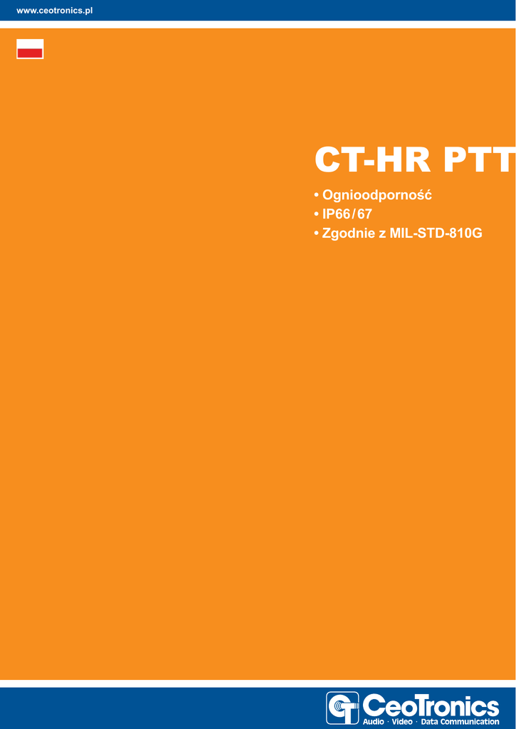 www.ceotronics.pl CT-HR PTT • Ognioodporność • IP66 / 67 • Zgodnie z MIL-STD-810G CT-HR PTT CT-HR PTT Projekt i produkcja w Niemczech Seria 8 Seria IP CT-Modular „Seria 8” ze złączem gniazdo / wtyk do zestawu mikrofonowosłuchawkowego CT-Modular „Seria 4” ze złączem Nexus gniazdo/wtyk do zestawu mikrofonowosłuchawkowego MILSpecs Zgodnie z MIL-STD-810G Pierścienie ochronne PTT Zgodnie z klasą ochrony IP66/67 360° Rotacja Złącze bagnetowe Ognioodporność EN 443 Gniazdo łączące i wtyk Opcjonalnie: Zgodnie z klasą ochrony II 2 G Ex ib IIC T4 CT-HR PTT PTT często zapewnia decydującą łączność z kolegami w akcji i niejednokrotnie może uratować życie. Z tego powodu sprzęt do łączności powinien wytrzymywać najbardziej ekstremalne warunki otoczenia i dodatkowo jeszcze prawidłowo w nich działać, zapewniając strażakom bezpieczeństwo. HR to skrót od High Resistant CeoTronics wprowadzając na rynek nowy model CT-HR PTT uzupełnia ofertę swoich produktów o przycisk Inline-PTT, odporny na czynniki zewnętrzne w profesjonalnych zastosowaniach strażackich. Obudowa Inline-PTT została wykonana z materiału wzmocnionego włóknem szklanym i odpornego na wstrząsy. Duży przycisk PTT jest wyposażony w zabezpieczenie przed przeciążeniem i został przystosowany do pracy przez ekstremal- 2 I CT-HR PTT nie długi czas. Dwa pierścienie ochronne pozwalają na indywidualną konfigurację przycisku. Płaski pierścień ochronny pozwala na naciskanie przycisku np. przedramieniem, zaś podwyższony zapobiega poprzez swoją wystającą powierzchnię przypadkowemu naciśnięciu. Oba te warianty można łatwo wymienić i bezpiecznie przymocować za pomocą zamknięcia bagnetowego. CT-HR PTT każdy może w ten sposób dostosować do swoich indywidualnych potrzeb, w zależności od sytuacji w czasie akcji. Zawsze w prawidłowym położeniu Dwie różne klamry mocujące pozwalają przymocować przycisk albo na, albo pod ubiorem. Obie klamry można obracać o 360° i w tym zakresie obrotu ustawiać w 16 stałych położeniach. W ten sposób każdy znajdzie optymalne położenie przycisku w każdych warunkach akcji. Nowy przycisk CT-HR PTT ma jeszcze więcej cech, które zostały dodane po przeprowadzeniu szeregu testów i certyfikacji, wzgl. klasyfikacji: • IP66 / 67: całkowita pyłoszczelność i ochrona przed silnym strumieniem wody, a także przed zanurzeniem • Ognioodporność: zgodnie z normą DIN EN 443 • UL 94 / V0: klasyfikacja w zakresie niepalnego kapania • Kolorystycznie oznaczone złącze: IP67 CT-HR PTT I 3 CT-HR PTT CT-HR PTT 360° Rotacja CT-FlexCom CT-FlexCom Opcjonalnie: Zgodnie z klasą ochrony II 2 G Ex ib IIC T4 CT-HR PTT w połączeniu z radiotelefonami W zależności od używanego radiotelefonu CT-HR PTT może być wyposażony w różne przyciski funkcyjne. Rozmieszenie przycisków zależy od modelu radiotelefonu. Istnieją wersje dwoma lub bez żadnego przycisku funkcyjnego. W zależności od modelu radiotelefonu dostępne są różnorakie funkcje, jak n.p.: - przycisk alarmowy - drugi przycisk PTT (równoległy) - regulacja głośności Nowy CT-HR PTT występuje w wersji z przyłączem do wszystkich produkowanych analogowych icyfrowych radiotelefonów w standardzie TETRA / TETRAPOL oraz DMR. 4 I CT-HR PTT Dodatkowe przyciski funkcyjne W wersjach urządzenia CT-HR PTT przeznaczonych do radiotelefonów MTP850, STP8000 i TPH700 dostępne są dwa dodatkowe klawisze funkcyjne z wersją przycisku awaryjnego bądź PTT. Możliwe są również inne warianty, takie, jak np. regulacja głośności. Dostępność różnorakich opcji determinowana jest przez używany radiotelefon. W wersjach przeznaczonych do radiotelefonów Motorola TRBO. MTP850S, GP320 / 340 i adaptera 12-pin z przyczyn technicznych aktualnie nie ma żadnych dodatkowych funkcji. CT-HR PTT w wersji ATEX Przycisk CT-HR PTT dostępny jest również w wersji ATEX do odpowiednich radiotelefonów. Aktualnie dysponujemy przyciskiem CT-HR PTT Motorola MTP850 EX zintegrowanym z systemem łączności CT-HelmetSet MTP850EX do radiotelefonu MOTOROLA MTP850EX. System CT-HelmetSet MTP850EX aktualnie jest kompatybilny z następującymi akcesoriami CeoTronics do hełmu: CT-HelmetSet MTP850EX • Słuchawka do hełmu MSA Gallet F1 z mikrofonem kontaktowym (sklepienie czaszki) • Słuchawka do hełmu MSA Gallet F1 z wbudowanym mikrofonem elektretowym • Słuchawka do hełmu MSA Gallet F1 z mikrofonem na długim wysięgniku CT-HelmetSet MTP850EX • Słuchawka z uniwersalną klamrą do mocowanego w hełmie z mikrofonem kontaktowym (sklepienie czaszki) • Słuchawka z uniwersalną klamrą do mocowania w hełmie z wbudowanym mikrofonem elektretowym • Słuchawka z uniwersalną klamrą do mocowania w hełmie z mikrofonem na długim wysięgniku CT-HR PTT I 5 CT-HR PTT Test zaliczony: CT-HR PTT po kontroli zgodnie z EN 443 Dane techniczne przycisku CT-HR PTT Ogólne dane Obudowa tworzywo sztuczne odporne na uderzenia, samogasnące zgodnie z UL 94 V-0 Kolor czarny Ognioodporność zgodnie z DIN EN 443 Stopień ochrony bez złącza IP66 / 67 Złącze do CT-HSG IP67 Zakres temperatur -32 °C do +65 °C Dopuszczalna wilgotność względna maks. 95 % Współczynnik zniekształceń nieliniowych ≤ 5 % przy 1 kHz / 1 W Kontrole MIL Próba na spadek zgodnie z MIL-STD-810G metoda 516.6 postępowanie IV Test na stałe suche ciepłe powietrze MIL-STD-810G metoda 501.5 postępowanie II 270 omów przy 1 kHz Test na stałe suche ciepłe powietrze MIL-STD-810G metoda 501.5 postępowanie I Test na stałe suche zimne powietrze MIL-STD-810G metoda 502.5 postępowanie II Test na stałe suche zimne powietrze MIL-STD-810G metoda 502.5 postępowanie I Próba na drgania zgodnie z MIL-STD-810G metoda 514.6 postępowanie I Test na wstrząsy zgodnie z MIL-STD-810G metoda 516.6 postępowanie I Test na okresowe wilgotne ciepłe powietrze zgodnie z MIL-STD-810G metoda 507.5 postępowanie II Aggravated Cycle 6 I CT-HR PTT CT