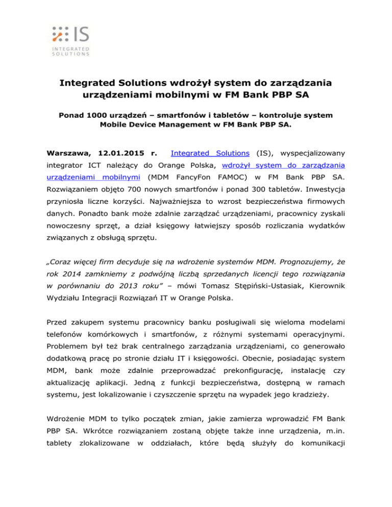 Integrated Solutions wdrożył system do zarządzania urządzeniami mobilnymi w FM Bank PBP SA Ponad 1000 urządzeń – smartfonów i tabletów – kontroluje system Mobile Device Management w FM Bank PBP SA. Warszawa, 12.01.2015 r. Integrated Solutions (IS), wyspecjalizowany integrator ICT należący do Orange Polska, wdrożył system do zarządzania urządzeniami mobilnymi (MDM FancyFon FAMOC) w FM Bank PBP SA. Rozwiązaniem objęto 700 nowych smartfonów i ponad 300 tabletów. Inwestycja przyniosła liczne korzyści. Najważniejsza to wzrost bezpieczeństwa firmowych danych. Ponadto bank może zdalnie zarządzać urządzeniami, pracownicy zyskali nowoczesny sprzęt, a dział księgowy łatwiejszy sposób rozliczania wydatków związanych z obsługą sprzętu. „Coraz więcej firm decyduje się na wdrożenie systemów MDM. Prognozujemy, że rok 2014 zamkniemy z podwójną liczbą sprzedanych licencji tego rozwiązania w porównaniu do 2013 roku” – mówi Tomasz Stępiński-Ustasiak, Kierownik Wydziału Integracji Rozwiązań IT w Orange Polska. Przed zakupem systemu pracownicy banku posługiwali się wieloma modelami telefonów komórkowych i smartfonów, z różnymi systemami operacyjnymi. Problemem był też brak centralnego zarządzania urządzeniami, co generowało dodatkową pracę po stronie działu IT i księgowości. Obecnie, posiadając system MDM, bank może zdalnie przeprowadzać prekonfigurację, instalację czy aktualizację aplikacji. Jedną z funkcji bezpieczeństwa, dostępną w ramach systemu, jest lokalizowanie i czyszczenie sprzętu na wypadek jego kradzieży. Wdrożenie MDM to tylko początek zmian, jakie zamierza wprowadzić FM Bank PBP SA. Wkrótce rozwiązaniem zostaną objęte także inne urządzenia, m.in. tablety zlokalizowane w oddziałach, które będą służyły do komunikacji z serwisami banku. Trwają też prace nad usprawnieniem procesów komunikacyjnych, dzięki integracji telefonii VoIP z telefonią komórkową. FM Bank PBP SA: FM Bank PBP SA funkcjonuje pod dwiema markami: BIZ Bank, Bank SMART. Priorytetem BIZ Banku jest wspieranie przedsiębiorczych, ułatwienie im prowadzenia działalności poprzez dostarczanie niezbędnych rozwiązań finansowych. To bank dedykowany biznesowi, każdemu, począwszy od mikro firm prowadzonych przez ludzi wolnych zawodów, rzemieślników czy specjalistów, przez małe przedsiębiorstwa, aż po średniej wielkości spółki. Specjalizacją BIZ Banku jest finansowanie, ponieważ polskim przedsiębiorcom nie brak innowacyjnych pomysłów, a często brak im kapitału. Bank SMART - to pierwszy w Polsce prawdziwy bank mobilny. Wiele banków ma aplikacje mobilne do obsługi klientów, ale to jest dla nich jedynie dodatek. Żaden z tych banków nie powstał od początku do końca z myślą o urządzeniach mobilnych. Bank SMART jest pierwszy. To bank, który łamie stereotypy, zmienia oblicze finansów, sprawia, że stają się one bez ograniczeń i dla każdego. Tutaj nie ma gwiazdek, ani haczyków. Więcej informacji można znaleźć na stronie: http://www.fmbankpbp.pl/ ` Informacje o Integrated Solutions: Integrated Solutions jest integratorem łączącym świat informatyki i telekomunikacji w taki sposób, aby nasi klienci mogli działać jeszcze efektywniej. Firma dostarcza innowacyjne usługi i rozwiązania ICT z takich obszarów, jak Ujednolicona Komunikacja, bezpieczeństwo IT, sieci LAN, WAN usługi Data Center oraz Infrastructure as a Service. Partnerami technologicznymi firmy Integrated Solutions są wiodący światowi dostawcy rozwiązań informatycznych i komunikacyjnych. Integrated Solutions jest spółką powstałą w ramach Orange Polska.