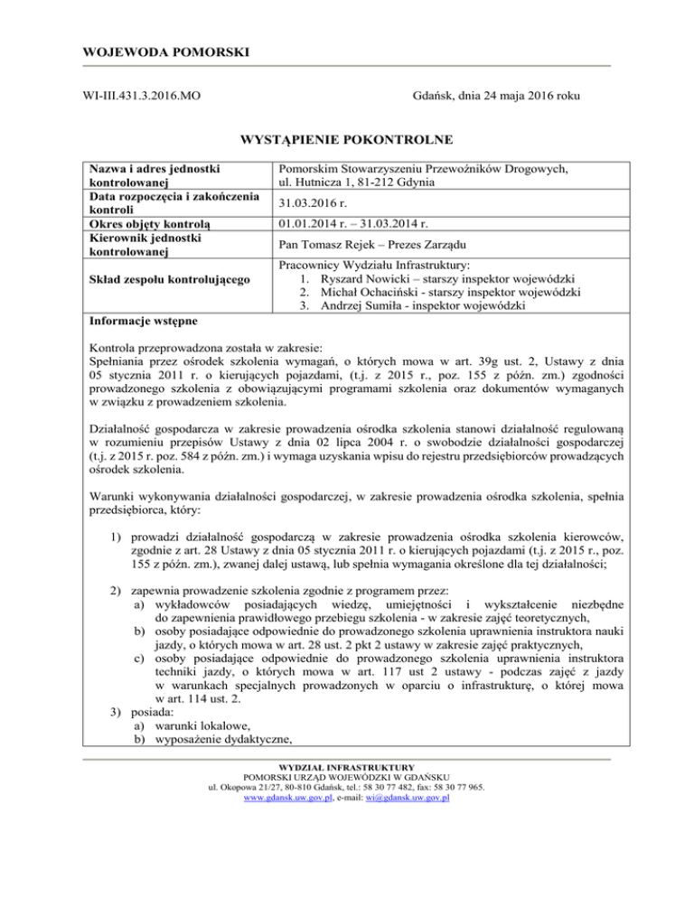 WOJEWODA POMORSKI Gdańsk, dnia 24 maja 2016 roku WI-III.431.3.2016.MO WYSTĄPIENIE POKONTROLNE Nazwa i adres jednostki kontrolowanej Data rozpoczęcia i zakończenia kontroli Okres objęty kontrolą Kierownik jednostki kontrolowanej Skład zespołu kontrolującego Pomorskim Stowarzyszeniu Przewoźników Drogowych, ul. Hutnicza 1, 81-212 Gdynia 31.03.2016 r. 01.01.2014 r. – 31.03.2014 r. Pan Tomasz Rejek – Prezes Zarządu Pracownicy Wydziału Infrastruktury: 1. Ryszard Nowicki – starszy inspektor wojewódzki 2. Michał Ochaciński - starszy inspektor wojewódzki 3. Andrzej Sumiła - inspektor wojewódzki Informacje wstępne Kontrola przeprowadzona została w zakresie: Spełniania przez ośrodek szkolenia wymagań, o których mowa w art. 39g ust. 2, Ustawy z dnia 05 stycznia 2011 r. o kierujących pojazdami, (t.j. z 2015 r., poz. 155 z późn. zm.) zgodności prowadzonego szkolenia z obowiązującymi programami szkolenia oraz dokumentów wymaganych w związku z prowadzeniem szkolenia. Działalność gospodarcza w zakresie prowadzenia ośrodka szkolenia stanowi działalność regulowaną w rozumieniu przepisów Ustawy z dnia 02 lipca 2004 r. o swobodzie działalności gospodarczej (t.j. z 2015 r. poz. 584 z późn. zm.) i wymaga uzyskania wpisu do rejestru przedsiębiorców prowadzących ośrodek szkolenia. Warunki wykonywania działalności gospodarczej, w zakresie prowadzenia ośrodka szkolenia, spełnia przedsiębiorca, który: 1) prowadzi działalność gospodarczą w zakresie prowadzenia ośrodka szkolenia kierowców, zgodnie z art. 28 Ustawy z dnia 05 stycznia 2011 r. o kierujących pojazdami (t.j. z 2015 r., poz. 155 z późn. zm.), zwanej dalej ustawą, lub spełnia wymagania określone dla tej działalności; 2) zapewnia prowadzenie szkolenia zgodnie z programem przez: a) wykładowców posiadających wiedzę, umiejętności i wykształcenie niezbędne do zapewnienia prawidłowego przebiegu szkolenia - w zakresie zajęć teoretycznych, b) osoby posiadające odpowiednie do prowadzonego szkolenia uprawnienia instruktora nauki jazdy, o których mowa w art. 28 ust. 2 pkt 2 ustawy w zakresie zajęć praktycznych, c) osoby posiadające odpowiednie do prowadzonego szkolenia uprawnienia instruktora techniki jazdy, o których mowa w art. 117 ust 2 ustawy - podczas zajęć z jazdy w warunkach specjalnych prowadzonych w oparciu o infrastrukturę, o której mowa w art. 114 ust. 2. 3) posiada: a) warunki lokalowe, b) wyposażenie dydaktyczne, WYDZIAŁ INFRASTRUKTURY POMORSKI URZĄD WOJEWÓDZKI W GDAŃSKU ul. Okopowa 21/27, 80-810 Gdańsk, tel.: 58 30 77 482, fax: 58 30 77 965. www.gdansk.uw.gov.pl, e-mail: [email protected] c) d) e) f) g) miejsca przeznaczone do prowadzenia zajęć praktycznych, miejsca przeznaczone do jazdy w warunkach specjalnych, pojazdy samochodowe odpowiednie do zakresu prowadzonego szkolenia, szczegółowy program szkolenia wraz z planem jego wykonania oraz metodami nauczania; nie był, jako osoba fizyczna lub członek organu osoby prawnej, prawomocnie skazany za przestępstwo popełnione w celu osiągnięcia korzyści majątkowych lub przestępstwo przeciwko wiarygodności dokumentów. Organem prowadzącym rejestr przedsiębiorców prowadzących ośrodek szkolenia jest wojewoda właściwy ze względu na miejsce wykonywania działalności objętej wpisem. Biorąc powyższe pod uwagę, Wojewoda Pomorski dokonując wpisu podmiotu do rejestru przedsiębiorców prowadzących ośrodki szkolenia, zweryfikował niezbędną dokumentację (wraz z programem szkolenia) na podstawie, której dokonał wpisu do rejestru. Zgodnie z art. 39h ustawy, nadzór nad ośrodkami szkolenia sprawuje wojewoda. W ramach sprawowanego nadzoru wojewoda przeprowadza kontrolę w zakresie: a) spełniania przez ośrodek szkolenia wymagań, o których mowa w art. 39g ust. 2 ustawy, b) zgodności prowadzonego szkolenia z obowiązującymi programami szkolenia, c) dokumentów wymaganych w związku z prowadzeniem szkolenia. Szczegółowe warunki dotyczące prowadzenia szkoleń przez ośrodek szkolenia oraz sposobu prowadzenia dokumentacji dotyczącej przedmiotowych szkoleń zostały ujęte w Rozporządzeniu Ministra Infrastruktury z dnia 01 kwietnia 2010 r. w sprawie szkolenia kierowców wykonujących przewóz drogowy (t.j. z 2014 r. poz. 1005). Zgodnie z art. 39e ust. 2 Ustawy z dnia 06 września 2001 r. o transporcie drogowym (t.j. z 2013 poz. 1414 z późn. zm.), podmiot zobowiązany jest do przekazywania Wojewodzie Pomorskiemu określonych informacji (m.in. o rozpoczęciu szkolenia wraz z lista uczestników, o zakończeniu szkolenia oraz wydania zaświadczeń potwierdzających ukończenie szkolenia okresowego, o rozpoczęciu kwalifikacji wstępnej wraz z lista uczestników). Ocena kontrolowanej działalności Pozytywna Ustalenia W toku postępowania kontrolnego ustalono: 1.Pozytywnie ocenia się, spełnianie, przez ośrodek szkolenie wymagań określonych dla przedsiębiorcy prowadzącego ośrodek szkolenia kierowców, o których mowa w art. 28 ust. 2 Ustawy o kierujących pojazdami. - Podmiot posiada wyposażenie dydaktyczne ośrodka szkolenia, o których mowa w § 3 ust. 2 Rozporządzenia Ministra Infrastruktury z dnia 01 kwietnia 2010 r. w sprawie szkolenia kierowców wykonujących przewóz drogowy. - Pojazdy wykorzystywane do szkolenia odpowiadają warunkom określonym w przepisach prawa. - Program szkolenia oraz kadra wykładowców, instruktorów i innych osób, które odpowiedzialne są za prowadzenie szkoleń jest tożsama ze złożonymi dokumentami, na podstawie, których Wojewoda Pomorski dokonał wpisu ośrodka szkolenia do rejestru przedsiębiorców prowadzących ośrodki szkolenia, uprawnienia osób prowadzących szkolenia są aktualne. WYDZIAŁ INFRASTRUKTURY POMORSKI URZĄD WOJEWÓDZKI W GDAŃSKU ul. Okopowa 21/27, 80-810 Gdańsk, tel.: 58 30 77 482, fax: 58 30 77 965. www.gdansk.uw.gov.pl, e-mail: [email protected] Strona 2 z 3 2. Pozytywnie ocenia się działalność ośrodka szkoleni