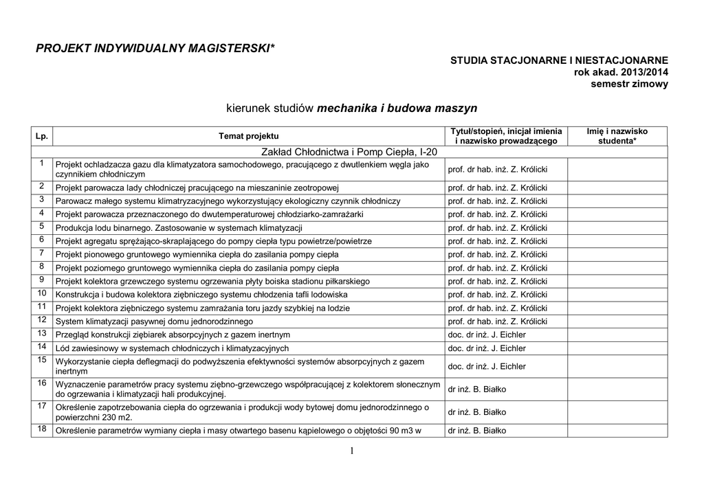 PROJEKT INDYWIDUALNY MAGISTERSKI* STUDIA STACJONARNE I NIESTACJONARNE rok akad. 2013/2014 semestr zimowy kierunek studiów mechanika i budowa maszyn Lp. Tytuł/stopień, inicjał imienia i nazwisko prowadzącego Temat projektu Zakład Chłodnictwa i Pomp Ciepła, I-20 1 Projekt ochladzacza gazu dla klimatyzatora samochodowego, pracującego z dwutlenkiem węgla jako czynnikiem chłodniczym prof. dr hab. inż. Z. Królicki 2 Projekt parowacza lady chłodniczej pracującego na mieszaninie zeotropowej prof. dr hab. inż. Z. Królicki 3 Parowacz małego systemu klimatryzacyjnego wykorzystujący ekologiczny czynnik chłodniczy prof. dr hab. inż. Z. Królicki 4 Projekt parowacza przeznaczonego do dwutemperaturowej chłodziarko-zamrażarki prof. dr hab. inż. Z. Królicki 5 Produkcja lodu binarnego. Zastosowanie w systemach klimatyzacji prof. dr hab. inż. Z. Królicki 6 Projekt agregatu sprężająco-skraplającego do pompy ciepła typu powietrze/powietrze prof. dr hab. inż. Z. Królicki 7 Projekt pionowego gruntowego wymiennika ciepła do zasilania pompy ciepła prof. dr hab. inż. Z. Królicki 8 Projekt poziomego gruntowego wymiennika ciepła do zasilania pompy ciepła prof. dr hab. inż. Z. Królicki 9 Projekt kolektora grzewczego systemu ogrzewania płyty boiska stadionu piłkarskiego prof. dr hab. inż. Z. Królicki 10 Konstrukcja i budowa kolektora ziębniczego systemu chłodzenia tafli lodowiska prof. dr hab. inż. Z. Królicki 11 Projekt kolektora ziębniczego systemu zamrażania toru jazdy szybkiej na lodzie prof. dr hab. inż. Z. Królicki 12 System klimatyzacji pasywnej domu jednorodzinnego prof. dr hab. inż. Z. Królicki 13 Przegląd konstrukcji ziębiarek absorpcyjnych z gazem inertnym doc. dr inż. J. Eichler 14 Lód zawiesinowy w systemach chłodniczych i klimatyzacyjnych doc. dr inż. J. Eichler 15 Wykorzystanie ciepła deflegmacji do podwyższenia efektywności systemów absorpcyjnych z gazem inertnym doc. dr inż. J. Eichler 16 Wyznaczenie parametrów pracy systemu ziębno-grzewczego współpracującej z kolektorem słonecznym dr inż. B. Białko do ogrzewania i klimatyzacji hali produkcyjnej. 17 Określenie zapotrzebowania ciepła do ogrzewania i produkcji wody bytowej domu jednorodzinnego o powierzchni 230 m2. dr inż. B. Białko 18 Określenie parametrów wymiany ciepła i masy otwartego basenu kąpielowego o objętości 90 m3 w dr inż. B. Białko 1 Imię i nazwisko studenta* użytkowanego w okresie od 15 IV do 15 IX w warunkach klimatycznych Polski. 19 Dobór agregatu sprężająco-skraplającego do niskotemperaturowego systemu ziębniczego. dr inż. B. Białko 20 Projekt skraplacza samochodowego systemu klimatyzacyjnego pracującego na N2O jako ziębniku. dr inż. B. Białko 21 Sposoby określania wydajności wymienników ciepła pracujących na mieszaninach zeotropowych. dr inż. B. Białko 22 Określenie parametrów pracy systemu sprężająco-skraplającego pracującego w obszarach nadkrytycznych dr inż. B. Białko 23 Projekt koncepcyjny instalacji klimatyzacyjnej hali laboratoryjnej. dr inż. B. Białko 24 Projekt systemu utrzymania parametrów termicznych zbiornika kalorymetrycznego dr inż. B. Białko 25 Określenie warunków wymiany ciepła w pionowym kolektorze gruntowym o zmiennym przekroju. dr inż. B. Białko 26 Projekt koncepcyjny stanowiska laboratoryjnego dla obiegu z dochładzaczem i doziębiaczem oraz skraplaczem chłodzonym wodą i parownikiem chłodzącym wodę z sieci miejskiej. Conception of laboratory water cooled refrigeration chiller with subcooler and internal heat exchanger dr inż. S. Reszewski Projekt koncepcyjny stanowiska laboratoryjnego dla obiegu z dochładzaczem i doziębiaczem oraz skraplaczem chłodzonym powietrzem i parownikiem chłodzącym wodę z sieci miejskiej. Conception of laboratory air cooled refrigeration chiller with subcooler and internal heat exchanger dr inż. S. Reszewski Projekt koncepcyjny zintegrowanej instalacji grzewczej wentylacyjnej i klimatyzacyjnej dla domu jednorodzinnego. Conception of HVAC integrated system for single family building. dr inż. S. Reszewski 29 Projekt koncepcyjny tunelu do zamrażania tortów lodowych Conception of refrigeration tunnel for ice cake production dr inż. S. Reszewski 30 Projekt koncepcyjny instalacji grzewczej dla szklarni z zastosowaniem pomp ciepła Conception of heat pump heating system for greenhouse dr inż. S. Reszewski 31 Projekt koncepcyjny instalacji klimatyzacyjnej dla budynku mieszkalnego z wykorzystaniem agregatu absorpcyjnego pracującego z roztworem LiBr- H2O Conception of air conditioning plant for multifamily building with LiBr- H2O absorption water chiller dr inż. S. Reszewski Projekt koncepcyjny centrali wentylacyjnej i klimatyzacyjnej dla sali kinowej z wykorzystaniem urządzenia absorpcyjnego Conception of HVAC system for cinema with absorption water chiller dr inż. S. Reszewski 33 Projekt koncepcyjny instalacji chłodniczej dla lodowiska krytego. Conception of refrigeration system for an artificial indoor ice rink dr inż. S. Reszewski 34 Przegląd i analiza termodynamiczna adsorpcyjnych systemów pomp ciepła z regeneracją masy. Review and thermodynamic analysis of sorption refrigeration systems with mass recovery. dr inż. B. Zajączkowski 35 Przegląd i analiza termodynamiczna wielostopniowych adsorpcyjnych systemów chłodniczych dr inż. B. Zajączkowski 27 28 32 2 zasilanych niskotemperaturowym ciepłem odpadowym. Review and thermodynamic analysis of multistage sorption refrigeration systems driven by lowtemperature waste heat. 36 Modelowanie cieplne adsorbera z falą cieplną. Heat transfer modeling in adsorber with ’thermal wave‘. dr inż. B. Zajączkowski 37 Przegląd i porównanie możliwości zastosowania układów adsorpcyjnych i absorpcyjnych do realizacji obiegów lewobieżnych. Review and comparison of the applicability of adsorption and absorption refrigeration systems. dr inż. B. Zajączkowski 38 Wymiennik ciepła do odparowania wod