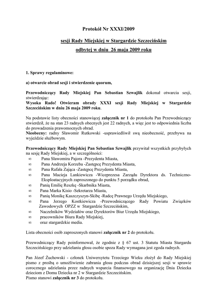 Protokół Nr XXXI/2009 sesji Rady Miejskiej w Stargardzie Szczecińskim odbytej w dniu 26 maja 2009 roku 1. Sprawy regulaminowe: a) otwarcie obrad sesji i stwierdzenie quorum, Przewodniczący Rady Miejskiej Pan Sebastian Szwajlik dokonał otwarcia sesji, stwierdzając: Wysoka Rado! Otwieram obrady XXXI sesji Rady Miejskiej w Stargardzie Szczecińskim w dniu 26 maja 2009 roku. Na podstawie listy obecności stanowiącej załącznik nr 1 do protokołu Pan Przewodniczący stwierdził, że na stan 23 radnych obecnych jest 22 radnych, a więc jest to odpowiednia liczba do prowadzenia prawomocnych obrad. Nieobecny: radny Sławomir Rutkowski -usprawiedliwił swą nieobecność, przebywa na wyjeździe służbowym. Przewodniczący Rady Miejskiej Pan Sebastian Szwajlik przywitał wszystkich przybyłych na sesję Rady Miejskiej, a w szczególności: • Pana Sławomira Pajora -Prezydenta Miasta, • Pana Andrzeja Korzeba -Zastępcę Prezydenta Miasta, • Pana Rafała Zająca -Zastępcę Prezydenta Miasta, • Pana Macieja Lankiewicza -Wiceprezesa Zarządu Dyrektora ds. TechnicznoEksploatacyjnych zaproszonego do punktu 5 porządku obrad, • Panią Emilię Reszkę -Skarbnika Miasta, • Pana Marka Kisio -Sekretarza Miasta, • Panią Monikę Kaszczyszyn-Skibę -Radcę Prawnego Urzędu Miejskiego, • Pana Jerzego Kostkiewicza -Przewodniczącego Rady Powiatu Związków Zawodowych OPZZ w Stargardzie Szczecińskim, • Naczelników Wydziałów oraz Dyrektorów Biur Urzędu Miejskiego, • pracowników Biura Rady Miejskiej, • oraz stargardzkie media. Lista obecności osób zaproszonych stanowi załącznik nr 2 do protokołu. Przewodniczący Rady poinformował, że zgodnie z § 67 ust. 3 Statutu Miasta Stargardu Szczecińskiego przy udzielaniu głosu osobie spoza Rady wymagana jest zgoda radnych. Pan Józef Żuchowski - członek Uniwersytetu Trzeciego Wieku złożył do Rady Miejskiej pismo z prośbą o umożliwienie zabrania głosu podczas obrad dzisiejszej sesji w sprawie corocznego udzielania przez radnych wsparcia finansowego na organizację Dnia Dziecka dzieciom z Domu Dziecka nr 2 w Stargardzie Szczecińskim. Pismo stanowi załącznik nr 3 do protokołu. Przewodniczący Rady zaproponował, aby udzielić głosu przed punktem 2, tj. Sprawozdaniem Prezydenta Miasta z pracy między sesjami. Radni pytań, uwag nie zgłosili, wobec czego Przewodniczący Rady przystąpił do głosowania nad udzieleniem głosu Panu Józefowi Żuchowskiemu podczas obrad dzisiejszej sesji w sprawie corocznego udzielania przez radnych wsparcia finansowego na organizację Dnia Dziecka dzieciom z Domu Dziecka nr 2 w Stargardzie Szczecińskim. W wyniku głosowania Rada jednogłośnie przy 22 głosach za wyraziła zgodę na udzielenie głosu na dzisiejszej sesji Panu Józefowi Żuchowskiemu. Pan Marek Kisio - Prezes Klubu Sportowego „Spójnia” złożył do Rady Miejskiej pismo z prośbą o umożliwienie zabrania głosu podczas obrad dzisiejszej sesji w sprawie podsumowania promocji miasta poprzez sport w aspekcie zakończonych rozgrywek II Ligii w koszykówce mężczyzn w sezonie 2008/2009. Pismo stanowi załącznik nr 4 do protokołu. Przewodniczący Rady zaproponował, aby udzielić głosu po wystąpieniu Pana Józefa Żuchowskiego, czyli również przed punktem 2 porządku obrad. Radni pytań, uwag nie zgłosili, wobec czego Przewodniczący Rady przystąpił do głosowania nad udzieleniem głosu Panu Markowi Kisio Prezesowi Klubu Sportowego „Spójnia” podczas obrad dzisiejszej sesji w sprawie podsumowania promocji miasta poprzez sport w aspekcie zakończonych rozgrywek II Ligii w koszykówce mężczyzn w sezonie 2008/2009. W wyniku głosowania Rada większością głosów przy 21 głosach za i 1 wstrzymującym się wyraziła zgodę na udzielenie głosu na dzisiejszej sesji Panu Markowi Kisio Prezesowi Klubu Sportowego „Spójnia”. Przewodniczący Rady powiedział, że radni przed sesją otrzymali porządek obrad wraz z projektami uchwał i autopoprawką. Porządek obrad stanowi załącznik nr 5 do protokołu. Przewodniczący Rady poinformował, że na podstawie art.20 ust.1a rada może wprowadzić zmiany w porządku obrad bezwzględną większością głosów ustawowego składu rady. Natomiast § 50 ust. 3 Statutu Miasta Stargardu Szczecińskiego uprawnia każdego radnego oraz Prezydenta Miasta do wystąpienia z wnioskiem o zmianę porządku obrad. Komisja Oświaty, Kultury i Sportu, realizując wniosek złożony przez Panią Jolantę Faryńską Dyrektora Gimnazjum nr 4, wystąpiła z inicjatywą uchwałodawczą w sprawie zmiany nazwy Gimnazjum nr 4 w Stargardzie Szczecińskim. Radni pytań, uwag nie zgłosili, wobec czego Przewodniczący Rady przystąpił do głosowania nad zmianą porządku obrad polegającą na wprowadzeniu do porządku obrad jako punktu 15 projektu uchwały w sprawie zmiany nazwy Gimnazjum nr 4. W wyniku głosowania Rada bezwzględną większością głosów przy 21 głosach za (1 osoba nie brała udziału w głosowaniu, obecna na sali obrad) dokonała zmiany porządku 2 obrad polegającej na wprowadzeniu do porządku obrad jako punktu 15 projektu uchwały w sprawie zmiany nazwy Gimnazjum nr 4. Projekt uchwały będzie rozpatrywany jako punkt 15 porządku obrad, wobec czego Pan Przewodniczący poprosił radnych o dostosowanie porządku obrad do przegłosowanej zmiany. Komisja Gospodarcza po rozpatrzeniu wniosku z dnia 22 maja br. Casino Gold Spółki z o.o. z siedzibą w Warszawie dotyczącego lokalizacji przy ulicy Szczecińskiej 110a w Stargardzie Szczecińskim salonu gier na automatach wystąpiła z inicjatywą uchwałodawczą w sprawie opinii o lokalizacji ośrodka gier. Radni pytań, uwag nie zgłosili, wobec czego Przewodniczący Rady przystąpił do głosowania nad zmianą porządku obrad polegającą na wprowadzeniu do porządku obrad jako punktu 16 projektu uchwały w sprawie opinii o lokalizacji ośrodka gier. W wyniku głosowania Rada jednogłośnie przy 22 głosach za dokonała zm