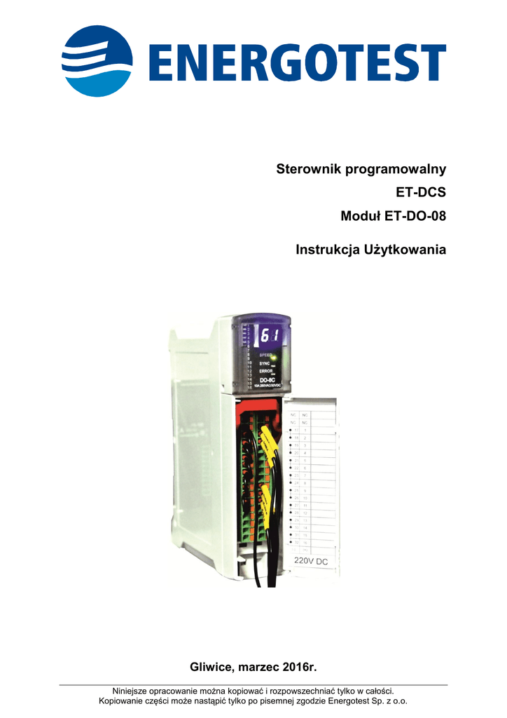 Sterownik programowalny ET-DCS Moduł ET-DO-08 Instrukcja Użytkowania Gliwice, marzec 2016r. Niniejsze opracowanie można kopiować i rozpowszechniać tylko w całości. Kopiowanie części może nastąpić tylko po pisemnej zgodzie Energotest Sp. z o.o. Instrukcja Użytkowania 2 Sterownik programowalny ET-DCS; (03.2016) Instrukcja Użytkowania Energotest Sp. z o.o. zastrzega sobie prawo wprowadzania zmian w swoich produktach polegających na doskonaleniu ich cech technicznych. Zmiany te nie zawsze mogą być na bieżąco uwzględniane w dokumentacji. Marki i nazwy produktów wymienione w niniejszej instrukcji stanowią znaki towarowe lub zarejestrowane znaki towarowe, należące odpowiednio do ich właścicieli. Kontakt: Energotest Sp. z o.o. ul. Chorzowska 44B 44-100 Gliwice Telefon – Centrala: +48 32 270 45 18 Telefon – Produkcja: +48 32 270 45 18 w. 40 Telefon – Marketing: +48 32 270 45 18 w. 26 Fax: +48 32 270 45 17 Poczta elektroniczna – Produkcja: [email protected] Internet (www): http://www.energotest.com.pl Copyright © 2015 by Energotest Sp. z o.o. Wszelkie prawa zastrzeżone. Sterownik programowalny ET-DCS; (03.2016) 3 Instrukcja Użytkowania ZNACZENIE INSTRUKCJI UŻYTKOWANIA W razie wątpliwości co do właściwej interpretacji treści instrukcji prosimy koniecznie zwracać się o wyjaśnienie do producenta. Będziemy wdzięczni za wszelkiego rodzaju sugestie, opinie i krytyczne uwagi użytkowników i prosimy o ich ustne lub pisemne przekazywanie. Pomoże nam to uczynić instrukcję jeszcze łatwiejszą w użyciu oraz uwzględnić życzenia i wymagania użytkowników. Urządzenie, do którego została dołączona niniejsza instrukcja, zawiera niemożliwe do wyeliminowania, potencjalne zagrożenie dla osób i wartości materialnych. Dlatego każda osoba pracująca przy urządzeniu lub wykonująca jakiekolwiek czynności związane z obsługą i konserwacją urządzenia, powinna zostać uprzednio przeszkolona i znać potencjalne zagrożenie. Wymaga to starannego przeczytania, zrozumienia i przestrzegania instrukcji użytkowania, w szczególności wskazówek dotyczących bezpieczeństwa. Niestosowanie się do zasad niniejszej instrukcji powoduje utratę gwarancji. 4 Sterownik programowalny ET-DCS; (03.2016) Instrukcja Użytkowania SPIS TREŚCI 1. INFORMACJA O ZGODNOŚCI .............................................................................. 6 2. ZASTOSOWANIE URZĄDZENIA ........................................................................... 6 3. WYKAZ ZASTOSOWANYCH NORM ..................................................................... 7 4. ZASADY BEZPIECZEŃSTWA ............................................................................... 7 5. OPIS STEROWNIKA ET-DCS................................................................................ 9 5.1. Informacje ogólne ............................................................................................ 9 5.2. Budowa ......................................................................................................... 11 5.2.1. Informacje podstawowe.......................................................................... 11 5.2.2. Podstawowe dane techniczne ................................................................ 13 5.3. Opis poszczególnych elementów sterownika ET-DCS .................................. 15 5.3.1. Wyjścia dwustanowe ET-DO-08............................................................. 15 5.3.2. Magistrala komunikacyjna ET-BUS – moduł ET-BP-01 ......................... 20 5.3.3. Szyna montażowa ET-SM ...................................................................... 22 5.4. Funkcja ET-DirectLink ................................................................................... 23 6. MONTAŻ .............................................................................................................. 24 6.1. Szyna montażowa ET-SM ............................................................................. 24 6.2. Przewody zapewniające prawidłowe podłączenie urządzenia ....................... 26 6.3. Kable ET-KM do łączenia magistrali wysp systemu ET-DCS ........................ 26 6.4. Segment końcowy ET-SK.............................................................................. 27 6.5. Moduł ET-DO-08 ........................................................................................... 27 7. URUCHOMIENIE ................................................................................................. 29 7.1. Pierwsze uruchomienie modułu ET-DO-08 ................................................... 29 7.2. Ustawienie Config w trybie 0 ......................................................................... 29 7.3. Ustawienie Config w trybie 1 ......................................................................... 29 8. EKSPLOATACJA ................................................................................................. 30 8.1. Sprawdzenie okresowe działania sterownika ET-DCS .................................. 30 8.2. Wykrywanie i usuwanie uszkodzeń sterownika ET-DCS ............................... 30 9. MAGAZYNOWANIE ............................................................................................. 30 10. UTYLIZACJA ...................................................................................................... 31 11. GWARANCJA I SERWIS.................................................................................... 31 12. SPOSÓB ZAMAWIANIA ..................................................................................... 31 Sterownik programowalny ET-DCS; (03.2016) 5 Instrukcja Użytkowania 1. INFORMACJA O ZGODNOŚCI Urządzenie będące przedmiotem niniejszej instrukcji zostało skonstruowane i jest produkowane dla zastosowań w środowisku przemysłowym. Urządzenia te są zgodne z postanowieniami dyrektyw zawartymi w: 1. Ustawie z dnia 30 sierpnia 2002 r. o systemie zgodności (Dz. U. Nr 166, poz. 