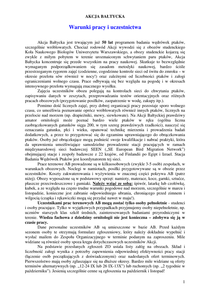AKCJA BAŁTYCKA Warunki pracy i uczestnictwa Akcja Bałtycka jest trwającym juŜ 50 lat programem badania wędrówek ptaków, szczególnie wróblowatych. ChociaŜ rodowód Akcji wywodzi się z obozów studenckiego Koła Naukowego Biologów Uniwersytetu Warszawskiego, a obozy studenckie kojarzą się zwykle z miłym pobytem w terenie urozmaiconym schwytaniem paru ptaków, Akcja Bałtycka koncentruje się przede wszystkim na pracy naukowej. Skutkuje to bezwzględnie wymaganym podporządkowaniem się zasadom metodyki naukowej, bardzo ściśle przestrzeganym rygorem zajęć (codzienne, cogodzinne kontrole sieci od świtu do zmroku – w okresie przelotu sów równieŜ w nocy!) oraz zaleŜnymi od liczebności ptaków i załogi ograniczeniami wolnego czasu. Prace odbywają się bez względu na pogodę i w okresach intensywnego przelotu wymagają znacznego wysiłku. Zajęcia uczestników obozu polegają na kontrolach sieci do chwytania ptaków, zapisywaniu danych w zeszytach, przeprowadzaniu testów orientacyjnych oraz róŜnych pracach obozowych (przygotowanie posiłków, zaopatrzenie w wodę, zakupy itp.). Pomimo dość licznych zajęć, przy dobrej organizacji pracy pozostaje sporo wolnego czasu, co umoŜliwia poznawanie oprócz wróblowatych równieŜ innych ptaków, licznych na przelocie nad morzem (np. drapieŜniki, mewy, siewkowate). Na Akcji Bałtyckiej prawdziwy amator ornitologii moŜe poznać bardzo wiele ptaków w ręku (ogólna liczna zaobrączkowanych gatunków sięga 200, w tym szereg prawdziwych rzadkości), nauczyć się oznaczania gatunku, płci i wieku, opanować technikę mierzenia i prowadzenia badań dodatkowych, a przez to przygotować się do egzaminu uprawniającego do obrączkowania ptaków. Osoby juŜ obrączkujące mogą podnieść swoje kwalifikacje i nabrać praktyki, która da uprawnienia umoŜliwiające samodzielne prowadzenie stacji pracujących w ramach międzynarodowej sieci badawczej SEEN („SE European Bird Migration Network”) obejmującej stacje i zespoły badawcze z 22 krajów, od Finlandii po Egipt i Izrael. Stacja Badania Wędrówek Ptaków jest koordynatorem tej sieci. Prace terenowe AB prowadzone są w kilkuosobowych (zwykle 3-5 osób) zespołach, w warunkach obozowych. Noclegi w namiotach, posiłki przygotowywane są w obozie przez uczestników. Koszty zakwaterowania i wyŜywienia w znacznej części pokrywa AB (patrz niŜej). Obozy wyposaŜone są w podstawowy sprzęt: namioty, materace, koce, garnki, sztućce, płaszcze przeciwdeszczowe i gumiaki. NaleŜy wziąć ze sobą: śpiwór, latarkę lub czołówkę, kubek, a ze względu na często trudne warunki pogodowe nad morzem, szczególnie w marcu i listopadzie, konieczne jest zabranie odpowiedniego ubrania, chroniącego przed zimnem i wilgocią (czapka i rękawiczki mogą się przydać nawet w maju!). Uczestnikami prac terenowych AB mogą zostać tylko osoby pełnoletnie - studenci i osoby pracujące. Tylko w wyjątkowych przypadkach przyjmujemy osoby niepełnoletnie, np. uczniów starszych klas szkół średnich, zainteresowanych badaniami przyrodniczymi w terenie. Wiedza fachowa z dziedziny ornitologii nie jest konieczna – zdobywa się ją w czasie pracy. Dane personalne uczestników AB są umieszczone w bazie AB. Przed kaŜdym sezonem osoby te otrzymują formularz zgłoszeniowy, który naleŜy dokładnie wypełnić i wysłać mailem do Zespołu Organizacyjnego w terminie podanym na zaproszeniu. Mile widziane są równieŜ osoby spoza kręgu dotychczasowych uczestników Akcji. Na podstawie przesłanych zgłoszeń ZO ustala listy załóg na obozach. Skład i liczebność załogi wynika z potrzeby zapewnienia odpowiedniej efektywności pracy stacji (łączenie osób początkujących z doświadczonymi) oraz nadesłanych ofert terminowych. Pierwszeństwo mają osoby zgłaszające się na dłuŜsze okresy. Bardzo mile widziane są oferty terminów alternatywnych (np. „12-24 IX lub 26 IX-13X”) lub ruchomych (np. „2 tygodnie w październiku”). Jesienią szczególnie cenne są zgłoszenia na październik i listopad! 1 Zakwalifikowany uczestnik AB wnosi opłatę za kaŜdy dzień pobytu, która stanowi dodatek pokrywający część kosztów wyŜywienia. Opłaty wynoszą odpowiednio: • pobyt do 14 dni - 5 zł za dzień, • pobyt ponad 14 dni - 3 zł za dzień, • od 1.października do końca sezonu jesiennego – odpowiednio połowa stawki (2,5 i 1,5 zł). Osoba, która przyjechała na stację niezapowiedziana uiszcza opłatę 10 zł dziennie, chyba, Ŝe ze względu na niepełną załogę zostanie na miejscu zakwalifikowana, jako normalny uczestnik (5 zł na dzień). Odpowiednią kwotę w (liczba dni x opłata dzienna) naleŜy przekazać kierownikowi stacji terenowej pierwszego dnia przyjazdu na punkt. Osoby z rezerwy, zakwalifikowane w trybie awaryjnym są od opłat zwolnione. ZO powiadamia zgłaszającego się czy zaproponowany przez niego termin udziału w AB został zaakceptowany. Osoba zakwalifikowana do udziału w pracach ma obowiązek przesłania na adres ZO podpisanego (dla osób niepełnoletnich – przez rodziców) potwierdzenia zaproponowanego terminu i przyjęcia warunków uczestnictwa w pracach terenowych Akcji Bałtyckiej. Brak potwierdzenia na 10 dni przed proponowanym terminem rozpoczęcia pobytu powoduje automatycznie uniewaŜnienie przydziału, a przydział na ten okres otrzyma osoba z rezerwy. Uczestnik, który spełnił te warunki, lecz później z istotnych powodów (przypadki losowe) nie moŜe przyjechać na obóz, musi niezwłocznie powiadomić o tym Stację (numery telefonów podane niŜej), by moŜna było znaleźć zastępcę. Nieobecność na obozie bez uprzedniego powiadomienia lub nieusprawiedliwione skrócenie pobytu powoduje skreślenie uczestnika z kartoteki AB. Na zakończenie pobytu prosimy o wypełnienie ankiety (dostępnej na kaŜdej stacji terenowej) na temat pracy na obozie, w której załoganci mogą uwzględnić swoje spostrzeŜenia i uwagi. Wypełnion