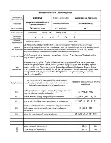 Zamiejscowy Wydział Leśny w Hajnówce Nazwa programu kształcenia (kierunku) Leśnictwo Poziom i forma studiów studia I stopnia stacjonarne Specjalność: Gospodarowanie na obszarach przyrodniczo cennych Ścieżka dyplomowania: ogólnoakademicki Nazwa przedmiotu: Fitopatologia leśna Kod przedmiotu: L4027 Rodzaj przedmiotu: Liczba godzin w semestrze: Przedmioty wprowadzające obowiązkowy Semestr: W - 15 C- IV Punkty ECTS L- 30 P- 4 Ps- Wpisz przedmioty lub "-" SBotanika leśna Uzyskanie wiedzy dotyczącej podstaw budowy grzybów: umiejętność rozpoznawania najważniejszych patogenicznych grzybów leśnych oraz powodowanych przez nie uszkodzeń drzew, poznanie wybranych metod Założenia i cele przedmiotu: wykrywania i identyfikowania patogenów oraz ograniczania ich występowania. Poznanie roli grzybów w ekosystemach leśnych oraz podstaw ochrony gatunków zagrożonych wyginięciem. Forma zaliczenia Treści programowe: Wykład - egzamin ustny, ćwiczenia - sprawdziany pisemne. Przygotowanie zbioru i zaliczenie z rozpoznawania grzybów. Charakterystyka grzybów. Grzyby w biocenozie lasu, grzyby owadobójcze, zarys systematyki, charakterystyka wybranych rzędów, rodzin i gatunków występujących w lesie. Patogeny pędów i nasion, pni i korzeni. Patogeniczne grzyby drzewostanów iglastych i liściastych. Ochrona drewna przed grzybami rozkładu. Introdukcje obcych gatunkó patogenów . Metody prewencji i ograniczania rozwoju szkodliwych grzybów w leśnictwie. Rola grzybów w ekosystemach leśnych. Ochrona zagrożonych gatunków. Odniesienie do kierunkowych efektów kształcenia EK1 Definiuje podstawowe pojęcia z zakresu fitopatologii, takie jak choroba, etiologia, symptomatologia itp. L1_W05, L1_W06 EK2 opisuje wybrane metody zintegrowanej ochrony roślin L1_U07,L1_U01, L1_U05 EK3 rozpoznaje i klasyfikuje grzybowe patogeny w ekosystemie L1_U07, L1_U06,L1_U01 EK4 znajduje uszkodzenia drzew, rozróżnia ich przyczyny, określa podstawowe gatunki patogenó powodujących wskazane uszkodzenia EK5 zestawia i omawia zasady ochrony gatunków y studenta (w godzinach) Efekty kształcenia Zapisać minimum 4, maksimum 8 efektów kształcenia zachowując kolejność: wiedza-umiejętności-kompetencje. Każdy efekt kształcenia musi być weryfikowalny. L1_U07, L1_U11 L1_W05, L1_W16,L1_K01 Udział w zajęciach laboratoryjnych 10x3h 30h Udział w zajęciach wykładowych 15x1h 15h Bilans nakładu pracy studenta (w godzinach) Wskaźniki ilościowe Opracowanie sprawozdań 5X2h 10h Udział w konsultacjach związanych z laboratorium 5X1h 5h Przygotowanie do sprawdzianów i zajęć laboratoryjnych 5X2h 10h 8h+2h 10 10h 10h RAZEM: 90 Przygotowanie do egzaminu i obecność na egzaminie Zebranie materiału świeżego i zaliczenie gatunków zebranych grzybów Nakład pracy studenta związany z zajęciami wymagającymi bezpośredniego udziału nauczyciela: 30+15+5+2+10 Nakład pracy studenta związany z zajęciami o charakterze praktycznym: 30+10+5+10+10+10 ECTS 62 2,5 75 3 Literatura podstawowa: 1. Mańka K. Fitopatologia Leśna wyd. VI, PWRiL, 2005. 2. Fiedorow Z., Gołębniak B., Weber Z. Fitopatologia ogólna. Wydawnictwo Akademii Rolniczej w Poznaniu, 2001. 3.Kozłowska M., Konieczny G. Biologia odporności roślin na patogeny i szkodniki. Wydawnictwo Akademii Rolniczej w Poznaniu, 2003. Literatura uzupełniająca: 1. Ainsworth G.C. A general purpose classification of fungi. Bibliography of Systematic Mycology. Kew, Surrey: Commonwealth Mycological Institute, 1966 Nr efektu kształcenia Metoda weryfikacji efektu kształcenia Forma zajęć (jeśli jest więcej niż jedna), na której zachodzi weryfikacja EK1 kolokwium zaliczajace wykład, sprawdzian przed cw. Lab W,L EK2 kolokwium zaliczajace wykład, sprawdzian przed cw. Lab W,L EK3 sprawozdanie z ćwiczenia L EK4 sprawozdanie z ćwiczenia lab., obserwacja pracy na zajęciach L EK5 Egzamin W Jednostka realizująca: ZWL PB Hajnówka Osoby prowadzące: Tomasz Oszako Data opracowania programu: 20.02.2012 Program opracował(a): dr hab.Tomasz Oszako