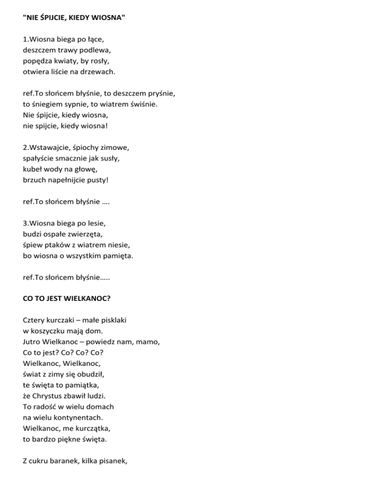 "NIE ŚPIJCIE, KIEDY WIOSNA" 1.Wiosna biega po łące, deszczem trawy podlewa, popędza kwiaty, by rosły, otwiera liście na drzewach. ref.To słońcem błyśnie, to deszczem pryśnie, to śniegiem sypnie, to wiatrem świśnie. Nie śpijcie, kiedy wiosna, nie spijcie, kiedy wiosna! 2.Wstawajcie, śpiochy zimowe, spałyście smacznie jak susły, kubeł wody na głowę, brzuch napełnijcie pusty! ref.To słońcem błyśnie …. 3.Wiosna biega po lesie, budzi ospałe zwierzęta, śpiew ptaków z wiatrem niesie, bo wiosna o wszystkim pamięta. ref.To słońcem błyśnie….. CO TO JEST WIELKANOC? Cztery kurczaki – małe pisklaki w koszyczku mają dom. Jutro Wielkanoc – powiedz nam, mamo, Co to jest? Co? Co? Co? Wielkanoc, Wielkanoc, świat z zimy się obudził, te święta to pamiątka, że Chrystus zbawił ludzi. To radość w wielu domach na wielu kontynentach. Wielkanoc, me kurczątka, to bardzo piękne święta. Z cukru baranek, kilka pisanek, pieczywo, sól i pieprz, mama szykuje mały koszyczek, dzieci go będą nieść. Wielkanoc, Wielkanoc, świat z zimy się obudził, te święta to pamiątka, że Chrystus zbawił ludzi. To radość w wielu domach na wielu kontynentach, Wielkanoc, me kurczątka, to bardzo piękne święta. TYDZIEŃ Tydzień dzieci miał siedmioro: „Niech się tutaj wszystkie zbiorą!” Ale przecież nie tak łatwo radzić sobie z liczną dziatwą: Poniedziałek już od wtorku poszukuje kota w worku, Wtorek środę wziął pod brodę: „Chodźmy sitkiem czerpać wodę” Czwartek w górze igłą grzebie I zaszywa dziury w niebie. Chcieli pracę skończyć w piątek, A to ledwie był początek. Zamyśliła się sobota; „Toż dopiero jest robota!” Poszli razem do niedzieli, Tam porządnie odpoczęli. Tydzień drapie się w przedziałek: ”No , a gdzie jest poniedziałek?” Poniedziałek już od wtorku Poszukuje kota w worku.