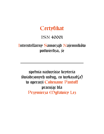 Certyfikat ISN 40001 Interstellarny Samorząd Najemników potwierdza, że ___________________________ spełnia najwyższe kryteria świadczonych usług, co wykazał(a) w operacji Codename Pantoff pracując dla Przymierza Mgławicy Lez Pakt Sprofanowanych Relikwi Książę Demonów 3. i 8. Piekła, Arcyzbereźnik Pangalaktyczny, Włodarz Mocy Hiperspaczonej, Deflorator Osnowy Xsio'vkhdher-pah zawiera oto niniejszy Pakt z ________________________ którego to paktu gwarantem są zbeszczeszczone zwłoki sługi fałszywego imperatora, Heina Pantoffa, które sygnatariusze wspólnie obsikali Zaświadczenie o Czystości Arcylord Generallissimus Sektora Karis niniejszym zaświadcza, że ________________________ wykazał się najwyższą czystością, ucieleśnioną w błogosławieństwie Imperatora, które pozwoliło mu dokonać wielkiego czynu wyrwania ze zbrojnych nibynóżek Obcych relikwii św. Męczennika Heina Pantoffa, który poległ w obronie C'tsi Niech Imperator prowadzi!
