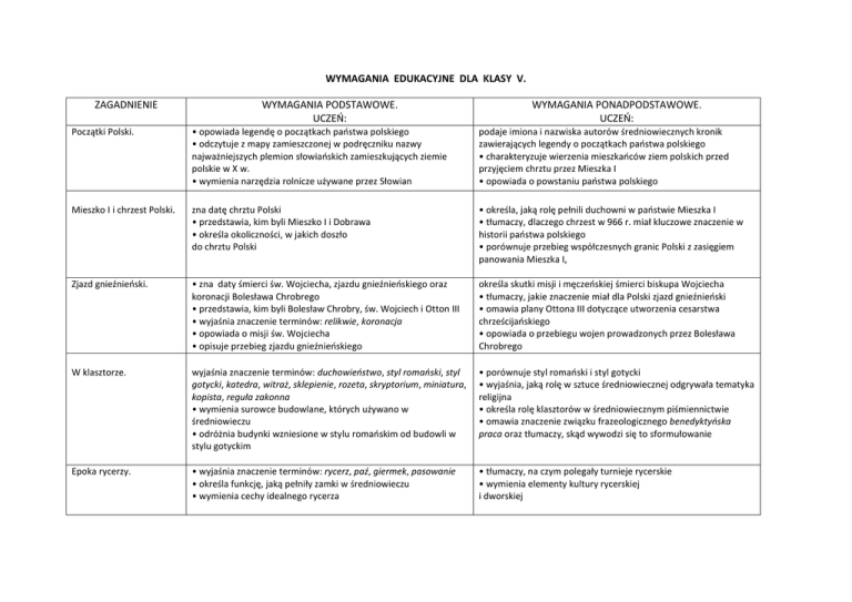 WYMAGANIA EDUKACYJNE DLA KLASY V. ZAGADNIENIE WYMAGANIA PODSTAWOWE. UCZEŃ: WYMAGANIA PONADPODSTAWOWE. UCZEŃ: Początki Polski. • opowiada legendę o początkach państwa polskiego • odczytuje z mapy zamieszczonej w podręczniku nazwy najważniejszych plemion słowiańskich zamieszkujących ziemie polskie w X w. • wymienia narzędzia rolnicze używane przez Słowian podaje imiona i nazwiska autorów średniowiecznych kronik zawierających legendy o początkach państwa polskiego • charakteryzuje wierzenia mieszkańców ziem polskich przed przyjęciem chrztu przez Mieszka I • opowiada o powstaniu państwa polskiego Mieszko I i chrzest Polski. zna datę chrztu Polski • przedstawia, kim byli Mieszko I i Dobrawa • określa okoliczności, w jakich doszło do chrztu Polski • określa, jaką rolę pełnili duchowni w państwie Mieszka I • tłumaczy, dlaczego chrzest w 966 r. miał kluczowe znaczenie w historii państwa polskiego • porównuje przebieg współczesnych granic Polski z zasięgiem panowania Mieszka I, Zjazd gnieźnieński. • zna daty śmierci św. Wojciecha, zjazdu gnieźnieńskiego oraz koronacji Bolesława Chrobrego • przedstawia, kim byli Bolesław Chrobry, św. Wojciech i Otton III • wyjaśnia znaczenie terminów: relikwie, koronacja • opowiada o misji św. Wojciecha • opisuje przebieg zjazdu gnieźnieńskiego określa skutki misji i męczeńskiej śmierci biskupa Wojciecha • tłumaczy, jakie znaczenie miał dla Polski zjazd gnieźnieński • omawia plany Ottona III dotyczące utworzenia cesarstwa chrześcijańskiego • opowiada o przebiegu wojen prowadzonych przez Bolesława Chrobrego W klasztorze. wyjaśnia znaczenie terminów: duchowieństwo, styl romański, styl gotycki, katedra, witraż, sklepienie, rozeta, skryptorium, miniatura, kopista, reguła zakonna • wymienia surowce budowlane, których używano w średniowieczu • odróżnia budynki wzniesione w stylu romańskim od budowli w stylu gotyckim • porównuje styl romański i styl gotycki • wyjaśnia, jaką rolę w sztuce średniowiecznej odgrywała tematyka religijna • określa rolę klasztorów w średniowiecznym piśmiennictwie • omawia znaczenie związku frazeologicznego benedyktyńska praca oraz tłumaczy, skąd wywodzi się to sformułowanie Epoka rycerzy. • wyjaśnia znaczenie terminów: rycerz, paź, giermek, pasowanie • określa funkcję, jaką pełniły zamki w średniowieczu • wymienia cechy idealnego rycerza • tłumaczy, na czym polegały turnieje rycerskie • wymienia elementy kultury rycerskiej i dworskiej Średniowieczne miasto. • wyjaśnia znaczenie terminów: mieszczanin, rzemieślnik, kupiec, samorząd miejski • opowiada o średniowiecznym mieście i jego mieszkańcach Średniowieczna wieś. • wyjaśnia znaczenie terminów: sołtys, pług, trójpolówka • tłumaczy, na czym polegała praca chłopów • porównuje los chłopa z życiem rycerza lub mieszczanina • tłumaczy, jaką rolę odgrywali w średniowiecznym mieście burmistrz i członkowie ławy miejskiej • wyjaśnia pochodzenie nazw współczesnych ulic, np. Szewska • omawia przebieg procesu lokacji wsi • przedstawia, jak zmieniały się metody produkcyjne wykorzystywane w średniowiecznym rolnictwie Krzyżacy nad Bałtykiem. • opowiada, co wydarzyło się w latach 1226, 1308, 1320 i 1331, • tłumaczy, kim byli Konrad Mazowiecki i Władysław Łokietek • wyjaśnia znaczenie terminów: Prusy, zakon krzyżacki, wielki mistrz • podaje powody, dla których Konrad Mazowiecki sprowadził Krzyżaków do Polski • omawia rolę Władysława Łokietka w procesie zjednoczenia ziem polskich • określa przyczyny konfliktu polsko-krzyżackiego • określa okoliczności powstania zakonu krzyżackiego • wymienia skutki sprowadzenia Krzyżaków do Polski • ocenia politykę Krzyżaków i działalność zakonu na podbitych terenach • wyjaśnia, jakie znaczenie dla Polski miała utrata Pomorza Gdańskiego • wskazuje czynniki, które umożliwiły ponowne zjednoczenie ziem polskich Polska Kazimierza Wielkiego. • wskazuje, co wydarzyło się w latach 1333, 1364 i 1370, • wyjaśnia, kim byli Kazimierz Wielki i Mikołaj Wierzynek • wymienia osiągnięcia Kazimierza Wielkiego • tłumaczy, dlaczego królowi Kazimierzowi nadano przydomek Wielki • ocenia politykę wewnętrzną i politykę zagraniczną Kazimierza Wielkiego • wyjaśnia sens powiedzenia, według którego król Kazimierz zastał Polskę drewnianą, a zostawił murowaną Jadwiga i Jagiełło. • opowiada, co wydarzyło się w latach 1385, 1410 i 1411, • przedstawia, kim byli: Jadwiga, Władysław Jagiełło, Ulrich von Jungingen, Kazimierz Jagiellończyk • wyjaśnia znaczenie terminu unia • określa przyczyny i skutki zawarcia unii polsko-litewskiej w 1385 r • przedstawia przebieg bitwy pod Grunwaldem • opowiada o okolicznościach objęcia tronu przez Jadwigę • określa na podstawie drzewa genealogicznego pokrewieństwo łączące przedstawicieli dynastii Piastów i Andegawenów • podaje przyczyny i skutki wojen z Krzyżakami • porównuje przebieg dwóch wojen z Krzyżakami, które prowadziła Polska w XV w., Wielkie odkrycia geograficzne. • wskazuje, co wydarzyło się w latach 1488, 1492, 1498 i 1519, • wyjaśnia, kim byli Bartłomiej Diaz, Vasco da Gama, Krzysztof Kolumb i Ferdynand Magellan • omawia przyczyny odkryć geograficznych • wymienia głównych odkrywców i ich dokonania, • wskazuje na mapie lądy odkryte w XV i XVI wieku oraz trasy, które przebyli Bartłomiej Diaz, Vasco da Gama, Krzysztof Kolumb i Ferdynand Magellan Skutki odkryć geograficznych. • wyjaśnia, kim byli Cortez i Pizarro • określa pozytywne i negatywne skutki odkryć geograficznych • wymienia ludy podbite przez konkwistadorów • tłumaczy, jakie znaczenie dla krajów europejskich miały kolonie • wymienia państwa, które wzięły udział w odkryciach geograficznych Odrodzenie nauki. • określa