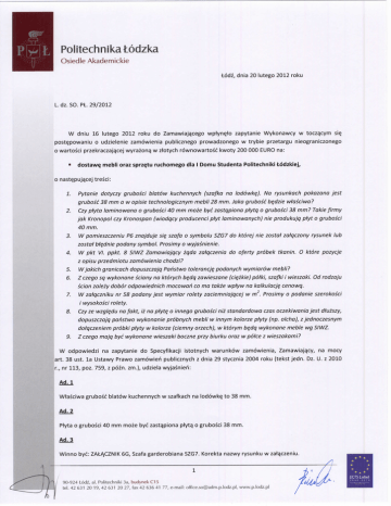 Politechnikatodzka Osiedle Akademickie todz, dnia 20 lutego 2012 roku L. dz. SO. PL 29/2012 W dniu 16 lutego 2012 roku do Zamawiajgcego wptyne.to zapytanie Wykonawcy w tocza.cym si? poste.powaniu o udzielenie zamowienia publicznego prowadzonego w trybie przetargu nieograniczonego o wartosci przekraczaja_cej wyrazona. w ztotych rownowartosc kwoty 200 000 EURO na: • dostawe. mebli oraz sprze.tu ruchomego dla I Domu Studenta Politechniki todzkiej, o nast^pujqcej tresci: 1. Pytanie dotyczy grubosci blatow kuchennych (szafka na Iod6wke_). Na rysunkach pokazana jest grubosc 38 mm a w opisie technologicznym mebli28 mm. Jaka grubosc bqdzie wtasciwa? 2. Czy ptyta laminowana o grubosci 40 mm maze bye zastqpiona ptytq o grubosci 38 mm? Takiefirmy jak Kronopol czy Kronospan (wiodqcy producenci ptyt laminowanych) nie produkujq ptyt o grubosci 40mm. 3. W pomieszczeniu P6 znajduje sie_ szafa o symbolu SZG7 do ktorej nie zostat zatqczony rysunek lub zostat btqdnie podany symbol. Prosimy o wyjasnienie. 4. W pkt VI. ppkt. 8 SIWZ Zamawiajqcy zqda zatqczenia do oferty probek tkanin. 0 ktore pozycje z opisu przedmiotu zamowienia chodzi? 5. Wjakich granicach dopuszczajq Panstwo tolerancje. podanych wymiarow mebli? 6. Z czego sq wykonane sciany na ktorych be_dq zawieszane (ciezkie) potki, szafki i wieszaki. Od rodzaju scian zalezy dobor odpowiednich mocowah co ma takze wptyw na kalkulacje_ cenowq. 7. W zatqczniku nr 58 podany jest wymiar rolety zaciemniajqcej w m2. Prosimy o podanie szerokosci 8. Czy ze wzgle_du na fakt, iz na ptyte. o innego gruboscinizstandardowa czas oczekiwania jest dtuzszy, i wysokosci rolety. dopuszczajq panstwo wykonanie probnych mebli w innym kolorze ptyty (np. olcha), z jednoczesnym dotqczeniem probki ptyty w kolorze (ciemny orzech), w ktorym bqdq wykonane meble wg SIWZ. 9. Z czego majq bye wykonane wieszaki boczne przy biurku oraz w potce z wieszakami? W odpowiedzi na zapytanie do Specyfikacji istotnych warunkow zamowienia, Zamawiajqcy, na mocy art. 38 ust. la Ustawy Prawo zamowieh publicznych z dnia 29 stycznia 2004 roku (tekst jedn. Dz. U. z 2010 r., nr 113, poz. 759, z pozn. zm.), udziela wyjasnieh: Ad. 1 Wtasciwa grubosc blatow kuchennych w szafkach na lodowkQ to 38 mm. Ad. 2 Ptyta o grubosci 40 mm moze bye zastqpiona ptyta. o grubosci 38 mm. Ad. 3 Winno bye: ZAt/^CZNIK 6G, Szafa garderobiana SZG7. Korekta nazwy rysunku w zata.czeniu. 90-924 Lodz, al. Politechniki 3a, budynek C15 tel. 42 631 20 19, 42 631 20 27, fax 42 636 41 77, e-mail: [email protected], www.p.lodz.pl Ad. 4 Do oferty nalezy zatqczyc probki tkanin tapicerowanych, ktorych nie obejmuje wyposazenie pokoju ,,testowego", tj.: Fotel F01 (zata.cznik 17), Fotel FO2 (zata.cznik 18), Kanapa SO (zatqcznik 19). Ad. 5 Meble nalezy wykonac zgodnie z ,,Projektem wyposazenia w meble i sprze.t ruchomy I Domu Studenta Politechniki todzkiej". Ad. 6 Sciany, na ktorych be_da. zawieszane (cie.zkie) potki, szafki i wieszaki wykonane sa. z zelbetu lub cegty obtozonej ptyta. GKB na ,,plackach". Cze_sciowo sa. to rowniez sciany w konstrukcji systemowej stalowej obtozone dwustronnie ptyta. GKB. Ad. 7 Rolety zaciemniaja.ce (ROZ) - zatqcznik 58, nie wyst^puja. w Formularzu kalkulacyjnym (zatqcznik nr 2A, 2B i 2C do SIWZ) w zwiqzku z powyzszym asortymentu nie nalezy uwzgl^dniac w ofercie. Ad. 8 Zamawiajqcy nie dopuszcza wykonania probnych mebli w kolorze innym niz przewidziany w ,,Projekcie wyposazenia w meble i sprz^t ruchomy budynku I Domu Studenta Politechniki todzkiej". Ad. 9 Wieszaki boczne przy biurach i wieszaki w potce z wieszakami winne zostac wykonane z gie.tego ptaskownika. Z powazaniem mgr Jantna-Mr Specjalisl ds. zamowiefi publicznych Osiedla ^kjtdetaMfckiego Ft / gr Ilona Biniek ZALA.CZNIK 00 E O 6G SZG7 Szafa garderobiana - plyta laminowana (melamina) w kolorze D9450 wg wzornika Kronopol lub rownowaznym - kraw^dzie wykonczone obrzezem PVC 1mm w kolorze zblizonym do koloru pfyty - uchwyt aluminiowy UKW7 firmy ZOBAL lub rownowazny O O O X O Q ILOSC O 'PROJEK.T WYPOSAZENIA W MEBLE I SPRZE^T RUCHOMY BUDYNKU I DOMU STUDENTA POLITECHNIKI LODZKIEJ ES KWADRAT Studio Architektoniczne; 94-042 Lodz; Wojewodzkiego 2/18; mail: [email protected]