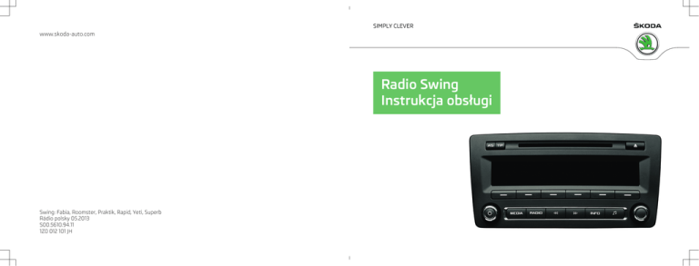 SIMPLY CLEVER www.skoda-auto.com Radio Swing Instrukcja obsługi Swing: Fabia, Roomster, Praktik, Rapid, Yeti, Superb Rádio polsky 05.2013 S00.5610.94.11 1Z0 012 101 JH Układ niniejszej instrukcji obsługi (objaśnienia) Niniejsza instrukcja została opracowana według określonych reguł, aby ułatwić wyszukiwanie i uzyskiwanie potrzebnych informacji. Na początku niniejszej instrukcji obsługi znajduje się spis treści, w którym zostały kolejno wymienione wszystkie opisane tematy. Informacje o kierunku Wszelkie informacje o kierunku, jak „z lewej“, „z prawej“, „z przodu“, „z tyłu“ są podane względem kierunku jazdy samochodu. Objaśnienia symboli Oznacza koniec podrozdziału. Oznacza kontynuację podrozdziału na następnej stronie. ® Oznacza zarejestrowany znak towarowy. Wskazówki UWAGA Najważniejsze wskazówki są oznaczone tytułem UWAGA. UWAGA wskazuje na grożące niebezpieczeństwo wypadku lub zranienia. OSTROŻNIE Wskazówka Ostrożnie zwraca uwagę na możliwość uszkodzenia samochodu (np. uszkodzenia skrzyni biegów) lub na zagrożenie spowodowania wypadku. Informacja Zwykła Wskazówka zwraca uwagę na ważne informacje na temat użytkowania samochodu. Indeks Informacje ogólne Ważne wskazówki 2 Zabezpieczenie przeciwkradzieżowe 2 Opis i obsługa urządzenia 3 Ustawienia urządzenia 4 Radio Obsługa 6 Odtwarzacz CD Obsługa 8 Źródła zewnętrzne Obsługa 11 Indeks 1 Czyszczenie wyświetlacza Informacje ogólne OSTROŻNIE Ważne wskazówki Do czyszczenia nie należy stosować rozpuszczalników takich, jak benzyna lub terpentyna, ponieważ substancje tego typu wchodzą w reakcję z powierzchnią wyświetlacza. ■ Z wyświetlaczem należy postępować delikatnie, ponieważ naciskanie palcem lub dotykanie ostrymi przedmiotami może powodować wgniecenia i zadrapania. ■ Wprowadzenie W niniejszej instrukcji obsługi zostały opisane wszystkie dostępne wersje wyposażenia samochodu, nie są one jednak opisane jako wyposażenie specjalne, wariant modelu lub wyposażenie przeznaczone dla określonego rynku. Informacja Dlatego w samochodzie mogą nie występować wszystkie elementy wyposażenia, opisane w tej instrukcji obsługi. Odciski palców na wyświetlaczu można czyścić miękką szmatką, ewentualnie nasączoną czystym alkoholem. Zakres wyposażenia samochodu jest opisany w dokumentach sprzedaży otrzymanych przy jego zakupie. Dalsze informacje można otrzymać od właściwego dealera ŠKODA. Ilustracje mogą w pewnych szczegółach wyglądać inaczej niż w przypadku Państwa samochodu – mają one wyłącznie ogólne znaczenie informacyjne. Zabezpieczenie przeciwkradzieżowe Obsługa urządzenia jest możliwa tylko wtedy, gdy rzeczywiście pozwala na to aktualna sytuacja na drodze. W przypadku odłączenia i ponownego podłączenia akumulatora najpierw włączać zapłon, a dopiero potem radioodtwarzacz. UWAGA Jeżeli radioodtwarzacz ma być zamontowany w innym pojeździe, należy wprowadzić kod bezpieczeństwa. W takim przypadku należy skorzystać z pomocy specjalistycznej stacji obsługi ŠKODA. ■ 2 Informacje ogólne Kodowanie przeciwkradzieżowe Radioodtwarzacz jest wyposażony w układ kodowania komfortowego. Podczas pierwszego uruchomienia kod bezpieczeństwa zapamiętywany jest nie tylko w radioodtwarzaczu, ale również w samochodzie. Obsługa urządzenia Należy się koncentrować przede wszystkim na kierowaniu samochodem! Kierowca ponosi pełną odpowiedzialność za obsługę pojazdu. ■ Z urządzenia należy korzystać tylko w sposób umożliwiający pełną kontrolę nad samochodem w każdej sytuacji na drodze – istnieje niebezpieczeństwo wypadku! ■ Ustawić głośność w taki sposób, aby akustyczne sygnały z zewnątrz, na przykład syreny ostrzegawcze pojazdów uprzywilejowanych, takich jak pojazdy policji, karetki pogotowia i pojazdy straży pożarnej, były zawsze słyszalne. ■ Zbyt duża głośność może powodować uszkodzenia słuchu! Ze względu na to, że urządzenie działa tylko po wprowadzeniu kodu bezpieczeństwa, jego użytkowanie w przypadku kradzieży jest praktycznie niemożliwe. W ten sposób przyczynia się ono do większego zabezpieczenia przeciwkradzieżowego. Informacja Kod jest zapamiętywany w zestawie wskaźników. Dzięki temu jest on rozkodowywany automatycznie (kodowanie komfortowe) Z tego względu przy codziennym użytkowaniu ręczne wprowadzanie kodu nie jest wymagane. Opis i obsługa urządzenia Wprowadzanie kodu › Włączyć radio przy włączonym zapłonie. › Za pomocą przycisków funkcyjnych 1 - 4 12 wprowadzić kod bezpieczeństwa. › Potwierdzić kod bezpieczeństwa naciskając przycisk funkcyjny 6 12 . Opis urządzenia W wypadku wprowadzenia błędnego kodu, operację będzie można jeszcze raz powtórzyć. W przypadku ponownego wprowadzenia nieprawidłowego kodu, urządzenie zablokuje się na około jedną godzinę. Dopiero po upływie jednej godziny, w czasie której urządzenie i zapłon muszą być włączone, można ponownie spróbować wprowadzić numer kodu. Cykl – dwie próby, godzina blokady – zostaje zachowany. Rys. 1 Przegląd urządzenia 1 2 3 4 5 - Regulator do włączania i wyłączania radia do regulacji głośności (obrót) Gałka menu › do otwierania ustawień menu parametrów radia i odtwarzacza CD › do włączania funkcji Scan Przycisk MEDIA do uruchamiania odtwarzania źródeł dźwięku. Przycisk RADIO do uruchamiania radia. Przyciski › szybkie wyszukiwanie stacji radiowych przy włączonym radiu › wybór tytułu podczas odtwarzania płyty CD, szybkie odtwarzanie płyty CD do przodu i wstecz › › Informacje ogólne 3 6 7 8 9 10 11 12 Przycisk INFO widok radiowych informacji tekstowych widok informacji dodatkowych z płyt MP3 Przycisk do ustawiania brzmienia Przycisk AS do automatycznego zapamiętywania stacji Przycisk TP do włączenia odbioru komunikatów drogowych Otwór na płyty CD Przycisk wysuwania CD Przyciski funkcyjne ›