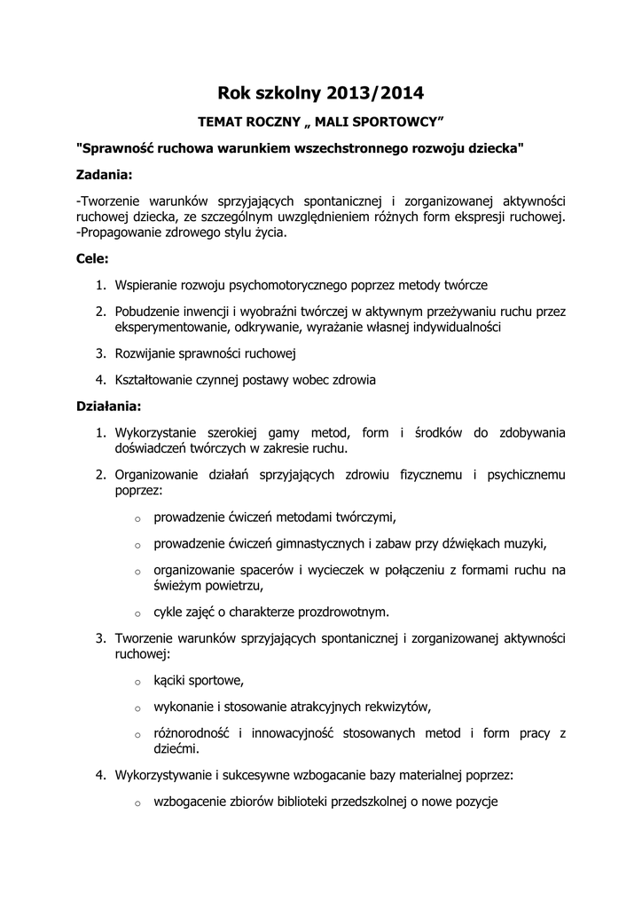 Rok szkolny 2013/2014 TEMAT ROCZNY „ MALI SPORTOWCY” "Sprawność ruchowa warunkiem wszechstronnego rozwoju dziecka" Zadania: -Tworzenie warunków sprzyjających spontanicznej i zorganizowanej aktywności ruchowej dziecka, ze szczególnym uwzględnieniem różnych form ekspresji ruchowej. -Propagowanie zdrowego stylu życia. Cele: 1. Wspieranie rozwoju psychomotorycznego poprzez metody twórcze 2. Pobudzenie inwencji i wyobraźni twórczej w aktywnym przeżywaniu ruchu przez eksperymentowanie, odkrywanie, wyrażanie własnej indywidualności 3. Rozwijanie sprawności ruchowej 4. Kształtowanie czynnej postawy wobec zdrowia Działania: 1. Wykorzystanie szerokiej gamy metod, form i środków do zdobywania doświadczeń twórczych w zakresie ruchu. 2. Organizowanie działań sprzyjających zdrowiu fizycznemu i psychicznemu poprzez: o prowadzenie ćwiczeń metodami twórczymi, o prowadzenie ćwiczeń gimnastycznych i zabaw przy dźwiękach muzyki, o organizowanie spacerów i wycieczek w połączeniu z formami ruchu na świeżym powietrzu, o cykle zajęć o charakterze prozdrowotnym. 3. Tworzenie warunków sprzyjających spontanicznej i zorganizowanej aktywności ruchowej: o kąciki sportowe, o wykonanie i stosowanie atrakcyjnych rekwizytów, o różnorodność i innowacyjność stosowanych metod i form pracy z dziećmi. 4. Wykorzystywanie i sukcesywne wzbogacanie bazy materialnej poprzez: o wzbogacenie zbiorów biblioteki przedszkolnej o nowe pozycje o zakup przyborów do ćwiczeń inspirujących dzieci do twórczej aktywności ruchowej 5. Propagowanie zdrowego stylu życia wśród dzieci i ich rodziców poprzez: o prowadzenie działalności diagnostycznej dotyczącej rozwoju dziecka, o prowadzenie różnego rodzaju ćwiczeń, zabaw i gier stymulujących rozwój dzieci, o stosowanie profilaktyki zdrowotnej, o zorganizowanie OLIMPIADY PRZEDSZKOLNEJ, o przekazywanie wiedzy o zdrowym stylu życia, o wspólne ustalanie zdrowych jadłospisów, o hodowlę warzyw w salach. 6. Opracowanie projektów i programów stymulujących rozwój aktywności ruchowej dzieci i promowania zdrowego stylu życia Monitorowanie Dotyczyć będzie sposobów rozwijania spontanicznej i zorganizowanej aktywności ruchowej dziecka, ze szczególnym uwzględnieniem różnych form ekspresji ruchowej oraz propagowanie zdrowego stylu życia. Zastosujemy narzędzia: Wywiad z rodzicami, Ankiety dla nauczycieli, Karty Obserwacji Dzieci, Karty kontroli dokumentacji nauczyciela, Arkusze diagnostyczne do testu na dojrzałość szkolną dzieci, hospitację diagnozującą i doradczo-doskonalącą, oceniającą, Analizę dokumentów i danych. Ewaluacja programu będzie prowadzona na bieżąco w roku szk. 2013/2014, a wyniki zostaną przedstawione na Radzie Pedagogicznej podsumowującej pracę w danym roku oraz na zebraniach z rodzicami w poszczególnych grupach r. Ocena dokonana po jednym roku umożliwi korektę lub prognozowanie kierunku zmian. Oczekiwane efekty: Dzieci: • Uczestniczą w zabawach i ćwiczeniach ruchowych z użyciem przyborów, przyrządów i rekwizytów. • Posługują się pomysłowością i wyobraźnią twórczą w aktywności ruchowej. • Estetycznie poruszają się w czasie i przestrzeni. • Potrafią łączyć ruch z muzyką. • Wykazują sprawność fizyczną. • Posiadają umiejętności i doświadczenia prozdrowotne. • Dbają o własne zdrowie, chronią je i wspomagają.