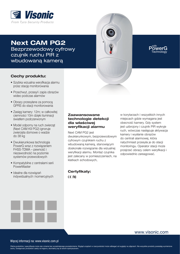 Next CAM PG2 Bezprzewodowy cyfrowy czujnik ruchu PIR z wbudowaną kamerą with PowerG Technology Cechy produktu: •Szybka wizualna weryfikacja alarmu przez stację monitorowania •Przechwyt, przesył i zapis obrazów wideo podczas alarmów •Obrazy przesyłane za pomocą GPRS do stacji monitorowania •Zasięg kamery: 12m; w całkowitej ciemności 10m dzięki iluminacji światłem podczerwonym •Model odporny na ruch zwierząt (Next CAM K9 PG2) ignoruje zwierzęta domowe o wadze do 38 kg •Dwukierunkowa technologia PowerG wraz z rozwiązaniem FHSS-TDMA – pewność i niezawodność na poziomie systemów przewodowych •Kompatybilne z centralami serii PowerMaster •Idealne dla rozwiązań indywidualnych i komercyjnych Zaawansowane technologie detekcji dla właściwej weryfikacji alarmu Next CAM PG2 jest dwukierunkowym, bezprzewodowym cyfrowym czujnikiem ruchu z wbudowaną kamerą, stanowiącym doskonałe rozwiązanie dla wizualnej weryfikacji alarmu. Montaż czujnika jest zalecany w pomieszczeniach, na klatkach schodowych, w korytarzach i wszystkich innych miejscach gdzie wymagana jest obecność kamery. Gdy system jest uzbrojony i czujnik PIR wykryje ruch, wówczas następuje aktywacja kamery i wysłanie obrazów do centrali alarmowej, która natychmiast przesyła je do stacji monitoringu. Operator stacji może przejrzeć obrazy celem weryfikacji i odpowiednio zareagować. Certyfikaty: www.visonic.com Więcej informacji na: www.visonic.com.pl Oferta produktów i specyfikacja może ulec zmianie bez wcześniejszego powiadomienia. Wygląd urządzeń w rzeczywistości może odbiegać od wyglądy na zdjęciach. Nie wszystkie produkty posiadają wymienione cechy. Dostępność produktów zależy od regionu; skontaktuj się ze swoim dystrybutorem. Najważniejsze funkcje i charakterystyka •Wizualna weryfikacja alarmu w czasie rzeczywistym •Rewolucyjna technologia PowerG •Rozwiązanie FHSS – jakość i pewność na poziomie sprzętów wojskowych •W pełni zsynchronizowana i dwukierunkowa sieć bezprzewodowa TDMA – szybka komunikacja i zwiększona efektywność kanałów •Komunikacja bezprzewodowa szyfrowana AES-128 – odpowiada najbardziej wymagającym standardom w branży •Oszczędność kosztów dzięki wyjątkowo niskiemu zużyciu energii •Funkcja natychmiastowego obrazu: nagrywanie rozpoczyna się dokładnie w momencie wykrycia ruchu •Kamera CMOS dzień i noc, z iluminacją światłem podczerwonym •Wersja odporna na ruch zwierząt korzysta z technologii Target Specific Imaging do rozróżnienia człowieka i zwierzęcia o wadze do 38 kg •Zaawansowany, opatentowany algorytm True Motion Recognition umożliwia rozróżnienie pomiędzy intruzem a innymi zakłóceniami mogącymi powodować fałszywe alarmy •Brak konieczności regulacji pionowej •Dwa przełączniki antysabotażowe – przedni i tylny •Automatyczne ustawienie jasności i kontrastu kamery poprzez centralę alarmową Pokrycie Next CAM PG2 / Next CAM K9 PG2 Widok z góry 9m (30ft) 6m (20ft) 3m (10ft) 0 3m (10ft) 6m (20ft) 9m (30ft) 036912m 10203040ft Widok z boku 2.4m (8ft) 036912m 10203040ft Specyfikacja czujnika ruchu Częstotliwość: . . . . . . . . . . . . . . . . . . 433, 868, 915 MHz Zasięg: . . . . . . . . . . . . . . . . . . . . . . . . . . . . 12 x 12m / 90° Rodzaj baterii: . . . . . . . 2 x 3V litowa CR-123A lub 2 x 3V CR-17450 Żywotność baterii: . . . . 3 lata (CR-123A) 5 lat (CR-17450) Wysokość montażu: 1,8 do 2,4m (Next CAM) 1,8 do 2,1m (Next CAM K9) Technologia bezprzewodowa: . . . . . . . . . . . . . . . PowerG Wymiary: . . . . . . . . . . . . . . . . . . . . . . . 125 x 63 x 60mm Waga (wraz z baterią): . . . . . . . . . . . . . . . . . . . . . . . 200g Specyfikacja kamery: Temperatura pracy: . . . . . . . . . . . . . . . . . . -10°C do 50°C Rodzaj kamery:........................................................CMOS Ochrona sabotażowa: . . . . . . . . Przedni i tylny przełącznik antysabotażowy Zasięg kamery:.12m w dzień /10m w całkowitej ciemności Kolor i rozdzielczość:...........Kolor/Cz-b: QVGA (320 x 240) QQVGA(160 x 120) Zgodność z normami: . . . . EN 50131-1 Grade 2 Class II, EN 50131-2-2 Klatki na sekundę:..........................do 2 klatek na sekundę Akcesoria opcjonalne: . . . . . . . . . . . . . . Uchwyty ścienne, narożnikowe i sufitowe Kąt kamery:.............................................Szerokokątna 90° Zasilacz: . . . . . . . . . . . . . . . . . . . . . . . . . . . . 110/240VAC Reakcja kamery:........................................Natychmiastowa www.visonic.com Więcej informacji na: www.visonic.com.pl Oferta produktów i specyfikacja może ulec zmianie bez wcześniejszego powiadomienia. Wygląd urządzeń w rzeczywistości może odbiegać od wyglądu na zdjęciach. Nie wszystkie produkty posiadają wymienione cechy. Dostępność produktów zależy od regionu – skontaktuj się ze swoim dystrybutorem.