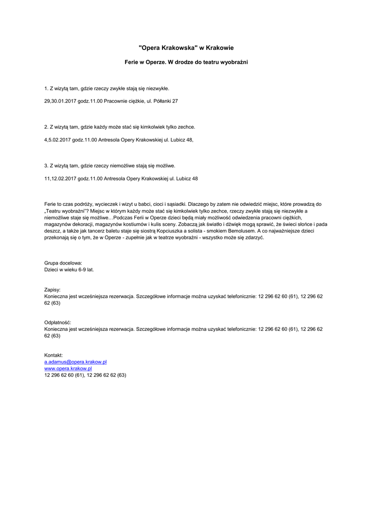 "Opera Krakowska" w Krakowie Ferie w Operze. W drodze do teatru wyobraźni 1. Z wizytą tam, gdzie rzeczy zwykłe stają się niezwykłe. 29,30.01.2017 godz.11.00 Pracownie ciężkie, ul. Półłanki 27 2. Z wizytą tam, gdzie każdy może stać się kimkolwiek tylko zechce. 4,5.02.2017 godz.11.00 Antresola Opery Krakowskiej ul. Lubicz 48, 3. Z wizytą tam, gdzie rzeczy niemożliwe stają się możliwe. 11,12.02.2017 godz.11.00 Antresola Opery Krakowskiej ul. Lubicz 48 Ferie to czas podróży, wycieczek i wizyt u babci, cioci i sąsiadki. Dlaczego by zatem nie odwiedzić miejsc, które prowadzą do „Teatru wyobraźni”? Miejsc w którym każdy może stać się kimkolwiek tylko zechce, rzeczy zwykłe stają się niezwykłe a niemożliwe staje się możliwe…Podczas Ferii w Operze dzieci będą miały możliwość odwiedzenia pracowni ciężkich, magazynów dekoracji, magazynów kostiumów i kulis sceny. Zobaczą jak światło i dźwięk mogą sprawić, że świeci słońce i pada deszcz, a także jak tancerz baletu staje się siostrą Kopciuszka a solista - smokiem Bemolusem. A co najważniejsze dzieci przekonają się o tym, że w Operze - zupełnie jak w teatrze wyobraźni - wszystko może się zdarzyć. Grupa docelowa: Dzieci w wieku 6-9 lat. Zapisy: Konieczna jest wcześniejsza rezerwacja. Szczegółowe informacje można uzyskać telefonicznie: 12 296 62 60 (61), 12 296 62 62 (63) Odpłatność: Konieczna jest wcześniejsza rezerwacja. Szczegółowe informacje można uzyskać telefonicznie: 12 296 62 60 (61), 12 296 62 62 (63) Kontakt: [email protected] www.opera.krakow.pl 12 296 62 60 (61), 12 296 62 62 (63)