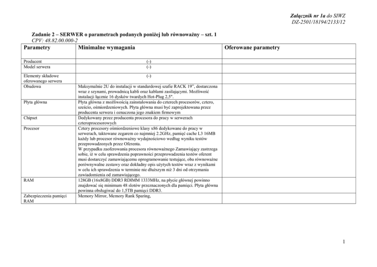 Załącznik nr 1a do SIWZ DZ-2501/18194/2133/12 Zadanie 2 – SERWER o parametrach podanych poniżej lub równoważny – szt. 1 CPV: 48.82.00.000-2 Parametry Minimalne wymagania Oferowane parametry Producent Model serwera (-) (-) Elementy składowe oferowanego serwera Obudowa (-) Płyta główna Chipset Procesor RAM Zabezpieczenia pamięci RAM Maksymalnie 2U do instalacji w standardowej szafie RACK 19”, dostarczona wraz z szynami, prowadnicą kabli oraz kablami zasilającymi. Możliwość instalacji łącznie 16 dysków twardych Hot-Plug 2,5". Płyta główna z możliwością zainstalowania do czterech procesorów, cztero, sześcio, ośmiordzeniowych. Płyta główna musi być zaprojektowana przez producenta serwera i oznaczona jego znakiem firmowym Dedykowany przez producenta procesora do pracy w serwerach czteroprocesorowych Cztery procesory ośmiordzeniowe klasy x86 dedykowane do pracy w serwerach, taktowane zegarem co najmniej 2.2GHz, pamięć cache L3 16MB każdy lub procesor równoważny wydajnościowo według wyniku testów przeprowadzonych przez Oferenta. W przypadku zaoferowania procesora równoważnego Zamawiający zastrzega sobie, iż w celu sprawdzenia poprawności przeprowadzenia testów oferent musi dostarczyć zamawiającemu oprogramowanie testujące, oba równoważne porównywalne zestawy oraz dokładny opis użytych testów wraz z wynikami w celu ich sprawdzenia w terminie nie dłuższym niż 3 dni od otrzymania zawiadomienia od zamawiającego. 128GB (16x8GB) DDR3 RDIMM 1333MHz, na płycie głównej powinno znajdować się minimum 48 slotów przeznaczonych dla pamięci. Płyta główna powinna obsługiwać do 1,5TB pamięci DDR3. Memory Mirror, Memory Rank Sparing, 1 Gniazda PCI Interfejsy sieciowe Interfejsy FC Napęd optyczny Dyski twarde Kontroler dysków Porty Video Elementy redundantne HotPlug Zasilacze Bezpieczeństwo Diagnostyka Karta Zarządzania - Minimum 6 x PCI-Express trzeciej generacji z czego: 4 x PCI-Express x8 trzeciej generacji, 2x PCI-Express x16 trzeciej generacji. Minimum 3 sloty powinny umożliwiać instalację kart pełnej wysokości. Minimum 4 porty typu Gigabit Ethernet Base-T z wsparciem dla protokołu IPv6 oraz możliwością iSCSI boot. Interfejsy sieciowe nie mogą zajmować żadnego z dostępnych slotów PCI-Express. Możliwość instalacji wymiennie modułów udostępniających: 2 porty Gigabit Ethernet Base-T i 2 porty 10Gb Ethernet SFP+ Minimum jedna dwuportowa karta FC QLogic QLE2562 FC8 lub równoważna; kabel FC 2m; Wewnętrzny napęd DVD+/-RW Możliwość instalacji SATA, SAS oraz SSD. Zainstalowane 4 dyski 146GB typu HotPlug SAS6Gb 15krpm skonfigurowane fabrycznie w RAID 10. Dedykowany kontroler RAID. Cache minimum 1GB, z zapisem na nieulotną pamięć w przypadku awarii zasilania, możliwe konfiguracje 0, 1, 10, 5, 50, 6, 60. 5 x USB 2.0 z czego 2 na przednim panelu obudowy, 2 na tylnym panelu obudowy i jeden wewnętrzny, 5 x RJ-45, VGA, 1 port szeregowy Zintegrowana karta graficzna, umożliwiająca rozdzielczość min. 1280x1024. Min. Zasilacze, wentylatory, dyski twarde Redundantne, Hot-Plug maksymalnie 1100W każdy. Zintegrowany z płytą główną moduł TPM. Wbudowany czujnik otwarcia obudowy współpracujący z BIOS i kartą zarządzającą. Zainstalowane 2 wewnętrzne redundantne karty pamięci SD (2x2GB). Możliwość zainstalowania wewnętrznego klucza USB. Panel LCD umieszczony na froncie obudowy, umożliwiający wyświetlenie informacji o stanie procesora, pamięci, dysków, BIOS’u, zasilaniu oraz temperaturze. Niezależna od zainstalowanego na serwerze systemu operacyjnego posiadająca dedykowane złącze RJ-45 Gigabit Ethernet i umożliwiająca: zdalny dostęp do graficznego interfejsu Web karty zarządzającej zdalne monitorowanie i informowanie o statusie serwera (m.in. prędkości obrotowej wentylatorów, konfiguracji serwera, ) szyfrowane połączenie (SSLv3) oraz autentykacje i autoryzację użytkownika możliwość podmontowania zdalnych wirtualnych napędów wirtualną konsolę z dostępem do myszy, klawiatury wsparcie dla IPv6 2 Certyfikaty Zgodność z systemami operacyjnymi Warunki gwarancji wsparcie dla WSMAN (Web Service for Managament); SNMP; IPMI2.0, VLAN tagging, Telnet, SSH możliwość zdalnego monitorowania w czasie rzeczywistym poboru prądu przez serwer możliwość zdalnego ustawienia limitu poboru prądu przez konkretny serwer integracja z Active Directory możliwość obsługi przez dwóch administratorów jednocześnie wsparcie dla dynamic DNS wysyłanie do administratora maila z powiadomieniem o awarii lub zmianie konfiguracji sprzętowej możliwość podłączenia lokalnego poprzez złącze RS-232 karta zarządzająca powinna posiadać możliwość przechowywania konfiguracji następujących podzespołów: karty zarządzającej, kart sieciowych, kontrolera RAID i umożliwiać przywrócenie tych konfiguracji w przypadku wymiany podzespołów wbudowana karta SD 8GB Serwer musi być wyprodukowany zgodnie z normą ISO-9001 oraz ISO-14001. Deklaracja CE. Oferowany sewer musi znajdować się na liście Windows Server Catalog i posiadać status „Certified for Windows” dla systemów Windows Server 2008 R2 x64, x64, x86. Microsoft® Windows Server® 2008 R2 SP1, x64 (z technologią Hyper-V™ v2) SUSE® Linux® Enterprise Server Red Hat® Enterprise Linux Citrix® XenServer™ VMware® vSphere™ Minimum trzy lata gwarancji z czasem reakcji do czterech godzin od zgłoszenia, przyjmowanie zgłoszeń 24 godziny na dobę, 7 dni w tygodniu. Firma serwisująca musi posiadać ISO 9001:2000 na świadczenie usług serwisowych oraz posiadać autoryzacje producenta serwera – dokumenty potwierdzające załączyć do oferty. Oświadczenie producenta serwera, że w przypadku nie wywiązywania się z obowiązków gwarancyjnych oferenta lub firmy serwisującej, przejmie na siebie wszelkie zobowiązania związane z serwisem. W przypadku awarii dysku twardego uszkodzony dysk pozostaje u Zamawiającego. 3 Dokum