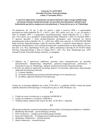Uchwała Nr 16/53/2015 Zarządu Powiatu Namysłowskiego z dnia 17 kwietnia 2015 r. w sprawie ogłoszenia, organizacji i przeprowadzenia I (pierwszego) publicznego przetargu ustnego nieograniczonego na sprzedaż nieruchomości zabudowanej budynkiem garażowo-magazynowym położonej w Namysłowie przy ul. Pułaskiego Na podstawie: art. 32, ust. 2, pkt 2-4 ustawy z dnia 5 czerwca 1998 r. o samorządzie powiatowym (tekst jednolity Dz. U. z 2013 r., poz. 595 z późn. zm.), art. 11, art. 38 ustawy z dnia 21 sierpnia 1997 r. o gospodarce nieruchomościami (tekst jednolity Dz. U. z 2014 r. poz. 518 z późn. zm.), przepisów rozporządzenia Rady Ministrów z dnia 14 września 2004 r. w sprawie sposobu i trybu przeprowadzenia przetargów oraz rokowań na zbycie nieruchomości (tekst jednolity Dz. U. z 2014 poz.1490) oraz uchwały nr XXXVIII/369/2006 Rady Powiatu Namysłowskiego z dnia 28 czerwca 2006 r. w sprawie zasad nabycia, zbycia i obciążania nieruchomości oraz wydzierżawiania lub wynajmowania na okres dłuższy niż trzy lata (Dz. Urz. Woj. Opolskiego Nr 64, poz. 2001) zmienionej Uchwałą Nr IV/36/2015 Rady Powiatu Namysłowskiego z dnia 25 lutego 2015 r. (Dz. Urz. Woj. Opolskiego poz. 545), Zarząd Powiatu Namysłowskiego uchwala, co następuje: §1 1. Ogłasza się I (pierwszy) publiczny przetarg ustny nieograniczony na sprzedaż nieruchomości zabudowanej budynkiem garażowo-magazynowym położonym w Namysłowie przy ul. Pułaskiego, będącej własnością Powiatu Namysłowskiego. 2. Wyraża się zgodę na ogłoszenie przetargu poprzez wywieszenie ogłoszenia, stanowiącego załącznik do niniejszej uchwały: 1) w prasie lokalnej, 2) na stronie internetowej powiatu namysłowskiego www.namyslow.pl, 3) na tablicy ogłoszeń Starostwa Powiatowego. §2 Ustala się, że przetarg odbędzie się w dniu 27.05.2015 r. o godzinie 10:00 w dużej sali narad siedziby Starostwa Powiatowego w Namysłowie przy ul. Plac Wolności 12a §3 1. Ustala się cenę wywoławczą w wysokości 60.000,00 zł. 2. Ustala się wadium w wysokości 3.000,00 zł 1. Wadium należy wpłacać lub wnosić do dnia 22.05.2015 r. włącznie. §4 Dla przeprowadzenia czynności przetargowych powołuje się komisję przetargową w składzie: 1. Bartłomiej Stawiarski – przewodniczący komisji 2. Piotr Lechowicz – zastępca przewodniczącego komisji 3. Krzysztof Żołnowski – II zastępca przewodniczącego komisji 4. Władysław Żółtaniecki – członek komisji 5. Maria Adamczyk – członek komisji 6. Adriana Rzeczkowska – członek komisji §5 Wykonanie uchwały powierza się Staroście Namysłowskiemu. §6 Uchwała wchodzi w życie z dniem podjęcia. Członkowie Zarządu Powiatu Namysłowskiego Przewodniczący Zarządu Powiatu Namysłowskiego 1. Bartłomiej Stawiarski Michał Ilnicki 2. Andrzej Michta 3. Piotr Lechowicz 4. Krzysztof Żołnowski 2 Załącznik nr 1 do Uchwały Nr 16/53/2015 Zarządu Powiatu Namysłowskiego z dnia 17 kwietnia 2015 r. w sprawie ogłoszenia, organizacji i przeprowadzenia I (pierwszego) publicznego przetargu ustnego nieograniczonego na sprzedaż nieruchomości zabudowanej budynkiem garażowo-magazynowym położonej w Namysłowie przy ul. Pułaskiego Zarząd Powiatu Namysłowskiego OGŁASZA I (pierwszy) publiczny przetarg ustny nieograniczony na sprzedaż nieruchomości zabudowanej budynkiem garażowo-magazynowym położonej w Namysłowie przy ul. Pułaskiego 1. Przedmiotem przetargu jest działka nr 851/78 zabudowana budynkiem garażowo magazynowym położona w Namysłowie przy ul. Pułaskiego. Powierzchnia nieruchomości - 0,0581 ha w tym powierzchnia użytkowa budynku garażowo-magazynowego -90 m2, składającego się z 5 boksów o pow. użytkowej po 18 m2 każdy. Działka położona na peryferiach miasta, III linia zabudowy względem ul. Pułaskiego, w sąsiedztwie terenów składowo-magazynowych i budynków Zespołu Szkół Mechanicznych. Aktualny sposób użytkowania nieruchomości - garażowo-magazynowy. Sieć uzbrojenia terenu w e.e., wodę, kanalizację - w pobliżu. Dojazd do nieruchomości będzie zapewniony przez istniejący ciąg komunikacyjny na działce nr 851/77, na której ustanowiona zostanie służebność gruntowa przejazdu i przechodu. Działka zabudowana 5 boksami garażowymi naziemnymi oraz przybudowanym skrajnym boksem gospodarczym - częściowo zagłębionym w ziemi. Wady szczególne: na działkę zachodzi dach budynku położonego na nieruchomości sąsiedniej. Na rzecz właścicieli budynku sąsiadującego na przedmiotowej nieruchomości ustanowiona zostanie służebność konserwacji i napraw tego dachu. W skład nieruchomości wchodzi około 40 letni budynek, jedno kondygnacyjny, niepodpiwniczony, ściany z prefabrykatów, stropodach ognioodporny z płyt korytkowych kryty papą, rynna z blachy ocynkowanej, posadzka cementowa, bramy wjazdowe drewniane - deskowe, wyposażenie w instalacje - e.e. Skrajny boks magazynowy częściowo zagłębiony w ziemi, do którego prowadzą zewnętrzne schody monolityczne. Pokrycie boksu prowizoryczne blachą. Brama wejściowa metalowa. Stan techniczny budynku ocenia się jako średni. Przeznaczenie nieruchomości wg aktualnego miejscowego planu zagospodarowania przestrzennego miasta Namysłów: C.9U. – teren zabudowy usługowej. Nieruchomość ma urządzą księgę wieczystą (bez obciążeń) prowadzoną przez Sąd Rejonowy IV Wydział Ksiąg Wieczystych w Kluczborku: nr OP1U/000160036/6. Nie jest obarczona żadnymi zobowiązaniami. Właścicielem nieruchomości jest Powiat Namysłowski. 2. Cena wywoławcza wynosi 60.000,00 zł brutto (słownie złotych: sześćdziesiąt tysięcy 00/100). Cena wywoławcza oraz cena ustalona w wyniku kolejnych postąpień w trakcie przetargu jest ceną brutto. 3. Minimalna wysokość postąpienia 1.000,00 zł (słownie złotych: jeden tysiąc 00/100). 4. Wadium wynosi 3.000,00 zł (słownie złotych: trzy tysiące 00/100). Wadium może być wpłacane w pieniądzu, albo wnoszone obligacjach