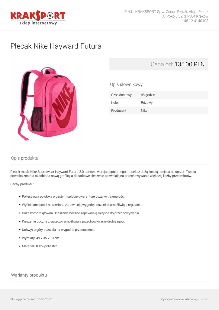 P.H.U. KRAKSPORT Sp.J. Zenon Piętak, Alicja Piętak Al.Pokoju 32, 31-564 Kraków +48 12 4140108 Plecak Nike Hayward Futura Cena od: 135,00 PLN Opis słownikowy Czas dostawy 48 godzin Kolor Różowy Producent Nike Opis produktu Plecak męski Nike Sportswear Hayward Futura 2.0 to nowa wersja popularnego modelu z dużą ilością miejsca na sprzęt. Trwała powłoka została ozdobiona nową grafiką, a dodatkowe kieszenie pozwalają na przechowywanie większej liczby przedmiotów. Cechy produktu: Poliestrowa powłoka o gęstym splocie gwarantuje dużą wytrzymałość. Wyściełane paski na ramiona zapewniają wygodę noszenia i umożliwiają regulację. Duża komora główna i kieszenie boczne zapewniają miejsce do przechowywania. Kieszenie boczne z siateczki umożliwiają przechowywanie drobiazgów. Uchwyt u góry pozwala na wygodne przenoszenie. Wymiary: 49 x 35 x 19 cm. Materiał: 100% poliester. Warianty produktu Plik wygenerowano: 07-03-2017 Oprogramowanie sklepu: AptusShop P.H.U. KRAKSPORT Sp.J. Zenon Piętak, Alicja Piętak Al.Pokoju 32, 31-564 Kraków +48 12 4140108 uniwersalny 135,00 PLN Galeria Plik wygenerowano: 07-03-2017 Powered by TCPDF (www.tcpdf.org) Oprogramowanie sklepu: AptusShop
