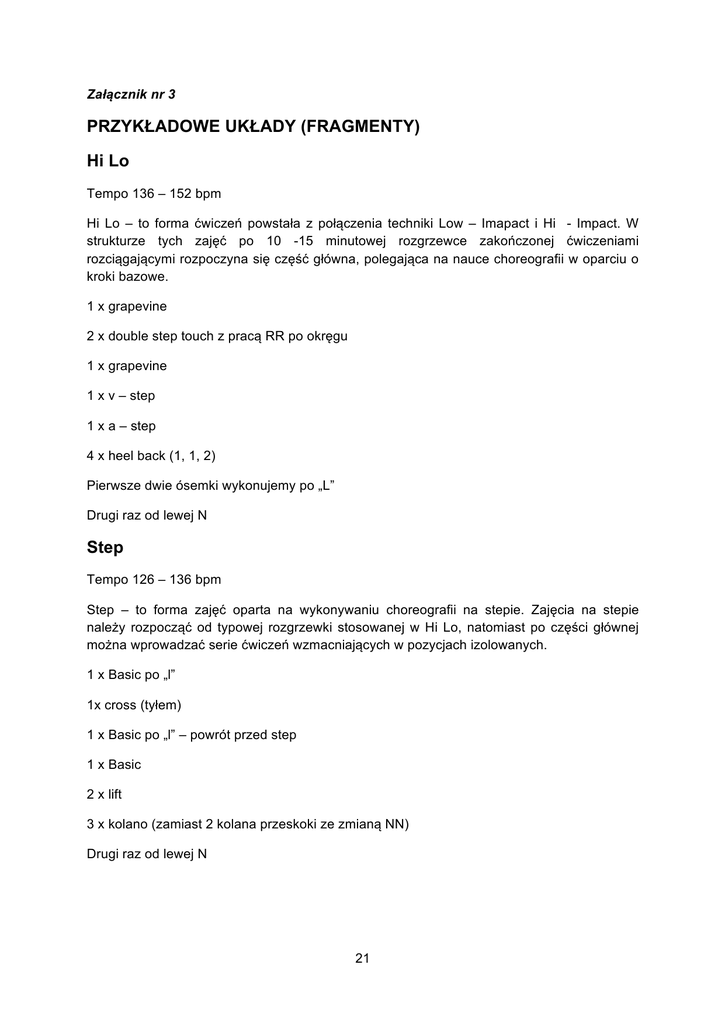 Załącznik nr 3 PRZYKŁADOWE UKŁADY (FRAGMENTY) Hi Lo Tempo 136 – 152 bpm Hi Lo – to forma ćwiczeń powstała z połączenia techniki Low – Imapact i Hi - Impact. W strukturze tych zajęć po 10 -15 minutowej rozgrzewce zakończonej ćwiczeniami rozciągającymi rozpoczyna się część główna, polegająca na nauce choreografii w oparciu o kroki bazowe. 1 x grapevine 2 x double step touch z pracą RR po okręgu 1 x grapevine 1 x v – step 1 x a – step 4 x heel back (1, 1, 2) Pierwsze dwie ósemki wykonujemy po „L” Drugi raz od lewej N Step Tempo 126 – 136 bpm Step – to forma zajęć oparta na wykonywaniu choreografii na stepie. Zajęcia na stepie należy rozpocząć od typowej rozgrzewki stosowanej w Hi Lo, natomiast po części głównej można wprowadzać serie ćwiczeń wzmacniających w pozycjach izolowanych. 1 x Basic po „l” 1x cross (tyłem) 1 x Basic po „l” – powrót przed step 1 x Basic 2 x lift 3 x kolano (zamiast 2 kolana przeskoki ze zmianą NN) Drugi raz od lewej N 21 TBC (Total Body Condition) Tempo 120 – 130 bpm TBC – to moduł zajęć fitness, którego głównym celem jest kształtowanie siły i wytrzymałości mięśni w celu poprawienia ogólnej kondycji fizycznej całego ciała. Cechą charakterystyczną zajęć jest szerokie zastosowanie przyborów i przyrządów. Cardio Ball Tempo 128 – 134 bpm Cardio Ball – to nowoczesne połączenie tradycyjnej formy aerobiku z treningiem stabilizującym wykorzystującym piłki gimnastyczne. Celem jego jest ogólne wzmocnienie całego ciała. Pozwala on poprawić poczucie równowagi, wzmocnić mięśnie posturalne oraz kształtować koordynację ruchową. 1 propozycja : 2 x double step touch +RR wyprosty i zgięcia w stawach łokciowych z piłką (praca RR przód – tył) 2 x j.w. tylko praca RR góra - dół 2 x double step touch + RR kozłowanie piłki o podłoże 2 x doble step touch +podrzut piłki w górę 2 propozycja: 4 x Basic na piłkach 4 x step out siedząc na piłce (za 4 razem zejdź z piłki i weź ją w RR) 4 x krok przód + wznos RR w górę z piłką 4x j.w. tyko powrót w tył 4 x kolano + RR z piłką z góry na dół Taniec współczesny Taniec współczesny charakteryzuje się płynnymi ruchami, krokami wędrownymi w zmiennym rytmie (synkopy) oraz obrotami. Taniec nowoczesny Taniec nowoczesny jest to zbiorcze powiązanie wielu rodzajów i gatunków tańca. 22 Adnotacje i uwagi: 23