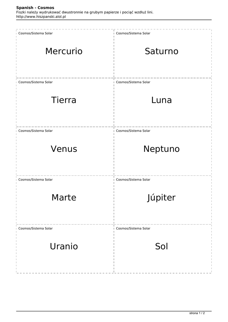 Spanish - Cosmos Fiszki należy wydrukować dwustronnie na grubym papierze i pociąć wzdłuż lini. http://www.hiszpanski.alol.pl Cosmos/Sistema Solar Mercurio Cosmos/Sistema Solar Cosmos/Sistema Solar Saturno Cosmos/Sistema Solar Tierra Cosmos/Sistema Solar Venus Cosmos/Sistema Solar Marte Cosmos/Sistema Solar Uranio Luna Cosmos/Sistema Solar Neptuno Cosmos/Sistema Solar Júpiter Cosmos/Sistema Solar Sol strona 1 / 2 Spanish - Cosmos Fiszki należy wydrukować dwustronnie na grubym papierze i pociąć wzdłuż lini. http://www.hiszpanski.alol.pl Cosmos/Sistema Solar Saturn Cosmos/Sistema Solar Księżyc Cosmos/Sistema Solar Neptun Cosmos/Sistema Solar Cosmos/Sistema Solar Merkury Cosmos/Sistema Solar Ziemia Cosmos/Sistema Solar Wenus Cosmos/Sistema Solar Jowisz Cosmos/Sistema Solar Słońce Mars Cosmos/Sistema Solar Uran strona 2 / 2 Powered by TCPDF (www.tcpdf.org)