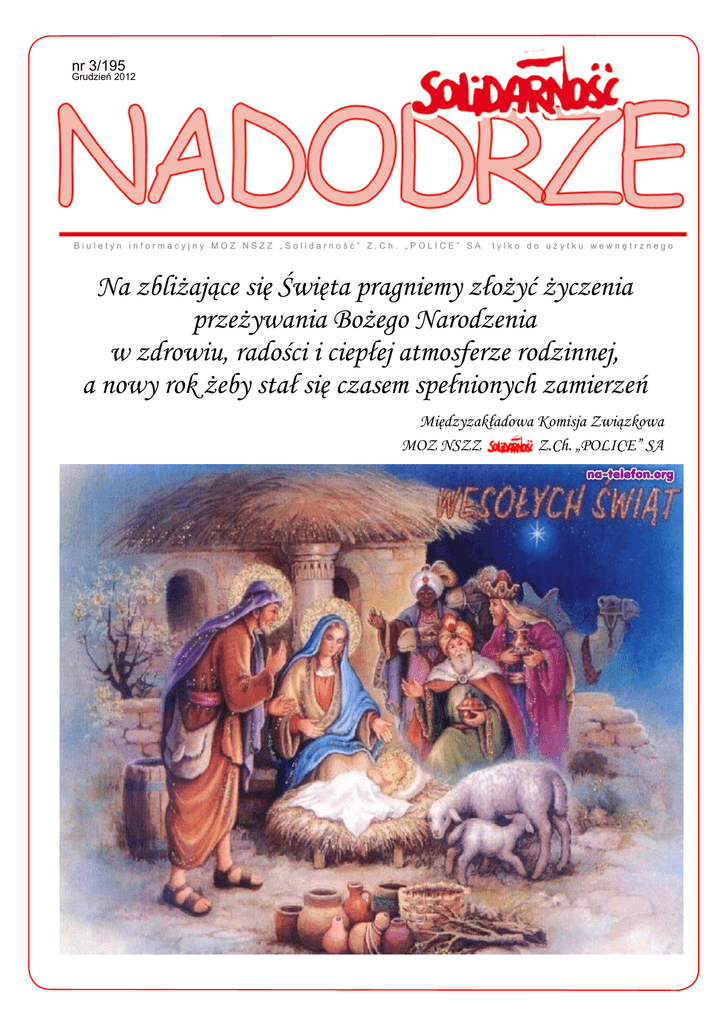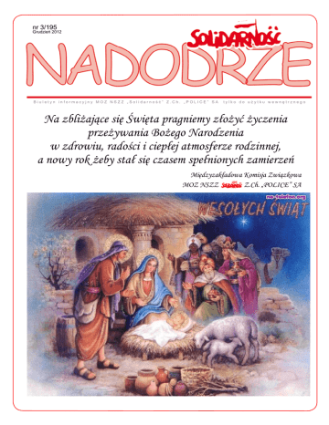 nr 3/195 Grudzień 2012 Biuletyn informacyjny MOZ NSZZ „Solidarność” Z.Ch. „POLICE” SA tylko do użytku wewnętrznego Na zbliżające się Święta pragniemy złożyć życzenia przeżywania Bożego Narodzenia w zdrowiu, radości i ciepłej atmosferze rodzinnej, a nowy rok żeby stał się czasem spełnionych zamierzeń Międzyzakładowa Komisja Związkowa MOZ NSZZ Z.Ch. „POLICE” SA Rozmowy z pracodawcą Trwają rozmowy z pracodawcą na temat funduszu wynagrodzeń na rok 2013 i innych porozumień dotyczących naszego Zakładu m.in. wartościowania stanowisk pracy, dni do odpracowania tzw. „R” dla pracowników zmianowych, skoczka i premii. Negocjacje płacowe Negocjacje płacowe wciąż są w fazie początkowej a strony mają całkowicie odmienne stanowiska. Na pierwszym ze spotkań pięć organizacji związkowych wystąpiło z propozycją podniesienia w roku 2013 funduszu płac o 10 proc. Pięć organizacji uważa, że priorytetem jest uzgodnienie podwyżek systemowych dla wszystkich pracowników, chociażby z tytułu uzyskania dobrych wyników Z.Ch. „POLICE” SA i coraz większych kosztów utrzymania gospodarstw domowych a w przypadku wynegocjowania tych podwyżek trzeba rozmawiać na temat uruchomienia podwyżek indywidualnych oraz podniesienia innych dodatków. Niestety pracodawca na chwilę obecną nie zgadza się na podwyżki argumentując to kryzysem i gorszymi planami na rok przyszły. Wygląda na to, że negocjacje będą trwały dłużej jak dotychczas, lecz mamy nadzieję, że zakończą się porozumieniem pozytywnym dla pracowników. dniach odbędą się następne rozmowy, a w negocjacjach chcemy wiedzieć jakie pieniądze będą uruchomione w celu wprowadzenia nowej siatki płac. Tzw. „R” Pracodawca zgłosił propozycję, aby tzw. „R” mogły być odpracowywane również w środkowych dniach cyklu dni wolnych a nie jak jest obecnie na końcu i początku. Organizacje związkowe zgłosiły propozycje aby odpracowywanie „R” w środku cyklu dni wolnych było możliwe na wniosek pracownika lub w uzgodnieniu z nim. Skoczek Pracodawca chciałby przywrócić funkcję skoczka na zmianach. Organizacje związkowe zgłosiły propozycję, aby w celu zachęcenia pracowników za funkcję skoczka był wypłacany dodatek w wysokości 10 proc. stawki zasadniczej. Premia Na jednym ze spotkań głównym tematem była kontrowersyjna dla pracowników premia. Po dłuższej dyskusji ustalono że premię należy zmodyfikować w kierunku, aby jej wynik bardziej zależał od efektów pracy pracownika i wydziału a nie całego zakładu. Po nowemu 50 proc. premii zależne by było od wydziału, 30 proc. od jednostki a 20 proc od całego zakładu. Obecnie czekamy na projekt zmodyfikowanego regulaminu premiowania. Wartościowanie Po kilkumiesięcznej przerwie pracodawca powrócił do rozmów na temat wartościowania stanowisk pracy. Propozycja pracodawcy jest w tej chwili przez nas analizowana, jest wiele uwag i pytań, organizacje związkowe zawnioskowały o dodatkowe materiały w celu dalszych rozmów. Kilka stanowisk jak również cała siatka płac w nowej propozycji pracodawcy wydaje się być niedowartościowana. W najbliższych 2 Załącznik na stronie 6 3 Podpisy zbieramy w naszej komisji związkowej pok. 39 biurowca głównego Z.Ch. „POLICE” SA tel. 11-65 lub u przewodniczących wydziałowych. 4 5 6 Zmiana koncepcji Tarnowa odnośnie PKCh? 11 grudnia 2012 r. otrzymaliśmy pismo od Prezesa PKCh, w którym się dowiedzieliśmy, że porozumienie w sprawie wniesienia spółek „Remech”, „Automatika” i „Koncept” jest bezprzedmiotowe. O ile nie dziwi nas fakt, że Rada Nadzorcza Zakładów Azotowych Tarnów nie wyraziła zgody na wniesienie naszych spółek do PKCH (nasz związek wielokrotnie zgłaszał uwagi i brak przygotowania do tej decyzji – opisujemy to szerzej na naszej stronie internetowej w zdaniu odrębnym Wiesława Markwasa) to niezrozumiała jest decyzja o wypowiedzeniu, pomimo że porozumienie nie weszło jeszcze w życie. Należy przypomnieć, iż porozumienie zabezpiecza pracowników w przypadku przekazania spółek Remech, Automatika i Koncept do Polskiego Konsorcjum Chemicznego. Podstawowe zabezpieczenia dla pracowników ww. spółek to: -gwarancje pracy przez okres trzech lat, -zobowiązanie PKCH do nie zmieniania siedziby spółki Remech i zachowania odrębności prawnej w ramach PKCh. - zdefiniowanie miejsca pracy dla spółek Remech, Automatika i Koncept jako miasto Police. - zobowiązanie stron porozumienia do przestrzegania obowiązujących aktów zbiorowego prawa pracy i niepodejmowania jednostronnych decyzji zmierzających do ich zmiany. 7 Nadodrze redagują: Krzysztof Zieliński, Andrzej Malicki. tel. 11-65 www.solidarnosc.police.pl