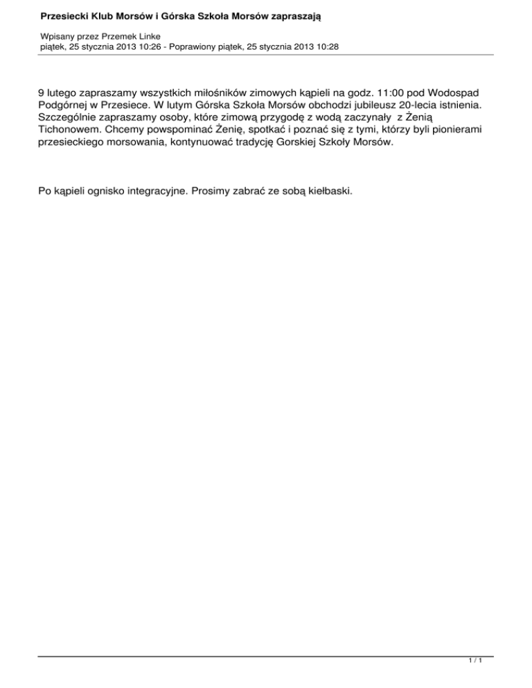 Przesiecki Klub Morsów i Górska Szkoła Morsów zapraszają Wpisany przez Przemek Linke piątek, 25 stycznia 2013 10:26 - Poprawiony piątek, 25 stycznia 2013 10:28 9 lutego zapraszamy wszystkich miłośników zimowych kąpieli na godz. 11:00 pod Wodospad Podgórnej w Przesiece. W lutym Górska Szkoła Morsów obchodzi jubileusz 20-lecia istnienia. Szczególnie zapraszamy osoby, które zimową przygodę z wodą zaczynały z Żenią Tichonowem. Chcemy powspominać Żenię, spotkać i poznać się z tymi, którzy byli pionierami przesieckiego morsowania, kontynuować tradycję Gorskiej Szkoły Morsów. Po kąpieli ognisko integracyjne. Prosimy zabrać ze sobą kiełbaski. 1/1