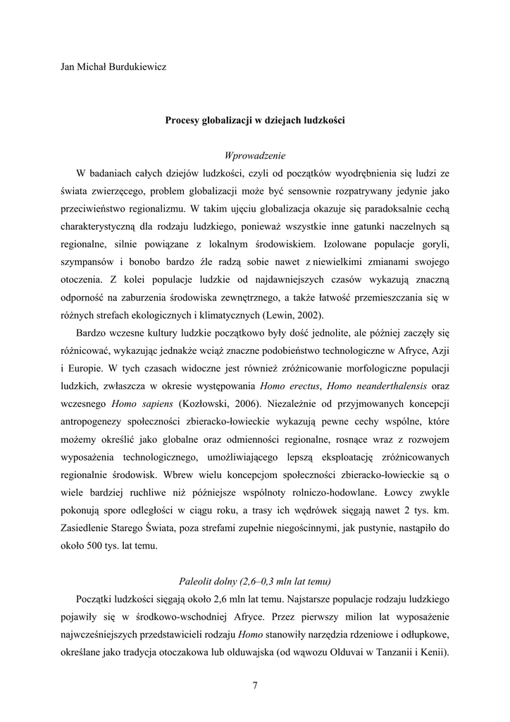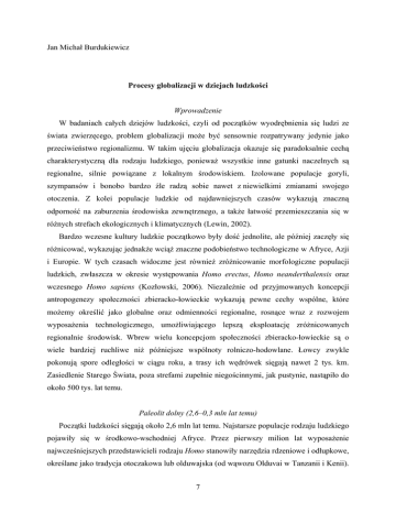 Jan Michał Burdukiewicz Procesy globalizacji w dziejach ludzkości Wprowadzenie W badaniach całych dziejów ludzkości, czyli od początków wyodrębnienia się ludzi ze świata zwierzęcego, problem globalizacji może być sensownie rozpatrywany jedynie jako przeciwieństwo regionalizmu. W takim ujęciu globalizacja okazuje się paradoksalnie cechą charakterystyczną dla rodzaju ludzkiego, ponieważ wszystkie inne gatunki naczelnych są regionalne, silnie powiązane z lokalnym środowiskiem. Izolowane populacje goryli, szympansów i bonobo bardzo źle radzą sobie nawet z niewielkimi zmianami swojego otoczenia. Z kolei populacje ludzkie od najdawniejszych czasów wykazują znaczną odporność na zaburzenia środowiska zewnętrznego, a także łatwość przemieszczania się w różnych strefach ekologicznych i klimatycznych (Lewin, 2002). Bardzo wczesne kultury ludzkie początkowo były dość jednolite, ale później zaczęły się różnicować, wykazując jednakże wciąż znaczne podobieństwo technologiczne w Afryce, Azji i Europie. W tych czasach widoczne jest również zróżnicowanie morfologiczne populacji ludzkich, zwłaszcza w okresie występowania Homo erectus, Homo neanderthalensis oraz wczesnego Homo sapiens (Kozłowski, 2006). Niezależnie od przyjmowanych koncepcji antropogenezy społeczności zbieracko-łowieckie wykazują pewne cechy wspólne, które możemy określić jako globalne oraz odmienności regionalne, rosnące wraz z rozwojem wyposażenia technologicznego, umożliwiającego lepszą eksploatację zróżnicowanych regionalnie środowisk. Wbrew wielu koncepcjom społeczności zbieracko-łowieckie są o wiele bardziej ruchliwe niż późniejsze wspólnoty rolniczo-hodowlane. Łowcy zwykle pokonują spore odległości w ciągu roku, a trasy ich wędrówek sięgają nawet 2 tys. km. Zasiedlenie Starego Świata, poza strefami zupełnie niegościnnymi, jak pustynie, nastąpiło do około 500 tys. lat temu. Paleolit dolny (2,6–0,3 mln lat temu) Początki ludzkości sięgają około 2,6 mln lat temu. Najstarsze populacje rodzaju ludzkiego pojawiły się w środkowo-wschodniej Afryce. Przez pierwszy milion lat wyposażenie najwcześniejszych przedstawicieli rodzaju Homo stanowiły narzędzia rdzeniowe i odłupkowe, określane jako tradycja otoczakowa lub olduwajska (od wąwozu Olduvai w Tanzanii i Kenii). 7 Przedstawiciele tej tradycji w ciągu kilkuset tysięcy lat zasiedlili wiele części Afryki i około 1,8 mln lat temu pierwsi ludzie zjawili się w Dmanisi (Gruzja), na pograniczu Azji i Europy, daleko od znanej obecnie kolebki w środkowowschodniej Afryce. Do niedawna wydawało się, że na tym etapie rozwoju wyjście poza Afrykę i strefę klimatu ciepłego było niemożliwe. Znaleziska z Dmanisi dowodzą jednak, że nawet najprostsze wyposażenie techniczne wystarczyło wczesnym społecznościom do kolonizacji tak rozległych obszarów Afryki i południowej Azji. Prawdopodobnie najwcześniejsze drogi migracji wiodły ze Wschodniej Afryki przez obecny Jemen i Arabię Saudyjską, najpierw na północ — w rejon Kaukazu, oraz na wschód do Indonezji i Chin (Haywood, i inni, 1998). Populacje, które dokonały tej pionierskiej kolonizacji, zaliczane są do gatunku Homo ergaster (Lewin, 2002; Kozłowski 2006). Poza Afryką stanowiska z tradycją otoczakową znane są z Kaukazu (1,8 mln lat temu), Jawy i Sumatry (1,5 mln lat temu) oraz Hiszpanii, pd. Francji i Włoch (ok. 1 mln lat temu). Od około 1,6 mln lat temu pojawia się we wschodniej Afryce nowa technologia narzędzi pięściakowych, zwana też tradycją aszelską (od Saint Acheul w pn. Francji). Wkrótce ta technologia staje się dominującą w Afryce, południowej Azji (do wsch. Indii) oraz południowej i zachodniej Europie (aż do pd. Anglii), zgodnie z tzw. linią Moviusa. W tym czasie upowszechnia się również udomowienie i stosowania ognia (Westbroek, i inni, 1993). Ulepszone technologie pozwalają ówczesnym społecznościom opanowanie strefy umiarkowanej i czynią łowiectwo bardziej efektywnym . Jednocześnie około 1 mln lat temu pojawia się nowa technologia, zwana mikrolityczną, która pozwoliła zasiedlić lesistą strefę północną Eurazji, od Niemiec na zachodzie po północne Chiny. Około 500 tys. lat temu pojawiły się narzędzia drewniane i złożone z kilku surowców (oszczepy i drewniane oprawy z Schöningen, Niemcy) (Burdukiewicz, 2003). W młodszej części paleolitu dolnego populacje ludzkie ulegają zróżnicowaniu. Rodzaj Homo reprezentowany był wówczas przez H. ergaster (Afryka), H. erectus (Azja) oraz H. heidelbergensis (Europa). Wśród paleoantropologów trwa spór, jak duże różnice populacyjne wówczas powstały. Jednak większość badaczy sądzi, że były one bardziej zbliżone do obecnych odmienności rasowych niż do gatunkowych. W tym okresie zarysowały się więc wyraźne różnice regionalne w populacjach ludzkich, które wskazują na rosnące znaczenie adaptacji lokalnych, które nie przekreślały jednakże globalnego charakteru rodzaju Homo (Lewin, 2002; Kozłowski 2006). Archeolodzy w zróżnicowaniu kulturowym z tego okresu dostrzegają wiele lokalnych jednostek taksonomicznych, których jest znacznie więcej niż wymienionych wyżej populacji biologicznych. Trwają spory o to, w jakim stopniu mamy w tym okresie do czynienia z trwałością tradycji kulturowych, a w jakim podobieństwa 8 wynikają z konwergencji wynikającej ze zbliżonych uwarunkowań ekologicznych i zasobów surowcowych. Około 1 mln lat temu pojawiają się wyraźne elementy kultury symbolicznej, które nie mają charakteru praktycznego, np. stosowanie barwników. W Sima de Los Huesos (pn. Hiszpania) ostatnio stwierdzono obecność obrządku pogrzebowego sprzed ok. 450 tys. lat (Bermúdez de Castro, i inni, 2002). W Bilzingsleben (pd-wsch. Niemcy) na ok. 350 tys. lat temu pojawiły się elementy znakowe, w tym oznaczenia miesiąca lunarnego. Świadczy to o powstaniu szerokiego spe