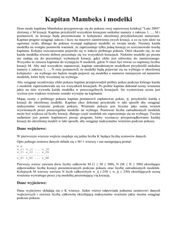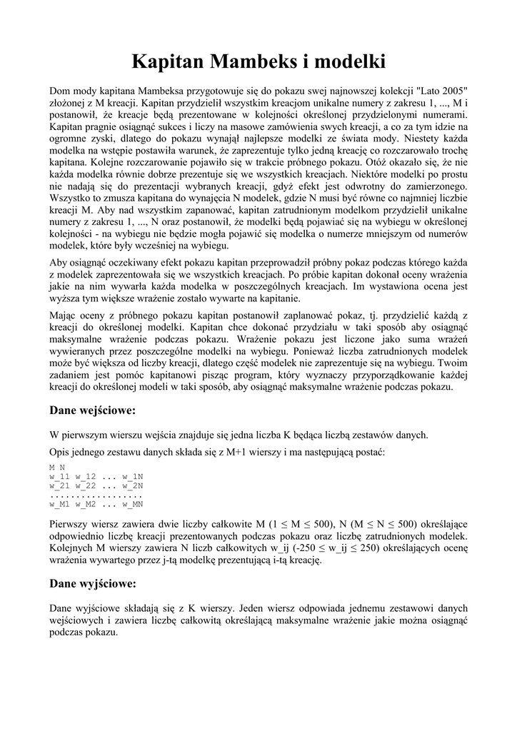 Kapitan Mambeks i modelki Dom mody kapitana Mambeksa przygotowuje się do pokazu swej najnowszej kolekcji "Lato 2005" złożonej z M kreacji. Kapitan przydzielił wszystkim kreacjom unikalne numery z zakresu 1, ..., M i postanowił, że kreacje będą prezentowane w kolejności określonej przydzielonymi numerami. Kapitan pragnie osiągnąć sukces i liczy na masowe zamówienia swych kreacji, a co za tym idzie na ogromne zyski, dlatego do pokazu wynajął najlepsze modelki ze świata mody. Niestety każda modelka na wstępie postawiła warunek, że zaprezentuje tylko jedną kreację co rozczarowało trochę kapitana. Kolejne rozczarowanie pojawiło się w trakcie próbnego pokazu. Otóż okazało się, że nie każda modelka równie dobrze prezentuje się we wszystkich kreacjach. Niektóre modelki po prostu nie nadają się do prezentacji wybranych kreacji, gdyż efekt jest odwrotny do zamierzonego. Wszystko to zmusza kapitana do wynajęcia N modelek, gdzie N musi być równe co najmniej liczbie kreacji M. Aby nad wszystkim zapanować, kapitan zatrudnionym modelkom przydzielił unikalne numery z zakresu 1, ..., N oraz postanowił, że modelki będą pojawiać się na wybiegu w określonej kolejności - na wybiegu nie będzie mogła pojawić się modelka o numerze mniejszym od numerów modelek, które były wcześniej na wybiegu. Aby osiągnąć oczekiwany efekt pokazu kapitan przeprowadził próbny pokaz podczas którego każda z modelek zaprezentowała się we wszystkich kreacjach. Po próbie kapitan dokonał oceny wrażenia jakie na nim wywarła każda modelka w poszczególnych kreacjach. Im wystawiona ocena jest wyższa tym większe wrażenie zostało wywarte na kapitanie. Mając oceny z próbnego pokazu kapitan postanowił zaplanować pokaz, tj. przydzielić każdą z kreacji do określonej modelki. Kapitan chce dokonać przydziału w taki sposób aby osiągnąć maksymalne wrażenie podczas pokazu. Wrażenie pokazu jest liczone jako suma wrażeń wywieranych przez poszczególne modelki na wybiegu. Ponieważ liczba zatrudnionych modelek może być większa od liczby kreacji, dlatego część modelek nie zaprezentuje się na wybiegu. Twoim zadaniem jest pomóc kapitanowi pisząc program, który wyznaczy przyporządkowanie każdej kreacji do określonej modeli w taki sposób, aby osiągnąć maksymalne wrażenie podczas pokazu. Dane wejściowe: W pierwszym wierszu wejścia znajduje się jedna liczba K będąca liczbą zestawów danych. Opis jednego zestawu danych składa się z M+1 wierszy i ma następującą postać: M N w_11 w_12 ... w_1N w_21 w_22 ... w_2N .................. w_M1 w_M2 ... w_MN Pierwszy wiersz zawiera dwie liczby całkowite M (1 ≤ M ≤ 500), N (M ≤ N ≤ 500) określające odpowiednio liczbę kreacji prezentowanych podczas pokazu oraz liczbę zatrudnionych modelek. Kolejnych M wierszy zawiera N liczb całkowitych w_ij (-250 ≤ w_ij ≤ 250) określających ocenę wrażenia wywartego przez j-tą modelkę prezentującą i-tą kreację. Dane wyjściowe: Dane wyjściowe składają się z K wierszy. Jeden wiersz odpowiada jednemu zestawowi danych wejściowych i zawiera liczbę całkowitą określającą maksymalne wrażenie jakie można osiągnąć podczas pokazu. Przykładowe dane wejściowe: 4 4 7 -9 5 3 -7 -6 -5 7 4 8 -3 2 -2 0 3 1 6 4 5 -5 -3 8 6 4 9 3 -2 -4 -6 3 5 -9 -8 3 6 7 9 -2 2 -1 1 1 8 5 3 -3 6 6 3 -2 4 2 1 -3 2 -1 4 7 0 5 7 3 5 3 -6 2 -3 2 -1 1 3 5 4 2 5 3 -3 -4 7 -5 -3 3 2 4 5 7 1 4 2 -4 3 -1 5 4 -2 -7 -3 5 3 -3 6 7 -5 -7 -6 5 4 2 -4 5 -6 -8 7 -1 7 3 7 -4 -3 4 -2 Przykładowe dane wyjściowe: 6 -1 9 0