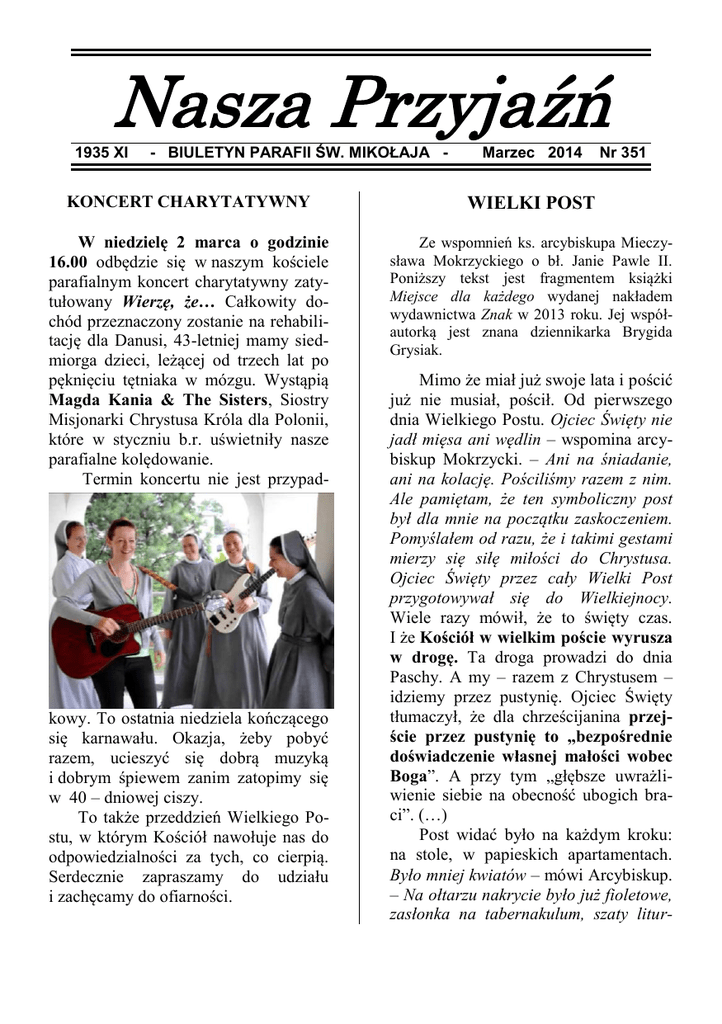Nasza Przyjaźń 1935 XI - BIULETYN PARAFII ŚW. MIKOŁAJA - Marzec 2014 Nr 351 KONCERT CHARYTATYWNY WIELKI POST W niedzielę 2 marca o godzinie 16.00 odbędzie się w naszym kościele parafialnym koncert charytatywny zatytułowany Wierzę, że… Całkowity dochód przeznaczony zostanie na rehabilitację dla Danusi, 43-letniej mamy siedmiorga dzieci, leżącej od trzech lat po pęknięciu tętniaka w mózgu. Wystąpią Magda Kania & The Sisters, Siostry Misjonarki Chrystusa Króla dla Polonii, które w styczniu b.r. uświetniły nasze parafialne kolędowanie. Termin koncertu nie jest przypad- Ze wspomnień ks. arcybiskupa Mieczysława Mokrzyckiego o bł. Janie Pawle II. Poniższy tekst jest fragmentem książki Miejsce dla każdego wydanej nakładem wydawnictwa Znak w 2013 roku. Jej współautorką jest znana dziennikarka Brygida Grysiak. kowy. To ostatnia niedziela kończącego się karnawału. Okazja, żeby pobyć razem, ucieszyć się dobrą muzyką i dobrym śpiewem zanim zatopimy się w 40 – dniowej ciszy. To także przeddzień Wielkiego Postu, w którym Kościół nawołuje nas do odpowiedzialności za tych, co cierpią. Serdecznie zapraszamy do udziału i zachęcamy do ofiarności. Mimo że miał już swoje lata i pościć już nie musiał, pościł. Od pierwszego dnia Wielkiego Postu. Ojciec Święty nie jadł mięsa ani wędlin – wspomina arcybiskup Mokrzycki. – Ani na śniadanie, ani na kolację. Pościliśmy razem z nim. Ale pamiętam, że ten symboliczny post był dla mnie na początku zaskoczeniem. Pomyślałem od razu, że i takimi gestami mierzy się siłę miłości do Chrystusa. Ojciec Święty przez cały Wielki Post przygotowywał się do Wielkiejnocy. Wiele razy mówił, że to święty czas. I że Kościół w wielkim poście wyrusza w drogę. Ta droga prowadzi do dnia Paschy. A my – razem z Chrystusem – idziemy przez pustynię. Ojciec Święty tłumaczył, że dla chrześcijanina przejście przez pustynię to „bezpośrednie doświadczenie własnej małości wobec Boga”. A przy tym „głębsze uwrażliwienie siebie na obecność ubogich braci”. (…) Post widać było na każdym kroku: na stole, w papieskich apartamentach. Było mniej kwiatów – mówi Arcybiskup. – Na ołtarzu nakrycie było już fioletowe, zasłonka na tabernakulum, szaty litur- giczne zmieniały kolor. Nastrój nie tyle smutku, ile skupienia także i u nas w domu się wytwarzał. W każdy piątek odprawialiśmy drogę krzyżową na tarasie albo w kaplicy. W każdą niedzielę śpiewaliśmy gorzkie żale. Śpiewaliśmy sami, gości wtedy nie było. Ojcu Świętemu zależało, żeby było kameralnie. Drogę krzyżową przechodził samotnie. Tak lubił najbardziej.(…) To było jego osobiste spotkanie z Chrystusem, który idzie na śmierć.(…) drogi przez pustynię będziemy „wyraźniej widzieć oblicze Boga żywego”. (…) W Wielkim Poście, w każdy piątek kaznodzieja papieski głosił dla Ojca Świętego rekolekcje – wspomina arcybiskup Mokrzycki. Papież był bardzo skupiony podczas tych rekolekcji, słuchał z uwagą, robił notatki. Była w tym wielka pokora – mówi. – Ale też jakiś głód słowa Bożego. On chciał się naprawdę jak najlepiej przygotować do tych świąt. Czy ktokolwiek z nas tak gorliwie przygotowuje się do śmierci i zmartwychwstania Chrystusa? To było dla niego ważne. I bardzo zależało mu na tym, żebyśmy w Wielkim Poście stawali się lepszymi ludźmi. Temu miała służyć ta praca nad sobą. Ta modlitwa, post i jałmużna. ŚRODA POPIELCOWA 5 marca Msze święte z obrzędem posypania głów popiołem będą sprawowane w naszym kościele parafialnym o godz. 6.30, 7.15 oraz 17.00 i 18.00. Zanim jednak nastąpił pierwszy piątek Wielkiego Postu, była Środa Popielcowa. I początek tej drogi przez pustynię. Drogi prawdy, zrozumienia siebie, ale – jak przypominał Jan Paweł II – także zrozumienia tajemnicy krzyża, który nadaje „pełny sens naszemu życiu”. (…) Ludziom na całym świecie powtarzał: „Nawracajcie się i wierzcie w Ewangelię”. I tłumaczył, że to wezwanie jest początkiem drogi. Do nawrócenia i odnowy. Przez modlitwę, post i dzieła miłosierdzia. Któregoś roku mówił wprost, że tak przeżywany Wielki Post oczyszcza nasze oczy. Że – jeśli podejdziemy do niego serio – na końcu W każdy piątek Wielkiego Postu o godz. 15.00 w kościele parafialnym będą się odbywać spotkania z Ojcem bogatym w miłosierdzie. Serdecznie zapraszamy. PIELGRZYMKA ŚLADAMI BŁ. JANA PAWŁA II 7 marca W pierwszy piątek miesiąca wyruszamy w kolejną pielgrzymkę, która tym razem ma nam nie tylko przybliżyć postać Jana Pawła II, ale też wprowadzić nas w Wielki Post. Będzie ona połączona z wyznaczoną dla naszej parafii Adoracją Najświętszego Sakramentu w ka2 plicy Wieczystej Adoracji przy Bazylice Miłosierdzia Bożego w Łagiewnikach. REKOLEKCJE PARAFIALNE Rekolekcje parafialne rozpoczniemy w tym roku w IV niedzielę Wielkiego Postu, tj. 30 marca. Wygłosi je dla nas franciszkanin, o. Piotr Dąbek. Rekolekcje potrwają do środy 2 kwietnia. Program: 1500 Koronka do Miłosierdzia Bożego w kościele parafialnym przy ulicy Kopernika 9 1530 przejazd autokarem do Centrum Jana Pawła II 1600 zwiedzanie muzeum 1700 Msza Święta 1800 kolacja 1900 zwiedzanie Centrum 2000 Droga Krzyżowa Święty biskup Józef Sebastian Pelczar na kartach Życia duchowego poucza, że nie ma osoby, która nie potrzebowałaby odbyć rekolekcji. „Jak wędrowiec przebywający w obcej kra- ~ 2100 przejazd autokarem do Bazyliki Miłosierdzia Bożego 2100–2400 Adoracja Najświętszego Sakramentu w kaplicy Wieczystej Adoracji (możliwość powrotu autokarem po godz. 2100 lub 2400) Koszt 25 zł Zapisy ze względów organizacyjnych do poniedziałku 3 marca włącznie w kancelarii parafialnej. Osoby, które z różnych względów nie mogą wyruszyć razem z nami w godzinach popołudniowych, zachęcamy do dołączenia do na