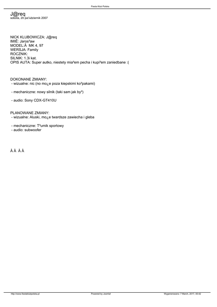 Fiesta Klub Polska J@req sobota, 20 pa¼dziernik 2007 NICK KLUBOWICZA: J@req IMIÊ: Jaros³aw MODEL:Â MK 4, 97 WERSJA: Family ROCZNIK: SILNIK: 1.3i kat. OPIS AUTA: Super autko, niestety mia³em pecha i kupi³em zaniedbane :( DOKONANE ZMIANY: - wizualne: nic (no mo¿e poza kiepskimi ko³pakami) - mechaniczne: nowy silnik (taki sam jak by³) - audio: Sony CDX-GT410U PLANOWANE ZMIANY: - wizualne: Aluski, mo¿e twardsze zawiecha i gleba - mechaniczne: T³umik sportowy - audio: subwoofer ÂÂ ÂÂ http://www.fiestaklubpolska.pl Powered by Joomla! Wygenerowano: 7 March, 2017, 00:42
