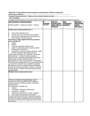 Załącznik 13 Sprawdzenie harmonogramu dotyczącego środków socjalnych Adres placu budowy :............................................................................................................. Przeglad bezpieczeństwa i higieny pracy przeprowadzony przez: …............................................... Data przeglądu : ….......................................................... Przegląd przeprowadzany jest przez osobe uprawnioną do przeglądu BHP w zakresie środków socjalnych. Temat zdrowia i bezpieczeństwa W Jeśli nie, Opis Nazwisko porządku proszę opisać rozwiązania odpowiadaj gdzie i jakie są problemu ącego i Środki socjalne – zaplecze socjalno – bytowe TAK/NIE problemy data wpisu Krótki okres wykonywania prac ? pracy trwa najwyżej 3 dni, wymiar pracy nie przekracza 6 osobodni pracownicy rozpoczynaja i kończą pracę w innym miejscu niż plac budowy Pracownicy maja zagwarantowany podczas pracy dostęp do : toalety jadalni umywalki z bieżącą ciepła wodą szatni z możliwościa przechowania ubran i przedmiotów osobistych możliwości suszenia odzieży roboczej , jeżeli zmoknie podczas wykonywania pracy. Jeżeli prace związane są z pyleniem lub dużym zabrudzeniem , materiały wykorzystywane podczas prac stwarzają zagrożenie dla zdrowia , prace niosą ze soba ryzyko kontaktu ze szkodliwymi dla skóry substancjami i materiałami lub istotne jest zapobieganie ich rozprzestrzenianiu , pracownicy narażeni są na działanie wysokiej temperatury lub duzy wysiłek fizyczny dostepne muszą być również prysznice i szatnie, w których zwykłe ubrania i odzież robocza przechowywane są oddzielnie. Dłuższy okres wykonywania prac Prace na budowie trwają dłuższy czas ? Pracownicy maja zagwarantowane zaplecze socjalno bytowe na dłuzszy okres / kontenery pracownicze / W kontenerach znajduje się : Toaleta Umywalka z bieżącą ciepłą wodą Prysznice z szatnią Oddzielne pomieszcenie szatni i jadalnia Dwie szafki dla jednego pracownika ? (Funkcje kontenerów pracowniczych mogą również spełniać pomieszczenia socjalne w istniejacym budynku udostepnione pracownikom tj. toalety, stołówka,łazienka,szatnia itp. Musza one mieć przynajmniej taki sam standard jak zwykłe kontenery pracownicze) Czy jest : 1 umywalka na 5 osób 1 prysznic na 10 osób 1 toaleta na 15 osób? Odległość od najbliższej toalety wynosi najwyżej 200 m lub jest możliwe dotarcie do niej w ciągu 5 minut ? Znane są wymogi dotyczace wyposażenia kontenerów pracowniczych ? (Zwróć uwagę na informacje zawarte w Duńskim serwisie środowiska pracy Executive zam. 775 17. września 1992) Wymagania przy pracach kanalizacyjnych , azbest,asfalt,ołów epoksydy itp. Odbywa się praca z azbestem , ołowiem, asfaltem, lub wykonywane są prace kanalizacyjne ? (Dla prac w przypadku , których pracownicy narażeni są na kontakt z substancjami i materiałami chemicznymi itp. , które mogą być szkodliwe dla zdrowia obowiazują szczególne przepisy organizacyjne dotyczące np. pomieszczen łazienkowych i sztni.) Wykonywane są prace z wykorzystaniem stacjonarnych pil tarczowych , stołów warsztatowych itp.w jednym miejscu przez dłuższy czas ? (Prace takie muszą odbywać się w budynku , kontenerze , namiocie lub w miejscu osłoniętym przynajmniej dachem. Więcej informacji można uzyskać w Duńskim serwisie środowiska pracy call center Tel. 70121288) 04-02-2014