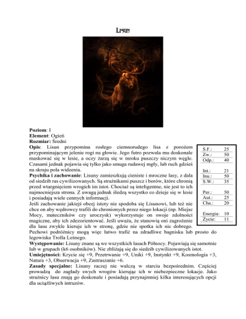 Lisun Poziom: I Element: Ogień Rozmiar: Średni Opis: Lisun przypomina rosłego ciemnorudego lisa z porożem S.F.: przypominającym jelenie rogi na głowie. Jego futro pozwala mu doskonale Zw.: maskować się w lesie, a oczy żarzą się w mroku puszczy niczym węgle. Odp.: Czasami jednak pojawia się tylko jako smuga rudawej mgły, lub ruch gdzieś na skraju pola widzenia. Int.: Psychika i zachowanie: Lisuny zamieszkują cieniste i mroczne lasy, z dala Inu.: od siedzib ras cywilizowanych. Są strażnikami puszcz i borów, które chronią S.W.: przed wtargnięciem wrogich im istot. Chociaż są inteligentne, nie jest to ich Per.: najmocniejsza strona. Z uwagą jednak śledzą wszystko co dzieje się w lesie Aut.: i posiadają wiele cennych informacji. Cha.: Jeśli zachowanie jakiejś obcej istoty nie spodoba się Lisunowi, lub też nie chce on aby wędrowcy trafili do chronionych przez niego lokacji (np. Miejsc Energia: Mocy, mateczników czy uroczysk) wykorzystuje on swoje zdolności Życie: magiczne, aby ich zdezorientować. Jeśli uważa, że stanowią oni zagrożenie dla lasu zwykle kieruje ich w stronę, gdzie nie spotka ich nic dobrego. Pechowi podróżnicy mogą więc łatwo trafić na zdradliwe bagniska lub prosto do legowiska Trolla Leśnego. Występowanie: Lisuny znane są we wszystkich lasach Północy. Pojawiają się samotnie lub w grupach (k6 osobników). Nie zbliżają się do siedzib cywilizowanych istot. Umiejętności: Krycie się +9, Przetrwanie +9, Uniki +9, Instynkt +9, Kosmologia +3, Natura +3, Obserwacja +9, Zastraszanie +6. Zasady specjalne: Lisuny raczej nie walczą w starciu bezpośrednim. Częściej prowadzą do zagłady swych wrogów kierując ich w niebezpieczne lokacje. Jako strażnicy lasu znają go doskonale i posiadają przynajmniej kilka interesujących opcji dla uciążliwych intruzów. 25 50 40 21 50 35 50 25 20 10 11 Lisuny nie atakują istot, które szanują puszczę i nie wnoszą do niej niepotrzebnego zamętu. Jedynie gniew Leszego może zmusić 2 P.M. Lisuna do walki z osobami krzywdzącymi las. Atakuje on wtedy z zaskoczenia, za Mistrzostwa pomocą ostrych zębów i uderzenia rogami. Duch 3 Może atakować dwa razy w rundzie. Ogień 1 Wykorzystuje także zdolność zmiany Wiatr 3 postaci, która pozwala mu przyjąć formę Ziemia 2 rudego pasma dymu. Jest to akcja standardowa, którą stworzenie może wykorzystać raz na rundę. W formie dymu Lisun nie może atakować, porusza się jednak z normalną prędkością i jest odporny na ataki mechaniczne i ogień (jedynie obrażenia elementarne z innych źródeł nadal mogą go dosięgnąć). Jego ulubioną taktyką jest więc niespodziewany atak i szybka ucieczka. Lisun może rzucać Zaklęcia Zdolności Astralnych: 1 St. Wtajemniczenia: LD (A) 2 St. Wtajemniczenia: OoBE (1), Widzenie Aury (1); Może także rzucać następujące czary Elementarne: Medytacja Ognia, Znak Ognia, Odporność na Ogień; Ma także dostęp do wszystkich Czarów Łowieckich I poziomu oraz wyjątkowo do zaklęć z poziomów wyższych: Leśny Kamuflarz, Złudna Woń, Zatarcie Śladów, Dezorientacja i Mylna Ścieżka. Dla Lisuna stanowią one czary I poziomu i są rzucane za 1 punkt Energii. Ciekawostki: Jeśli komuś uda się zdobyć ogon Lisuna może przyjmować formę rudej mgły (kosztem 2 punktów Energii, jest to akcja standardowa). Przedmiot działa aż do kolejnego nowiu księżyca. Zdolności specjalne: - Elfi wzrok; - Ruchliwość; - Aura Magiczna; - Odporność na broń niemagiczną; - Świadomość Sieci; - Widzenie Astralne; - Przebudzenie Astralu; - Zdolności Magiczne; - Atak wielokrotny x2. - Mieniactwo; Biegłość Krótkie Obuchowe P.A. 75 90 Obr. K6 + 2 K6 + 3 Krytyk: Inicjatywa: 4% 50 P.O. 60 Pancerz: Aura magiczna: 3 obrony