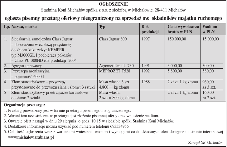 OGŁOSZENIE Stadnina Koni Michałów spółka z o.o. z siedzibą w Michałowie, 28-411 Michałów ogłasza pisemny przetarg ofertowy nieograniczony na sprzedaż nw. składników majątku ruchomego Lp. Nazwa, marka Typ Rok produkcji Cena wywoławcza Wadium brutto w PLN w PLN 1. Sieczkarnia samojezdna Class Jaguar – doposażona w czołową przystawkę do zbioru kukurydzy: KEMPER typ M3000GL I podbieracz pokosów – Class PU 300HD rok produkcji 2004 2. Agregat uprawowy 3. Przyczepa asenizacyjna – pojemność 6000 l 4. Złom staroużytkowy – przyczepy przystosowane do przewozu siana i słomy: 3 sztuki 5 Złom staroużytkowy przetrząsacze karuzelowe do siana: 2 sztuki Class Jaguar 800 1997 150.000,00 15.000,00 Agromet Unia U 730 MEPROZET T528 1991 1992 3.000,00 5.800,00 300,00 580,00 Masa własna 3 szt. 4.800 = kg złomu Masa własna 2 szt. = 800 kg złomu 1988 2 zł za 1 kg złomu 960,00 za 3 szt. 2 zł za 1 kg złomu 160,00 za 2 szt. Organizacja przetargu: 1. Przetarg prowadzony jest w formie przetargu pisemnego nieograniczonego. 2. Warunkiem uczestnictwa w przetargu jest złożenie pisemnej oferty oraz wniesienie wadium. 3. Otwarcie ofert nastąpi w dniu 29 sierpnia o godz. 10.15 w siedzibie spółki Stadnina Koni Michałów. 4. Dodatkowe informacje można uzyskać pod numerem telefonu 693534956 5. Cała treść ogłoszenia wraz z warunkami wniesienia wadium i wymogami co do składanych ofert dostępne na stronie internetowej www.michalow.arabians.pl Zarząd SK Michałów