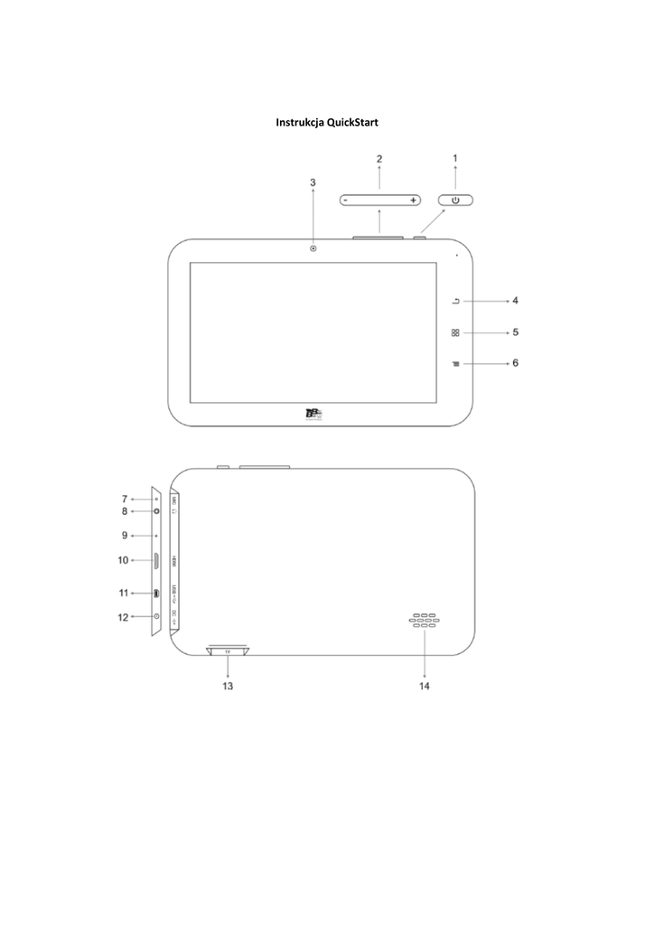 Instrukcja QuickStart Przyciski i łączność 1. Włącznik urządzenia: Przytrzymaj przycisk, aby włączyć urządzenie. Krótkie naciśnięcie włącza urządzenie, gdy znajduje się trybie gotowości. 2. Przyciski głośności: Zmiana głośność tabletu. 3. Aparat: wbudowany aparat fotograficzny do robienia zdjęć i nagrywania filmów wideo. 4. Przycisk Powrót: Przejście do poprzedniej opcji lub menu. 5. Przycisk Start: Wyświetla ekranu głównego pulpitu urządzenia. 6. Przycisk Menu: Wyświetla menu. 7. Mikrofon: przekazuje dźwięk do urządzenia i nagrywa dźwięk. 8. Gniazdo słuchawkowe: Umożliwia podłączenie słuchawek do gniazda 9. Reset: Resetuje urządzenie. 10. WyjścieMini HDMI: Wyjście cyfrowe służące do podłączenia do zewnętrznego monitora/TV. 11. MiniUSB: port USB umożliwia wymianę plików z komputerem. 12. Zasilanie: Służy do ładowania baterii wewnętrznej. 13. Micro SD: wejście na karty pamięci Micro SD 14. Głośnik: źródło dźwięku gdy nie są podłączone słuchawki Podstawowe funkcje Ładowanie baterii Urządzenie zawiera akumulator litowo-jonowy. Podłącz zasilacz sieciowydo dowolnego gniazda i podłącz do wejścia zasilania na urządzeniu jednostka. Gdy ikona baterii jest wyświetlona jako pełna można odłączyć ładowarkę. Power On / Off Naciśnij przycisk zasilania przez kilka sekund, aby włączyć urządzenie. Aby je wyłączyć przytrzymaj przycisk do momentu pojawienia się informacji z pytaniem kontrolnym poczym zatwierdź wyłączenie. Wkładanie i wyjmowanie karty Micro SD Włóż kartę pamięciMicro SD do gniazda i wciśnij go, dopóki poczujesz oporu. Aby bezpiecznie usunąć wybierz w menuUstawienia>Magazynowanie>usuń kartę SD. Zaakceptuj, abyusunąć bezpiecznie, a następnie przyciśnij kartę w gnieździe i wyciągnij ją. Przesyłanie plików z/do komputera Podłącz tablet do komputera za pomocą kabla USB (musi być podłączonydo portu USB Mini w tablecie). Urządzenie zostanie wykrytejako urządzenie multimedialne (MTP).Jeśli chcesz uzyskać pełny dostęp do wszystkich plików tabletu pamięci wewnętrznej ikarcie pamięci, należy zmienić tryb transferu plików. Przejdź do Ustawienia> Magazynowanie, naciśnij ikonę menu w prawym górnym rogu ekranu, a następnie wybierz Opcje łączenia z komputerem przez USB. Następnie wybierz opcję pamięci masowej USB do przechowywania.Teraz swobodnie możesz przenieść wszystkie pliki przechowywane w Tablecie (również są dostępneMultimedia Device - MTP i aparatu fotograficznego - tryby PTP). Konfiguracja ekranudotykowego Wyłączanie ekranu Ekran wyłącza się automatycznie, jeśli nie jest używany przez dłuższy czas. Ustawienia> Wyświetlacz> Wyłącz.Jeśli chcesz wyłączyć ekran ręcznie, wystarczy nacisnąć przycisk zasilania. Regulacja obrotu ekranu Wyświetlacz automatycznie przełącza się z orientacji pionowejw poziomą w zależnoścido pozycji urządzenia (jeśli używana aplikacja obsługuje tę funkcję). Jeśli chcesz zmienić orientację ekranu, wybierz Ustawienia > Ekrani wyłącz opcję automatycznego obracania ekranu. Ekran główny (Home) Z poziomu ekranu głównego będziesz miał dostęp do narzędzi i aplikacji zainstalowanychna tablecie. Dzięki temu ekranie można kontrolować stan urządzenia, Internet, otwarte aplikacje lub menu.W dolnej części ekranu znajdziesz pasek z menu Startpo lewej i pasek powiadomień z prawej strony. Uruchamianie aplikacji znajduje się w prawym górnym rogu znajduje się ekranu, a wraz z nim można uzyskać dostęp do aplikacji, widżetów i pamięci. MENU START. W tym pasku narzędzi znajdziesz następujące funkcje: -Powrót. Wraca do poprzedniego ekranu. - Strona główna. Powraca do ekranu startowego. -Otwórz aplikacje. Aby całkowicie zamknąć aplikację lub powrócić do aplikacji, która nadal pracuje. Aby zamknąć aplikacjęwybierzją i przesuń go w prawo, poza listę. - Menu. Wyświetla menu opcji aplikacji. -Pasek Powiadomienia: Tu możesz sprawdzić czas, powiadomienia,stan sygnału Wi-Fi i inne informacje. wybierzgoaby uzyskać dostęp do dostęp do ustawień. -Wi-Fi. Pokazuje, czy tablet jest podłączony do sieci Wi-Fi i można sprawdzić siłę sygnału. - Akumulator. Pokazuje poziom naładowania baterii. Dodatkowe Ekrany Główny Ekran główny ma pięć dodatkowych ekranów, na których można umieszczać skróty, aplikacje i inne narzędzia. Aby przełączać się między ekranami, przytrzymaj iprzeciągnij ekran palcem w lewo lub w prawo. Dodaj / Usuń skróty Aby dodawać skróty do ekranów naciśnij , przenieś aplikację w pożądane miejsce.Aby usunąć aplikację z ekranu, przytrzymaj i przeciągnij jej ikonę na ikonę kasowania, który pojawi się naekranie. Aplikacje Naciśnij ikonę w prawym górnym rogu ekranu, aby mieć dostęp do wszystkich aplikacjizainstalowanych na Tablecie. Aby otworzyć aplikację dotknijodpowiednią ikonę. Aby powrócić do ekranu głównego naciśnij ikonę Home. Wi-Fi Aby podłączyć się Internetem lub uruchomić aplikację, która wymaga dostępu do Internetu , należy podłączyć tablet do sieci WiFi. Konfiguracja: Przejdź do menu powiadomienia znajdującego się na pasku u dołu ekranu lub naciśnij i przejdź do Ustawienia> Sieci i łączność bezprzewodowa>Wi-FI . Włącz opcję Wi-Fi i urządzenie rozpocznie wyszukiwanie dostępnychsieci. - Zostanie wyświetlona lista nazw z sieciami Wi-Fi (SSID). - Wybierz sieć, by sprawdzić poziom bezpieczeństwa i siłę sygnału. - Wprowadź hasło i naciśnij przycisk Połącz, aby nawiązać połączenie. Specyfikacja Sprzęt: Procesor: 1,2 GHzCotex A8 procesor z akceleratorem 3D Pojemność: 8 GB Pamięć: 512 MB Karta pamięci Micro SD 128MB-16 G Ekran: 7'' pojemnościowy ekran multi-touch Rozdzielczość: 800 x 480 pikseli Typ baterii i pojemność: akumulator polimerowy: 3000 mAh USB: Szybkie złącze USB 2.0 Czujnik grawitacyjny: 3D Oprogramowanie System operacyjny: Android 4.0