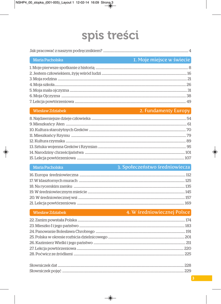 NSHP4_00_stopka_(001-005)_Layout 1 12-02-14 16:09 Strona 3 spis treści Jak pracować z naszym podręcznikiem? .................................................................................................................. 4 Maria Pacholska 1. Moje miejsce w świecie 1. Moje pierwsze spotkanie z historią ............................................................................................................................ 8 2. Jestem człowiekiem, żyję wśród ludzi .................................................................................................................. 16 3. Moja rodzina ............................................................................................................................................................................. 21 4. Moja szkoła................................................................................................................................................................................ 26 5. Moja mała ojczyzna ............................................................................................................................................................. 31 6. Moja Ojczyzna ....................................................................................................................................................................... 38 7. Lekcja powtórzeniowa ..................................................................................................................................................... 49 Wiesław Zdziabek 2. Fundamenty Europy 8. Najdawniejsze dzieje człowieka ............................................................................................................................... 54 9. Mieszkańcy Aten .................................................................................................................................................................. 61 10. Kultura starożytnych Greków .................................................................................................................................. 70 11. Mieszkańcy Rzymu .......................................................................................................................................................... 79 12. Kultura rzymska ................................................................................................................................................................. 89 13. Sztuka wojenna Greków i Rzymian ...................................................................................................................... 95 14. Narodziny chrześcijaństwa ...................................................................................................................................... 101 15. Lekcja powtórzeniowa ................................................................................................................................................ 107 Maria Pacholska 3. Społeczeństwo średniowiecza 16. Europa średniowieczna .............................................................................................................................................. 112 17. W klasztornych murach .............................................................................................................................................. 125 18. Na rycerskim zamku ..................................................................................................................................................... 135 19. W średniowiecznym mieście .................................................................................................................................. 145 20. W średniowiecznej wsi ............................................................................................................................................... 157 21. Lekcja powtórzeniowa ................................................................................................................................................ 169 Wiesław Zdziabek 4. W średniowiecznej Polsce 22. Zanim powstała Polska ................................................................................................................................................ 174 23. Mieszko I i jego państwo ............................................................................................................................................. 183 24. Panowanie Bolesława Chrobrego ........................................................................................................................ 191 25. Polska w okresie rozbicia dzielnicowego ...................................................................................................... 201 26. Kazimierz Wielki i jego państwo ........................................................................................................................... 211 27. Lekcja powtórzeniowa ............................................................................................................................................... 220 28. Poćwicz ze źródłami .................................................................................................................................................... 225 Słowniczek dat ......................................................................................................................................................................... 228 Słowniczek pojęć ................................................................................................................................................................... 229 3