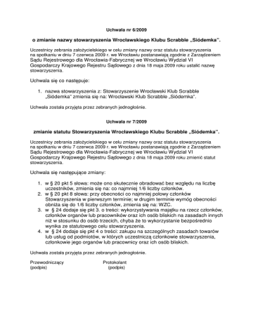 Uchwała nr 6/2009 o zmianie nazwy stowarzyszenia Wrocławskiego Klubu Scrabble „Siódemka”. Uczestnicy zebrania załoycielskiego w celu zmiany nazwy oraz statutu stowarzyszenia na spotkaniu w dniu 7 czerwca 2009 r. we Wrocławiu postanawiaj zgodnie z Zarzdzeniem Sdu Rejestrowego dla Wrocławia-Fabrycznej we Wrocławiu Wydział VI Gospodarczy Krajowego Rejestru Sdowego z dnia 18 maja 2009 roku ustali nazw stowarzyszenia. Uchwala si co nastpuje: 1. nazwa stowarzyszenia z: Stowarzyszenie Wrocławski Klub Scrabble „Siódemka” zmienia si na: Wrocławski Klub Scrabble „Siódemka”. Uchwała została przyjta przez zebranych jednogłonie. Uchwała nr 7/2009 zmianie statutu Stowarzyszenia Wrocławskiego Klubu Scrabble „Siódemka”. Uczestnicy zebrania załoycielskiego w celu zmiany nazwy oraz statutu stowarzyszenia na spotkaniu w dniu 7 czerwca 2009 r. we Wrocławiu postanawiaj zgodnie z Zarzdzeniem Sdu Rejestrowego dla Wrocławia-Fabrycznej we Wrocławiu Wydział VI Gospodarczy Krajowego Rejestru Sdowego z dnia 18 maja 2009 roku zmieni statut stowarzyszenia. Uchwala si nastpujce zmiany: 1. w § 20 pkt 5 słowa: moe ono skutecznie obradowa bez wzgldu na liczb uczestników, zmienia si na: co najmniej 1/6 liczby członków. 2. w § 20 pkt 8 słowa: przy obecnoci co najmniej połowy członków Stowarzyszenia w pierwszym terminie; w drugim terminie wymóg obecnoci obnia si do 1/6 liczby członków, zmienia si na: WZC. 3. w § 24 dodaje si pkt 3. o treci: wykorzystywania majtku na rzecz członków, członków organów lub pracowników oraz ich osób bliskich na zasadach innych ni w stosunku do osób trzecich, chyba e to wykorzystanie bezporednio wynika ze statutowego celu stowarzyszenia. 4. w § 24 dodaje si pkt 4 o treci: zakupu na szczególnych zasadach towarów lub usług od podmiotów, w których uczestnicz członkowie stowarzyszenia, członkowie jego organów lub pracownicy oraz ich osób bliskich. Uchwała została przyjta przez zebranych jednogłonie. Przewodniczcy (podpis) Protokolant (podpis)