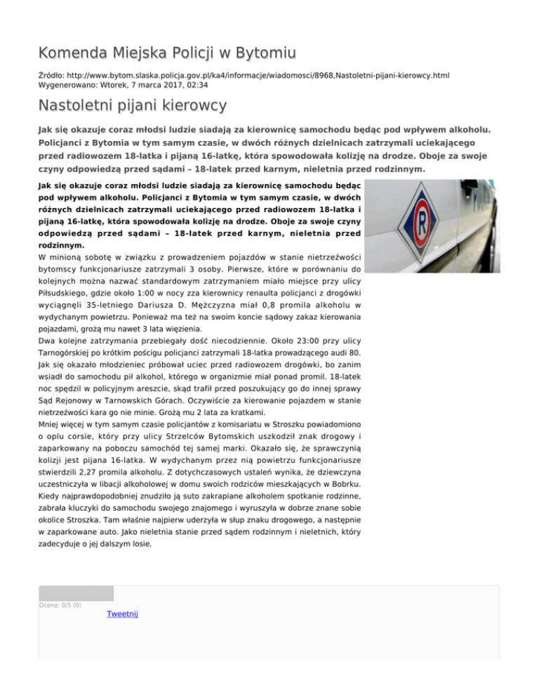 Komenda Miejska Policji w Bytomiu Źródło: http://www.bytom.slaska.policja.gov.pl/ka4/informacje/wiadomosci/8968,Nastoletni-pijani-kierowcy.html Wygenerowano: Wtorek, 7 marca 2017, 02:34 Nastoletni pijani kierowcy Jak się okazuje coraz młodsi ludzie siadają za kierownicę samochodu będąc pod wpływem alkoholu. Policjanci z Bytomia w tym samym czasie, w dwóch różnych dzielnicach zatrzymali uciekającego przed radiowozem 18-latka i pijaną 16-latkę, która spowodowała kolizję na drodze. Oboje za swoje czyny odpowiedzą przed sądami – 18-latek przed karnym, nieletnia przed rodzinnym. Jak się okazuje coraz młodsi ludzie siadają za kierownicę samochodu będąc pod wpływem alkoholu. Policjanci z Bytomia w tym samym czasie, w dwóch różnych dzielnicach zatrzymali uciekającego przed radiowozem 18-latka i pijaną 16-latkę, która spowodowała kolizję na drodze. Oboje za swoje czyny odpowiedzą przed sądami – 18-latek przed karnym, nieletnia przed rodzinnym. W minioną sobotę w związku z prowadzeniem pojazdów w stanie nietrzeźwości bytomscy funkcjonariusze zatrzymali 3 osoby. Pierwsze, które w porównaniu do kolejnych można nazwać standardowym zatrzymaniem miało miejsce przy ulicy Piłsudskiego, gdzie około 1:00 w nocy zza kierownicy renaulta policjanci z drogówki wyciągnęli 35-letniego Dariusza D. Mężczyzna miał 0,8 promila alkoholu w wydychanym powietrzu. Ponieważ ma też na swoim koncie sądowy zakaz kierowania pojazdami, grożą mu nawet 3 lata więzienia. Dwa kolejne zatrzymania przebiegały dość niecodziennie. Około 23:00 przy ulicy Tarnogórskiej po krótkim pościgu policjanci zatrzymali 18-latka prowadzącego audi 80. Jak się okazało młodzieniec próbował uciec przed radiowozem drogówki, bo zanim wsiadł do samochodu pił alkohol, którego w organizmie miał ponad promil. 18-latek noc spędzil w policyjnym areszcie, skąd trafił przed poszukujący go do innej sprawy Sąd Rejonowy w Tarnowskich Górach. Oczywiście za kierowanie pojazdem w stanie nietrzeźwości kara go nie minie. Grożą mu 2 lata za kratkami. Mniej więcej w tym samym czasie policjantów z komisariatu w Stroszku powiadomiono o oplu corsie, który przy ulicy Strzelców Bytomskich uszkodził znak drogowy i zaparkowany na poboczu samochód tej samej marki. Okazało się, że sprawczynią kolizji jest pijana 16-latka. W wydychanym przez nią powietrzu funkcjonariusze stwierdzili 2,27 promila alkoholu. Z dotychczasowych ustaleń wynika, że dziewczyna uczestniczyła w libacji alkoholowej w domu swoich rodziców mieszkających w Bobrku. Kiedy najprawdopodobniej znudziło ją suto zakrapiane alkoholem spotkanie rodzinne, zabrała kluczyki do samochodu swojego znajomego i wyruszyła w dobrze znane sobie okolice Stroszka. Tam właśnie najpierw uderzyła w słup znaku drogowego, a następnie w zaparkowane auto. Jako nieletnia stanie przed sądem rodzinnym i nieletnich, który zadecyduje o jej dalszym losie. Ocena: 0/5 (0) Tweetnij