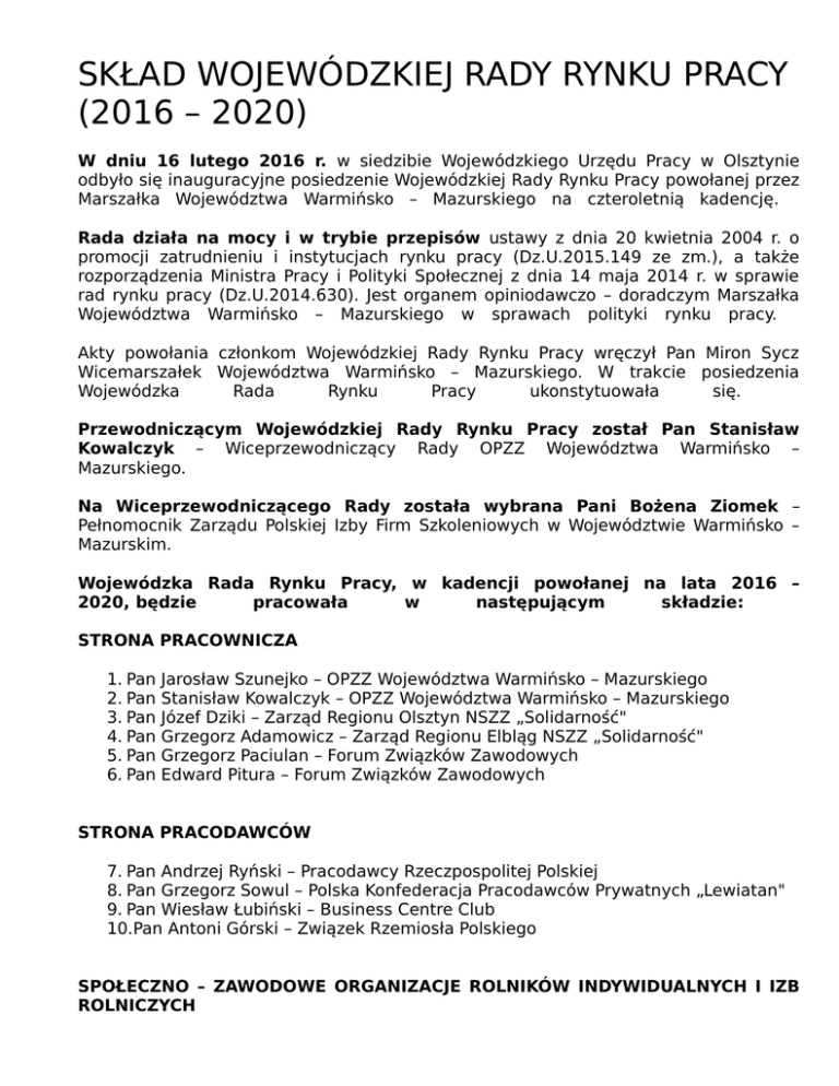 SKŁAD WOJEWÓDZKIEJ RADY RYNKU PRACY (2016 – 2020) W dniu 16 lutego 2016 r. w siedzibie Wojewódzkiego Urzędu Pracy w Olsztynie odbyło się inauguracyjne posiedzenie Wojewódzkiej Rady Rynku Pracy powołanej przez Marszałka Województwa Warmińsko – Mazurskiego na czteroletnią kadencję. Rada działa na mocy i w trybie przepisów ustawy z dnia 20 kwietnia 2004 r. o promocji zatrudnieniu i instytucjach rynku pracy (Dz.U.2015.149 ze zm.), a także rozporządzenia Ministra Pracy i Polityki Społecznej z dnia 14 maja 2014 r. w sprawie rad rynku pracy (Dz.U.2014.630). Jest organem opiniodawczo – doradczym Marszałka Województwa Warmińsko – Mazurskiego w sprawach polityki rynku pracy. Akty powołania członkom Wojewódzkiej Rady Rynku Pracy wręczył Pan Miron Sycz Wicemarszałek Województwa Warmińsko – Mazurskiego. W trakcie posiedzenia Wojewódzka Rada Rynku Pracy ukonstytuowała się. Przewodniczącym Wojewódzkiej Rady Rynku Pracy został Pan Stanisław Kowalczyk – Wiceprzewodniczący Rady OPZZ Województwa Warmińsko – Mazurskiego. Na Wiceprzewodniczącego Rady została wybrana Pani Bożena Ziomek – Pełnomocnik Zarządu Polskiej Izby Firm Szkoleniowych w Województwie Warmińsko – Mazurskim. Wojewódzka Rada Rynku Pracy, w kadencji powołanej na lata 2016 – 2020, będzie pracowała w następującym składzie: STRONA PRACOWNICZA 1. Pan 2. Pan 3. Pan 4. Pan 5. Pan 6. Pan Jarosław Szunejko – OPZZ Województwa Warmińsko – Mazurskiego Stanisław Kowalczyk – OPZZ Województwa Warmińsko – Mazurskiego Józef Dziki – Zarząd Regionu Olsztyn NSZZ „Solidarność" Grzegorz Adamowicz – Zarząd Regionu Elbląg NSZZ „Solidarność" Grzegorz Paciulan – Forum Związków Zawodowych Edward Pitura – Forum Związków Zawodowych STRONA PRACODAWCÓW 7. Pan Andrzej Ryński – Pracodawcy Rzeczpospolitej Polskiej 8. Pan Grzegorz Sowul – Polska Konfederacja Pracodawców Prywatnych „Lewiatan" 9. Pan Wiesław Łubiński – Business Centre Club 10.Pan Antoni Górski – Związek Rzemiosła Polskiego SPOŁECZNO – ZAWODOWE ORGANIZACJE ROLNIKÓW INDYWIDUALNYCH I IZB ROLNICZYCH 11.Pan Wiesław Domian – Wojewódzki Związek Rolników, Kółek i Organizacji Rolniczych 12.Pan Marek Kuźniewski – Warmińsko – Mazurska Izba Rolnicza ORGANIZACJE POZARZĄDOWE ZAJMUJĄCE SIĘ PROBLEMATYKĄ RYNKU PRACY 13.Pani Krystyna Janik – Stowarzyszenie Bezrobotnych „Jesteś – my" Ośrodek Wsparcia Przedsiębiorczości 14.Pani Zofia Borowska – Lidzbarskie Stowarzyszenie Bezrobotnych „Warmia" 15.Pan Andrzej Jurkian – Warmińsko – Mazurski Sejmik Osób Niepełnosprawnych 16.Pani Bożena Ziomek – Polska Izba Firm Szkoleniowych PRZEDSTAWICIELE SPOŚRÓD ORGANÓW JEDNOSTEK SAMORZĄDU TERYTORIALNEGO I NAUKI O SZCZEGÓLNEJ WIEDZY I AUTORYTECIE W OBSZARZE DZIAŁANIA RADY 17.Pani Anna Organiściak – Krzykowska – przedstawiciel świata nauki 18.Pani Małgorzata Chyziak – Konwent Powiatów Województwa Warmińsko –Mazurskiego 19.Pani Wiesława Przybysz – Urząd Marszałkowski Województwa Warmińsko – Mazurskiego.