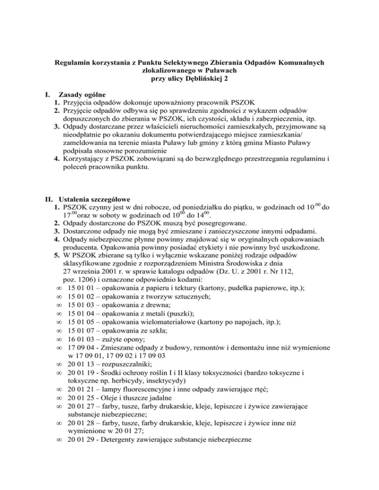 Regulamin korzystania z Punktu Selektywnego Zbierania Odpadów Komunalnych zlokalizowanego w Puławach przy ulicy Dęblińskiej 2 I. Zasady ogólne 1. Przyjęcia odpadów dokonuje upoważniony pracownik PSZOK 2. Przyjęcie odpadów odbywa się po sprawdzeniu zgodności z wykazem odpadów dopuszczonych do zbierania w PSZOK, ich czystości, składu i zabezpieczenia, itp. 3. Odpady dostarczane przez właścicieli nieruchomości zamieszkałych, przyjmowane są nieodpłatnie po okazaniu dokumentu potwierdzającego miejsce zamieszkania/ zameldowania na terenie miasta Puławy lub gminy z którą gmina Miasto Puławy podpisała stosowne porozumienie 4. Korzystający z PSZOK zobowiązani są do bezwzględnego przestrzegania regulaminu i poleceń pracownika punktu. II. Ustalenia szczegółowe 1. PSZOK czynny jest w dni robocze, od poniedziałku do piątku, w godzinach od 10.00 do 17.00oraz w soboty w godzinach od 1000 do 1400. 2. Odpady dostarczone do PSZOK muszą być posegregowane. 3. Dostarczone odpady nie mogą być zmieszane i zanieczyszczone innymi odpadami. 4. Odpady niebezpieczne płynne powinny znajdować się w oryginalnych opakowaniach producenta. Opakowania powinny posiadać etykiety i nie powinny być uszkodzone. 5. W PSZOK zbierane są tylko i wyłącznie wskazane poniżej rodzaje odpadów sklasyfikowane zgodnie z rozporządzeniem Ministra Środowiska z dnia 27 września 2001 r. w sprawie katalogu odpadów (Dz. U. z 2001 r. Nr 112, poz. 1206) i oznaczone odpowiednio kodami: • 15 01 01 – opakowania z papieru i tektury (kartony, pudełka papierowe, itp.); • 15 01 02 – opakowania z tworzyw sztucznych; • 15 01 03 – opakowania z drewna; • 15 01 04 – opakowania z metali (puszki); • 15 01 05 – opakowania wielomateriałowe (kartony po napojach, itp.); • 15 01 07 – opakowania ze szkła; • 16 01 03 – zużyte opony; • 17 09 04 - Zmieszane odpady z budowy, remontów i demontażu inne niż wymienione w 17 09 01, 17 09 02 i 17 09 03 • 20 01 13 – rozpuszczalniki; • 20 01 19 - Środki ochrony roślin I i II klasy toksyczności (bardzo toksyczne i toksyczne np. herbicydy, insektycydy) • 20 01 21 – lampy fluorescencyjne i inne odpady zawierające rtęć; • 20 01 25 - Oleje i tłuszcze jadalne • 20 01 27 – farby, tusze, farby drukarskie, kleje, lepiszcze i żywice zawierające substancje niebezpieczne; • 20 01 28 – farby, tusze, farby drukarskie, kleje, lepiszcze i żywice inne niż wymienione w 20 01 27; • 20 01 29 - Detergenty zawierające substancje niebezpieczne • • • • • • • • • • • 6. 7. 8. 20 01 30 - Detergenty inne niż wymienione w 20 01 29 20 01 31 – leki cytotoksyczne i cytostatyczne; 20 01 32 – leki inne niż wymienione w 20 01 31; 20 01 33 – Baterie i akumulatory łącznie z bateriami i akumulatorami wymienionymi w 16 06 01, 16 06 02 lub 16 06 03 oraz nie sortowane baterie i akumulatory zawierające te baterie; 20 01 34 – baterie i akumulatory inne niż wymienione w 20 01 33; 20 01 35 – zużyte urządzenia elektryczne i elektroniczne inne niż wymienione 20 01 36 – zużyte urządzenia elektryczne i elektroniczne inne niż wymienione w 20 01 21, 20 01 23 i 20 01 35; 20 01 80 – środki ochrony roślin inne niż wymienione w 20 01 19; 20 02 01 – odpady ulegające biodegradacji (gałęzie, liście, skoszona trawa). 20 03 07 - Odpady wielkogabarytowe 20 03 99 Odpady komunalne niewymienione w innych podgrupach (popiół) Dostarczający odpady zobowiązany jest do natychmiastowego zabrania odpadów w przypadku: stwierdzenia przez pracownika PSZOK-u, iż odpady dostarczone nie znajdują się na wykazie odpadów aktualnie przyjmowanych, stwierdzenia zanieczyszczeń i zabrudzeń w dostarczonych odpadach, stwierdzenia braku możliwości identyfikacji odpadów niebezpiecznych. Do PSZOK nie są przyjmowane następujące rodzaje odpadów: • odpady zawierające azbest • zmieszane odpady komunalne • części samochodowe Każdorazowe przyjęcie odpadów do PSZOK potwierdzane jest na formularzu przyjęcia odpadów. III. Postanowienia końcowe 1. Wszelkich informacji o pracy Punktu udziela pracownik PSZOK-u na miejscu lub pod numerem telefonu 81886 20 18 wew. 105 lub 106. 2. Regulamin korzystania z Punktu Selektywnego Zbierania Odpadów Komunalnych jest dostępny na stronie internetowej ZUK www.zuk.pulawy.pl i Urzędu Miasta Puławy www.um.pulawy.pl 3. Osoby przebywające na terenie PSZOK obowiązane są do: • przestrzegania zaleceń obsługi PSZOK, w szczególności w zakresie miejsca złożenia odpadów oraz sposobu poruszania się po PSZOK; • zachowania wymogów bezpieczeństwa, w szczególności nieużywania źródeł otwartego ognia; • zachowania kierunku przemieszczania się wynikającego z oznaczeń; • stosowania się do ogólnych zasad ruchu drogowego.