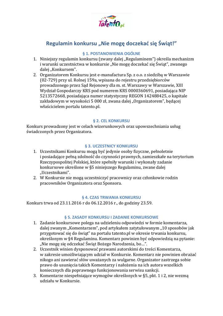 Regulamin konkursu „Nie mogę doczekać się Świąt!” § 1. POSTANOWIENIA OGÓLNE 1. Niniejszy regulamin konkursu (zwany dalej „Regulaminem”) określa mechanizm i warunki uczestnictwa w konkursie „Nie mogę doczekać się Świąt”, zwanego dalej „Konkursem”. 2. Organizatorem Konkursu jest e-‐manufactura Sp. z o.o. z siedzibą w Warszawie (02-‐729) przy ul. Rolnej 159a, wpisana do rejestru przedsiębiorców prowadzonego przez Sąd Rejonowy dla m. st. Warszawy w Warszawie, XIII Wydział Gospodarczy KRS pod numerem KRS 0000360691, posiadająca NIP 5213572668, posiadająca numer statystyczny REGON 142488425, o kapitale zakładowym w wysokości 5 000 zł, zwana dalej „Organizatorem”, będącej właścicielem portalu tatento.pl. § 2. CEL KONKURSU Konkurs prowadzony jest w celach wizerunkowych oraz upowszechniania usług świadczonych przez Organizatora. § 3. UCZESTNICY KONKURSU 1. Uczestnikami Konkursu mogą być jedynie osoby fizyczne, pełnoletnie i posiadające pełną zdolność do czynności prawnych, zamieszkałe na terytorium Rzeczypospolitej Polskiej, które spełniły warunki i wykonały zadanie konkursowe określone w §5 niniejszego Regulaminu, zwane dalej „Uczestnikami”. 2. W Konkursie nie mogą uczestniczyć pracownicy oraz członkowie rodzin pracowników Organizatora oraz Sponsora. § 4. CZAS TRWANIA KONKURSU Konkurs trwa od 23.11.2016 r do 06.12.2016 r., do godziny 23.59. § 5. ZASADY KONKURSU I ZADANIE KONKURSOWE 1. Zadanie konkursowe polega na udzieleniu odpowiedzi w formie komentarza, dalej zwanym „Komentarzem”, pod artykułem zatytułowanym „10 sposobów jak przygotować się do świąt” na portalu tatento.pl w okresie trwania konkursu, określonym w §4 Regulaminu. Komentarz powinien być odpowiedzią na pytanie: „Nie mogę się odczekać Świąt Bożego Narodzenia, bo…”. 2. Uczestnik winien dysponować prawami autorskimi do treści Komentarza, w zakresie umożliwiającym udział w Konkursie. Komentarz nie powinien obrażać nikogo ani zawierać słów uważanych za wulgarne. Organizator zastrzega sobie prawo do usunięcia takich Komentarzy i nałożenia na ich autora wszelkich koniecznych dla poprawnego funkcjonowania serwisu sankcji. 3. Komentarze niespełniające wymogów określonych w §5, pkt. 1 i 2, nie wezmą udziału w Konkursie. § 6. KOMISJA KONKURSOWA 1. Nad prawidłowością przebiegu Konkursu czuwać będzie komisja, w skład której wejdą przedstawiciele Organizatora, dalej zwana „Komisją konkursową”. 2. Komisja konkursowa wyłoni laureatów, dalej zwanych „Laureatami”, i przyzna nagrody w Konkursie. 1. 2. 3. 4. 5. 1. 2. 3. 4. § 7. WYBÓR LAUREATÓW I NAGRODY W terminie do dnia 8 grudnia 2016 r., Komisja konkursowa wyłoni laureatów Konkursu. Nagrody zostaną przyznane Uczestnikom, których Komentarze zostaną najwyżej ocenione pod względem oryginalności, sposobu ujęcia tematu, inspirującego charakteru, a także będą napisane poprawną polszczyzną. Komisja konkursowa przyzna następujące nagrody: a. dwie równoległe nagrody pierwszego stopnia (Zestaw klocków Lego Technic o wartości 80 zł i Zestaw klocków Lego Elves o wartości 110 zł); b. dwie nagrody drugiego stopnia (gra planszowa Egmont „Zaginiona księga baśni” o wartość 99,90 zł i gra planszowa Egmont Kotek Psotek o wartoci 59,90 zł) (dalej łącznie „Nagrodami”). Do każdej z Nagród przypisane jest świadczenie pieniężne w wysokości 11,11% wartości danej nagrody. W chwili wydania Nagrody Organizator potrąci ww. świadczenie pieniężne na poczet podatku zryczałtowanego, o którym mowa w art. 30 ust. 1, pkt 2 Ustawy o podatku dochodowym od osób fizycznych z dnia 26 lipca 1991 r. (Dz.U. z 2010 r., Nr 51, poz. 307 ze zm.) i wpłaci ją na rachunek właściwego Urzędu Skarbowego, na co Uczestnik niniejszym wyraża zgodę. W przypadku, w którym po dokonaniu wyboru Laureatów okaże się, że nagrodzone zgłoszenie dokonane zostało z naruszeniem postanowień Regulaminu, Laureat ten traci prawo do Nagrody, a Organizatorowi przysługuje prawo do wyłonienia przez Komisję konkursową kolejnego Laureata. § 8. OGŁOSZENIE LAUREATÓW I WYDANIE NAGRODY Organizator ogłosi listę Laureatów w ciągu 7 dni roboczych od dnia wyłonienia Laureatów, o którym mowa w §7, ust. 1. Oficjalna lista Laureatów będzie opublikowana na portalu tatento.pl oraz na fanpage’u tatento.pl, prowadzonym na portalu społecznościowym Facebook (https://www.facebook.com/tatentopl/). Każdy z Laureatów zostanie poproszony o podanie imienia i nazwiska oraz pozostałych danych adresowych – w celu wysłania Nagrody. W przypadku braku możliwości skontaktowania się z Laureatami, tj. w przypadku nieprzesłania przez Laureata danych adresowych do wysyłki w przeciągu 7 dni od dnia ogłoszenia wyników przez Organizatora, Laureat traci prawo do Nagrody, a Organizatorowi przysługuje prawo do wyłonienia przez Komisję konkursową kolejnego Laureata. 5. Wydanie Nagród nastąpi poprzez ich wysyłkę pocztą kurierską lub za pośrednictwem Poczty Polskiej, na adres na terenie Rzeczpospolitej Polskiej, wskazany przez Laureata, w terminie 7 dni od dnia otrzymania przez Organizatora adresu Laureata, zgodnie z postanowieniami ust. 3 niniejszego paragrafu. 1. 2. 3. 4. 5. 6. 7. 8. § 9. POSTĘPOWANIE REKLAMACYJNE Uczestnikom przysługuje prawo wszczęcia postępowania reklamacyjnego. Reklamacje dotyczące przebiegu lub wyników Konkursu należy przesyłać na piśmie na adres Organizatora (adres wskazany w § 1 ust. 2 Regulaminu), z dopiskiem „Reklamacja – Konkurs ‘Nie mogę doczekać się Świąt’”. Reklamacje można składać zarówno w czasie trwania Konkursu, jak i po jego zakończeniu, jednak nie później niż 14 dni od jego zakończenia. Zgłoszenie reklamacji powinno zawierać imię i nazwisko, adres e-‐mail, z którego dokonano zgłoszenia (lub nazwę użytkownika z portalu Facebook), treść komentarza, adres do korespondencj