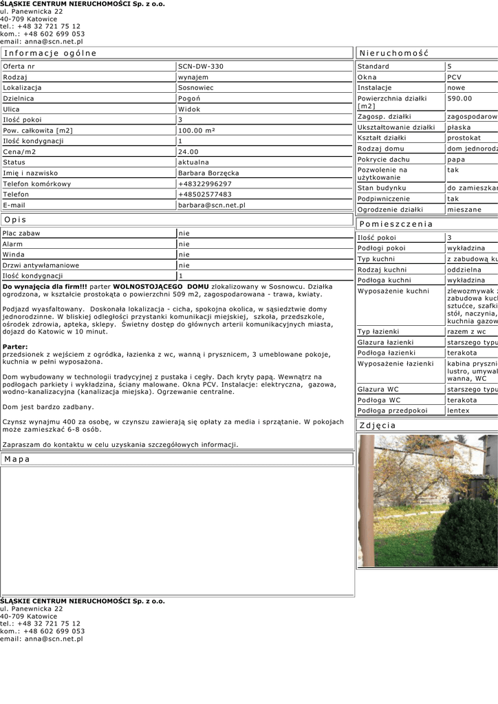 ŚLĄSKIE CENTRUM NIERUCHOMOŚCI Sp. z o.o. ul. Panewnicka 22 40-709 Katowice tel.: +48 32 721 75 12 kom.: +48 602 699 053 email: [email protected] Informacje ogólne Nieruchomość Oferta nr SCN-DW-330 Standard 5 Rodzaj wynajem Okna PCV Lokalizacja Sosnowiec Instalacje nowe Dzielnica Pogoń Widok Powierzchnia działki [m2] 590.00 Ulica Ilość pokoi 3 Zagosp. działki zagospodarowa 100.00 m² Ukształtowanie działki płaska Ilość kondygnacji 1 Kształt działki prostokat Cena/m2 24.00 Rodzaj domu dom jednorodz aktualna Pokrycie dachu papa Imię i nazwisko Barbara Borzęcka Pozwolenie na użytkowanie tak Telefon komórkowy +48322996297 Stan budynku do zamieszkan Telefon +48502577483 Podpiwniczenie tak E-mail [email protected] Ogrodzenie działki mieszane Pow. całkowita [m2] Status Opis Pomieszczenia Plac zabaw nie Alarm nie Winda nie Drzwi antywłamaniowe nie Ilość kondygnacji 1 Ilość pokoi 3 Podłogi pokoi wykładzina Typ kuchni z zabudową ku Rodzaj kuchni oddzielna Podłoga kuchni wykładzina Do wynajęcia dla firm!!! parter WOLNOSTOJĄCEGO DOMU zlokalizowany w Sosnowcu. Działka ogrodzona, w kształcie prostokąta o powierzchni 509 m2, zagospodarowana - trawa, kwiaty. Wyposażenie kuchni Podjazd wyasfaltowany. Doskonała lokalizacja - cicha, spokojna okolica, w sąsiedztwie domy jednorodzinne. W bliskiej odległości przystanki komunikacji miejskiej, szkoła, przedszkole, ośrodek zdrowia, apteka, sklepy. Świetny dostęp do głównych arterii komunikacyjnych miasta, dojazd do Katowic w 10 minut. zlewozmywak z zabudowa kuch sztućce, szafki stół, naczynia, kuchnia gazow Typ łazienki razem z wc Glazura łazienki starszego typu Podłoga łazienki terakota Wyposażenie łazienki kabina prysznic lustro, umywal wanna, WC Glazura WC starszego typu Podłoga WC terakota Podłoga przedpokoi lentex Parter: przedsionek z wejściem z ogródka, łazienka z wc, wanną i prysznicem, 3 umeblowane pokoje, kuchnia w pełni wyposażona. Dom wybudowany w technologii tradycyjnej z pustaka i cegły. Dach kryty papą. Wewnątrz na podłogach parkiety i wykładzina, ściany malowane. Okna PCV. Instalacje: elektryczna, gazowa, wodno-kanalizacyjna (kanalizacja miejska). Ogrzewanie centralne. Dom jest bardzo zadbany. Czynsz wynajmu 400 za osobę, w czynszu zawierają się opłaty za media i sprzątanie. W pokojach może zamieszkać 6-8 osób. Zapraszam do kontaktu w celu uzyskania szczegółowych informacji. Mapa ŚLĄSKIE CENTRUM NIERUCHOMOŚCI Sp. z o.o. ul. Panewnicka 22 40-709 Katowice tel.: +48 32 721 75 12 kom.: +48 602 699 053 email: [email protected] Zdjęcia
