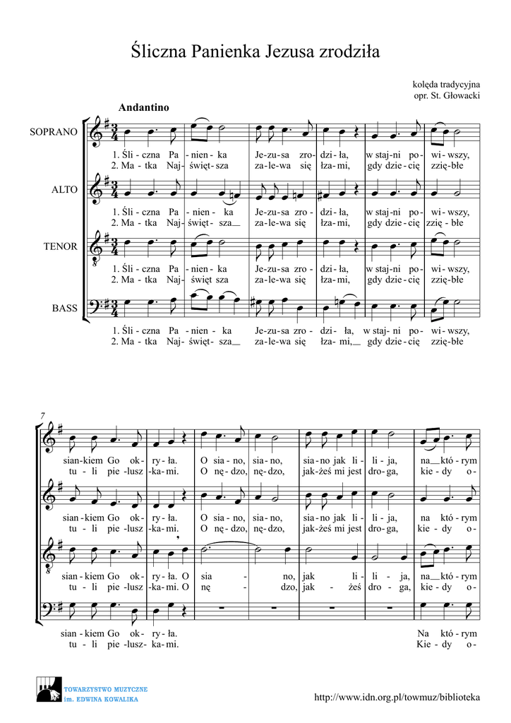Śliczna Panienka Jezusa zrodziła kolęda tradycyjna opr. St. Głowacki ° #3 œ œ˙ & 4 œ œ ™ œJ Andantino SOPRANO ALTO œ œ œ™ œj œ œ Œ œ œ ™ œj œ œ ˙ J J 1. Śli - czna Pa - nien - ka 2. Ma - tka Naj - święt - sza Je - zu - sa zro - dzi - ła, za - le - wa się łza - mi, w staj - ni po - wi - wszy, gdy dzie - cię zzię - błe 1. Śli - czna Pa - nien - ka 2. Ma - tka Naj - święt - sza Je - zu - sa zro - dzi - ła, za - le - wa się łza - mi, w staj -ni po - wi - wszy, gdy dzie - cię zzię - błe 2. Ma - tka Naj - święt sza Je - zu - sa zro - dzi - ła, za - le - wa się łza - mi, w staj - ni po - wi - wszy, gdy dzie - cię zzię - błe 1. Śli - czna Pa - nien - ka 2. Ma - tka Naj - święt - sza Je - zu - sa zro - dzi - ła, w staj- ni po - wi - wszy, za - le - wa się łza - mi, gdy dzie - cię zzię - błe #3 j & 4 œ œ™ œ œ j œ nœ œj œj œ nœ #œ œ Œ œ œ ™ œ œ ˙ #3 œ œ ™ œ œ œ ˙ & 4 J ‹ 1. Śli - czna Pa - nien - ka œœœ œ J J œ œ Œ œ œ™ œ œ œ ˙ J œ œ™ œ œ œ œ œ #œ œ œ œ ? # 3 J BASS J J ¢ 4 œ nœ œ œ œ™ œJ œ œ ˙ TENOR ° # j œ œ™ œj œ ˙ & œJ œJ œ™ œ œ œ Œ 7 œ œ œ œ œ ˙ J J œ œ œ ™ œJ œ œ œ œ œ ˙ J J j œ œ™ œ sian - kiem Go ok - ry - ła. tu - li pie -lusz -ka- mi. O sia - no, sia - no, O nę - dzo, nę- dzo, sia - no jak li - li - ja, jak - żeś mi jest dro - ga, sian - kiem Go ok - ry - ła. tu - li pie -lusz -ka- mi. O sia - no, sia - no, O nę - dzo, nę- dzo, sia - no jak li - li - ja, jak - żeś mi jest dro - ga, # j j j & œ œ œ ™ œj œ œ Œ œ œ™ œ œ ˙ # œ œ œ™ j œ , œ ˙ ™ œ œ & J J ‹ sian - kiem Go ok - ry - ła. O sia tu - li pie -lusz -ka- mi. O ? # œ œ œ™ œ œ œ Œ J J ¢ J sian - kiem Go ok - ry - ła. tu - li pie -lusz - ka- mi. nę ˙ ∑ - ∑ œ ˙ no, jak dzo, jak œ ˙ - ∑ na któ - rym kie - dy o- na któ - rym kie - dy o- œ™ œ œ œœ J li - li - ja, na któ - rym żeś dro - ga, kie - dy o- ∑ œ œ™ œ J Na któ - rym Kie - dy o- http://www.idn.org.pl/towmuz/biblioteka ° #œœ˙ & 2 14 # œ œ œ™ j œ J J œ Œ œ kła - dzie sła - niasz & œ œ œ œ™ j œ œ œ œ ˙™ J J ˙ ∑ œ œ ˙ Je - zu - sa Ma- ry - ja. O Sy - na Stwór - cy Bo - ga. O sia nę sła - niasz Sy - na Stwór Bo - ga. O sia - no, sia - no, O nę - dzo, nę - dzo, sia - no jak li jak - żeś mi jest kła - dzie sła - niasz Je - zu - sa Ma - ry - ja. Sy - na Stwór- cy Bo - ga. O sia - no, sia - no, O nę - dzo, nę - dzo, sia - no jak li jak - żeś mi jest ° # & 20 cy j œ œœ œ J œ œ œ™ ∑ - œ œ Œ - ˙ kła - dzie sła - niasz ?# œ œ ˙ ¢ & ˙ li dro - #œ ˙ li - ja, dro - ga, ?# œ ˙ li - ja, dro - ga, œ ja, ga, œ œ™ ˙ œ œ™ œ œ ˙ J œ na któ - rym kła - dzie kie - dy o - sła - niasz li żeś œ œ œ œ J J œ œ œ œ J J œ œ œ™ J J j œ œ ˙ œ œ œ™ J J j œ œ ˙ Je - zu - sa Ma - ry - ja. Sy - na Stwór - cy Bo - ga. œ œ œ œ jœ œ œ œ œ œ J J œ na któ - rym kła - dzie Je - zu kie - dy o - sła - niasz Sy - na - Je - zu - sa Ma - ry - ja. Sy - na Stwór - cy Bo - ga. na któ - rym kła - dzie kie - dy o - sła - niasz œ œ œ™ no, jak dzo, jak œ œ™ œ œ ˙ J œ œ œ ˙ J j œ œ - œ œ™ œj œ ˙ Na któ - rym kła - dzie Kie - dy o - sła - niasz # ¢ ∑ Je - zu - sa Ma- ry - ja. Sy - na Stwór - cy Bo - ga. #œ jœ œ œ œ œ œ œ œ Œ œ œ & J œ ‹ kła - dzie Je - zu - sa Ma - ry - ja. & ‹ ∑ - sa Stwór - œ ˙ Ma - ry - ja. cy Bo - ga. j œ œ œ œ J œ ˙ Je - zu - sa Ma - ry - ja. Sy - na Stwór- cy Bo - ga. http://www.idn.org.pl/towmuz/biblioteka